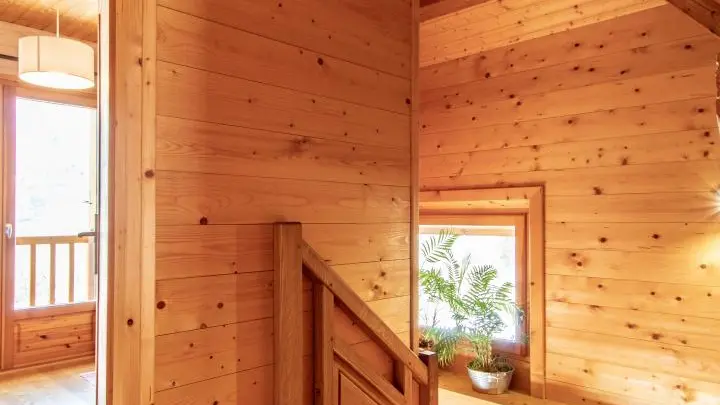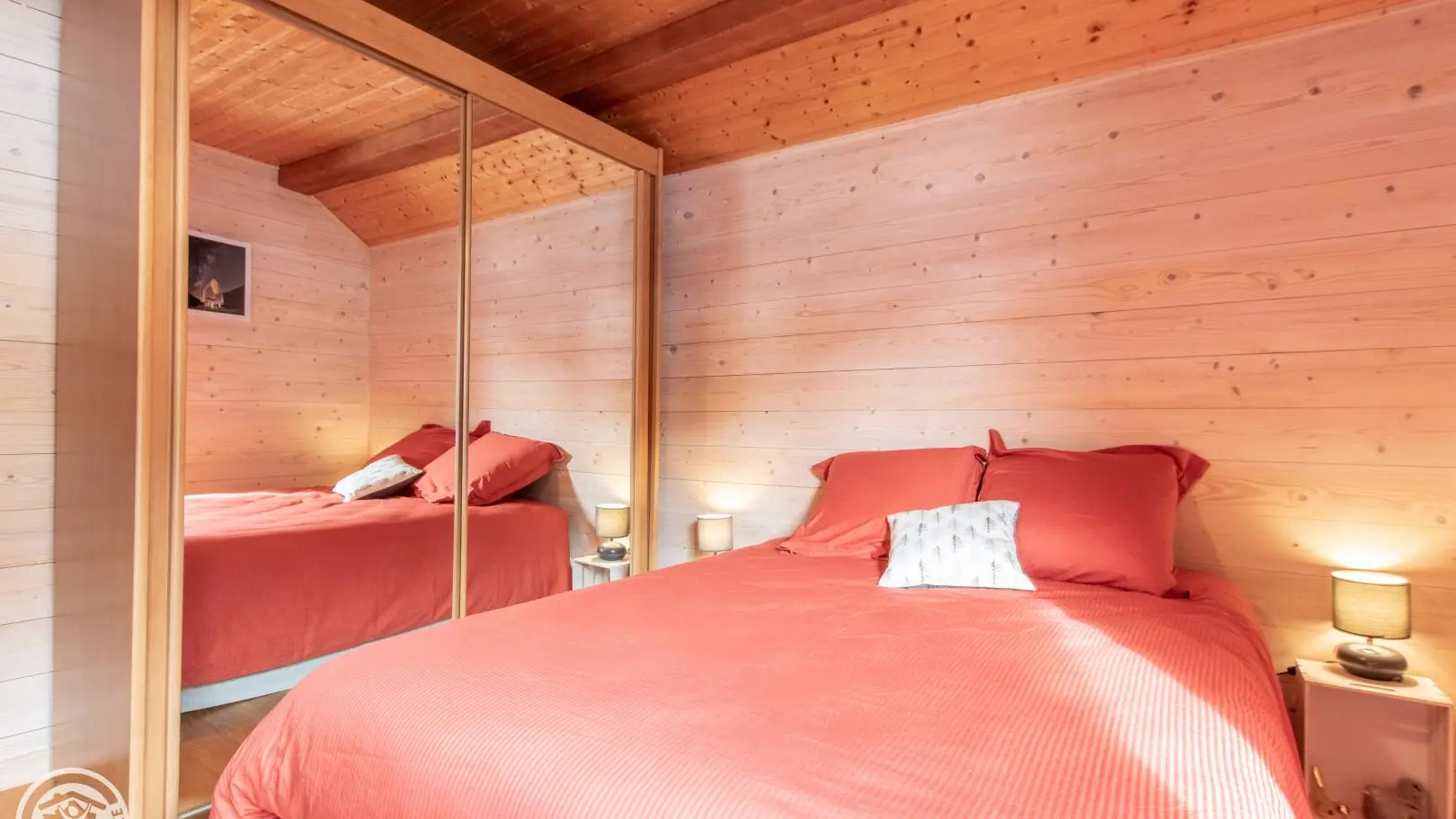 Escalier intérieur pour accéder aux chambres. Chambre 1 (lit 140x190 cm, canapé clic-clac, armoire/penderie), chambre 2 (2 lits 90x190 cm non jumelables, fauteuil et coin lecture).
