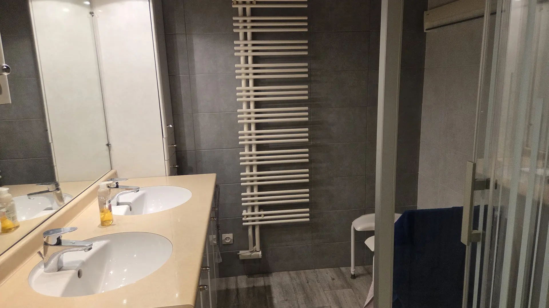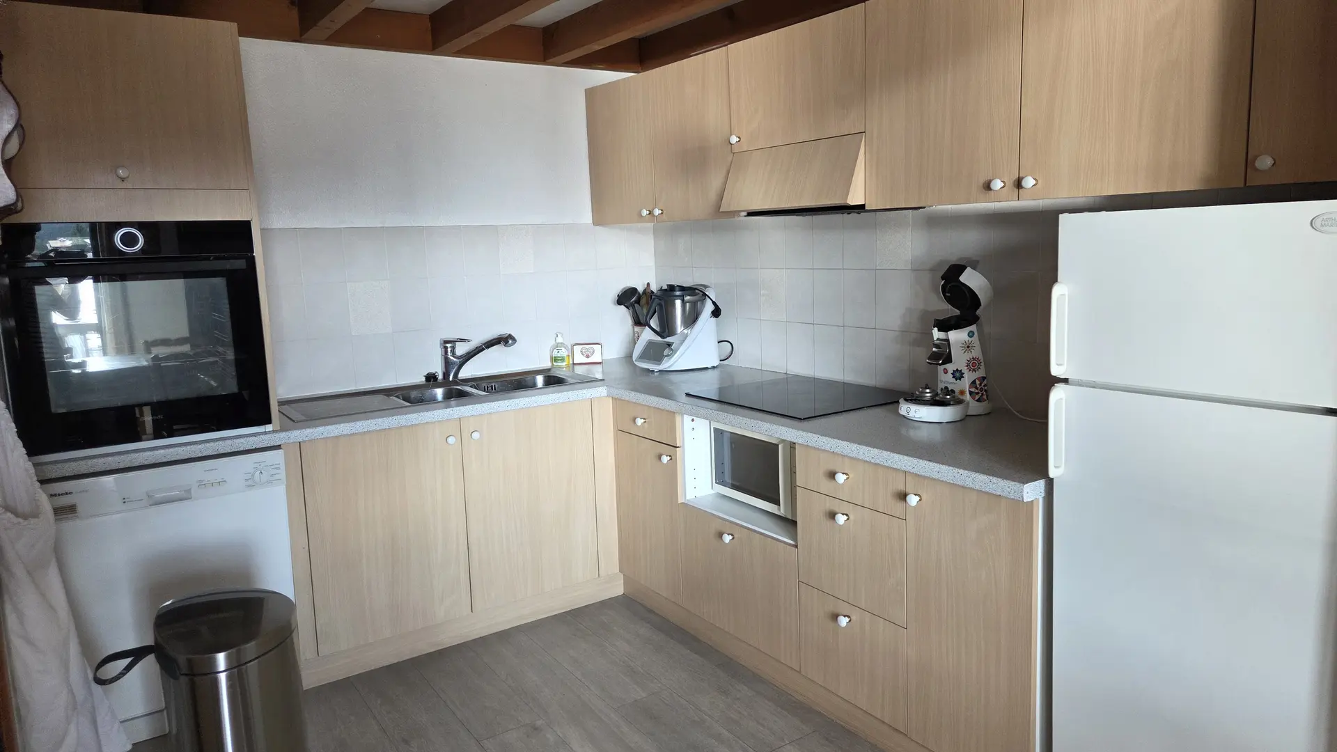 Entrée desservant toilettes indépendantes – salle d’eau (douche et double vasque) avec lave-linge – cuisine aménagée (lave-vaisselle, micro-ondes, combiné congélateur, cafetière filtre + Nespresso + Senseo) ouverte sur le séjour, puis le salon avec canapé, 2 fauteuils et télévision.