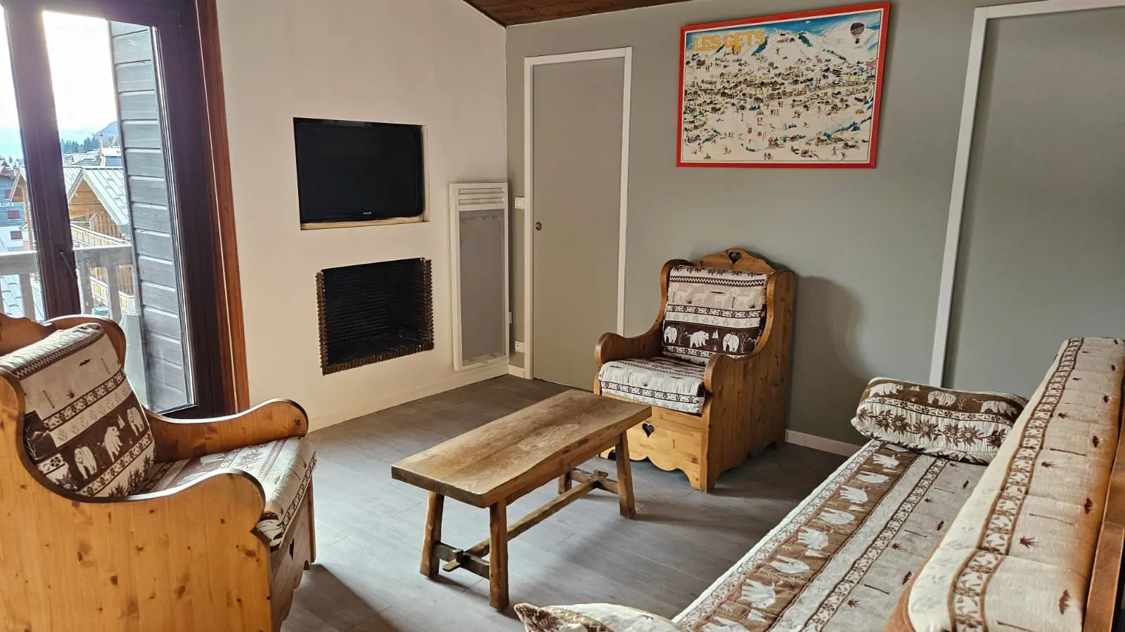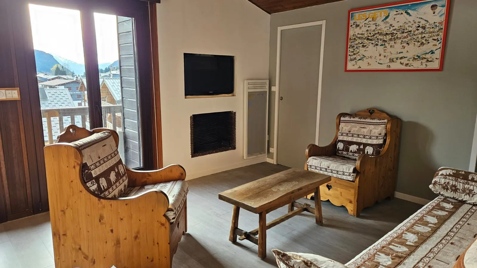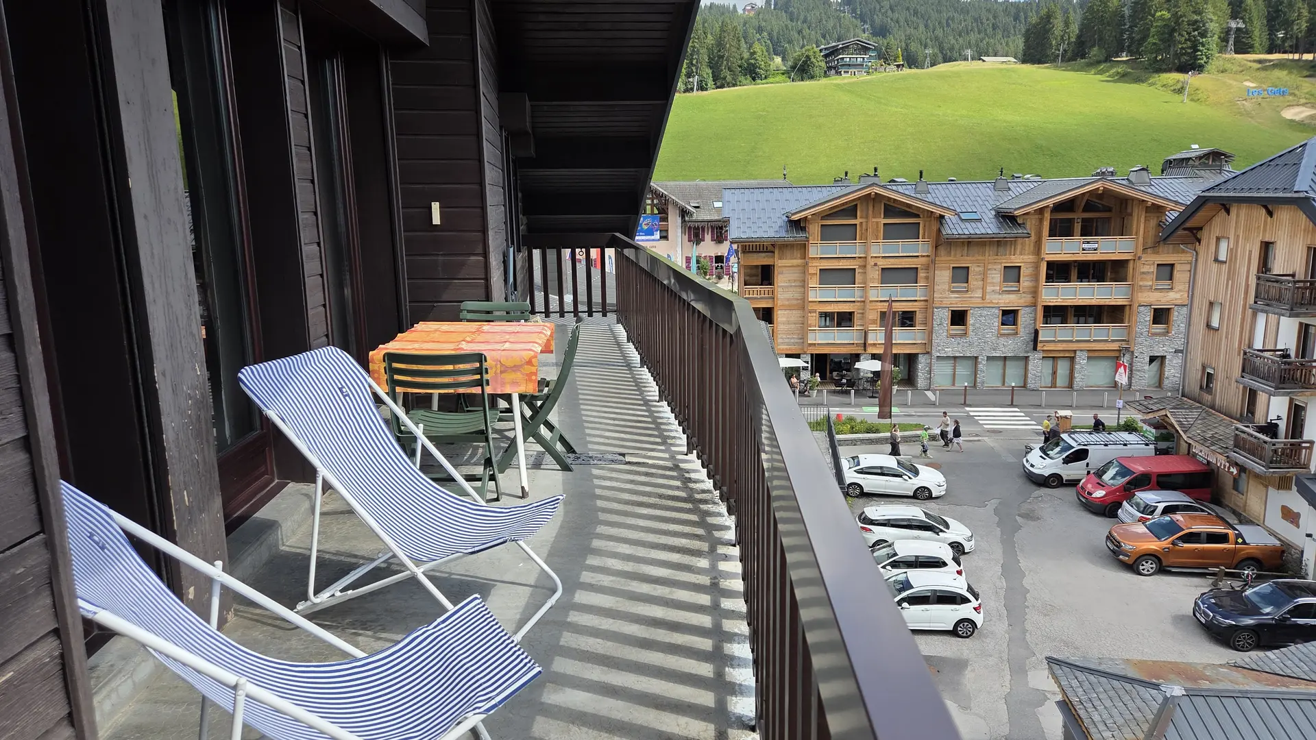 Baies vitrées donnant sur un grand balcon avec vue sur le village et les pistes de ski vers le massif des Chavannes. Table, chaises de jardin et transats.