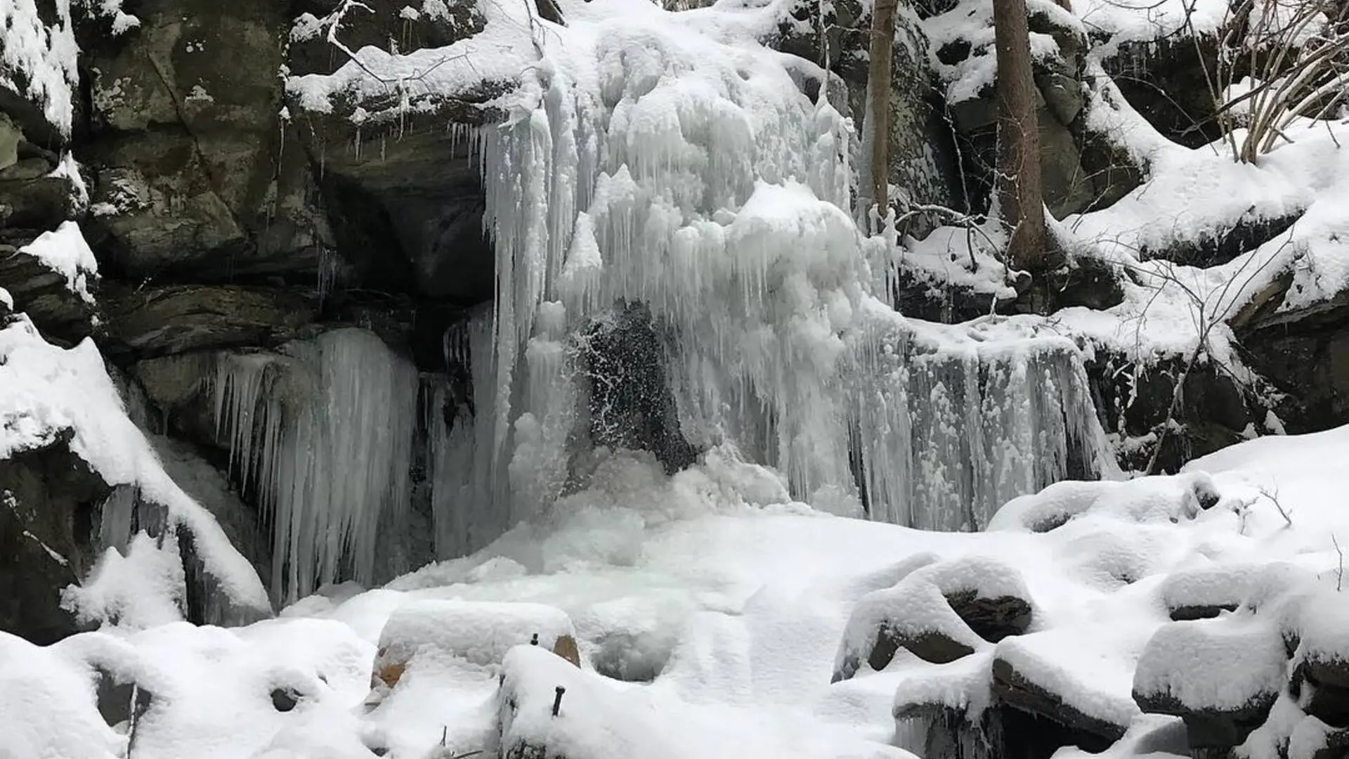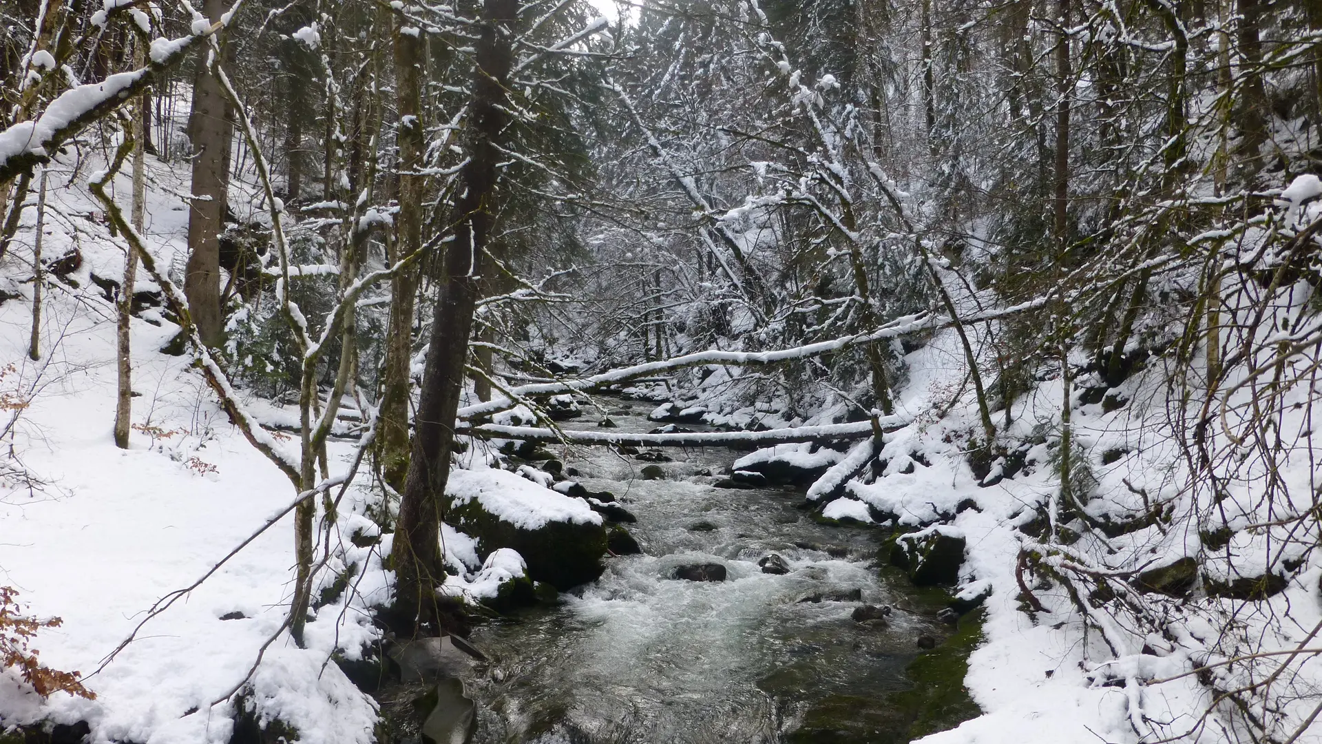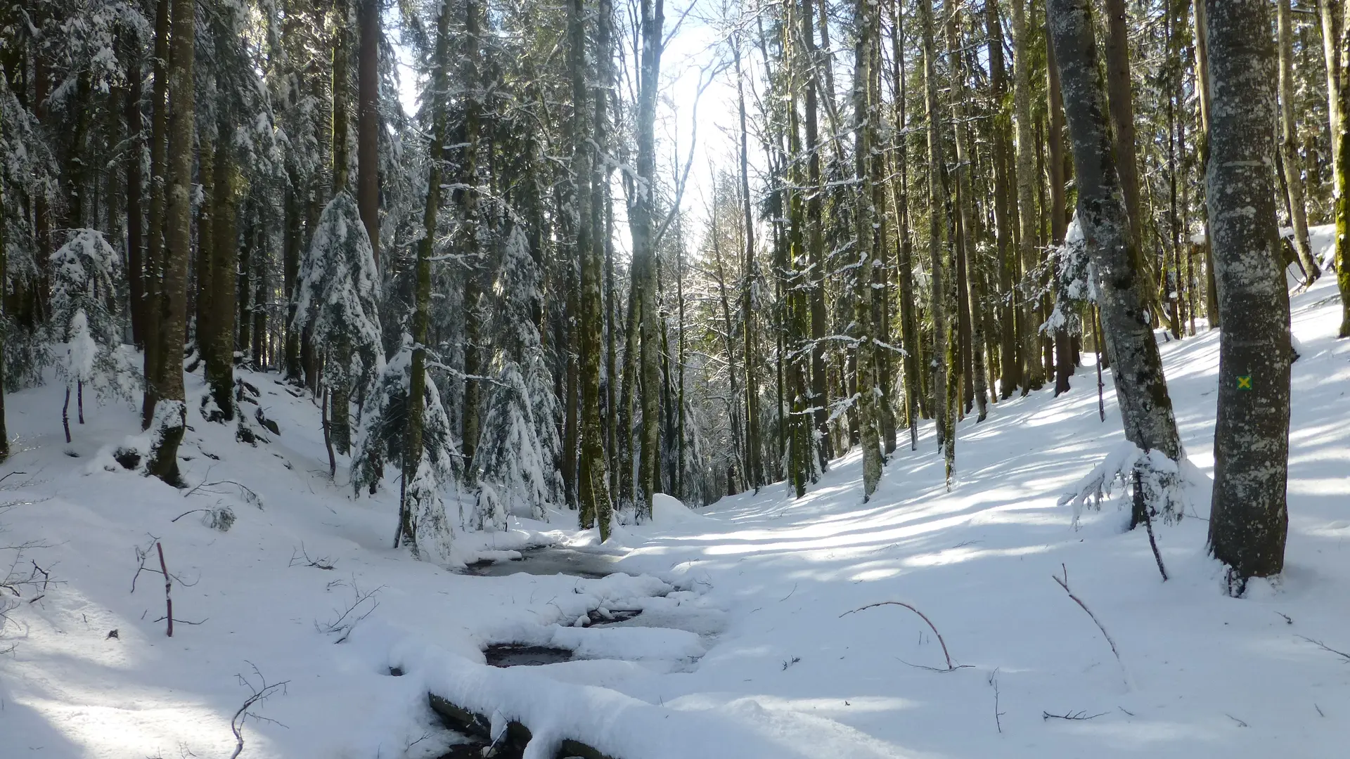 Un circuit raquettes en sous-bois au milieu des sapins enneigés.