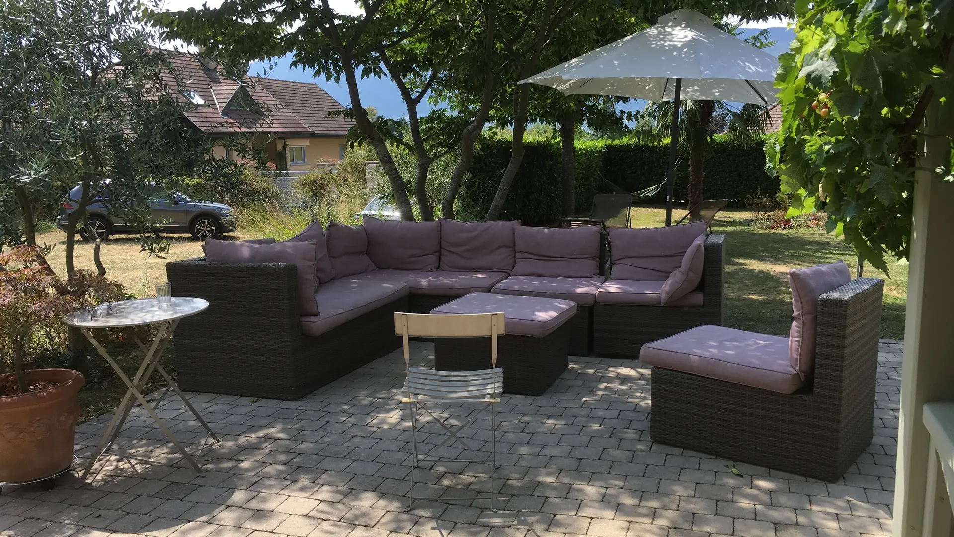 Terrasse de plain pied avec le séjour et la cuisine, rendant les repas très agréables, si la saison s'y prête. Salon de jardin avec canapés d'extérieurs.