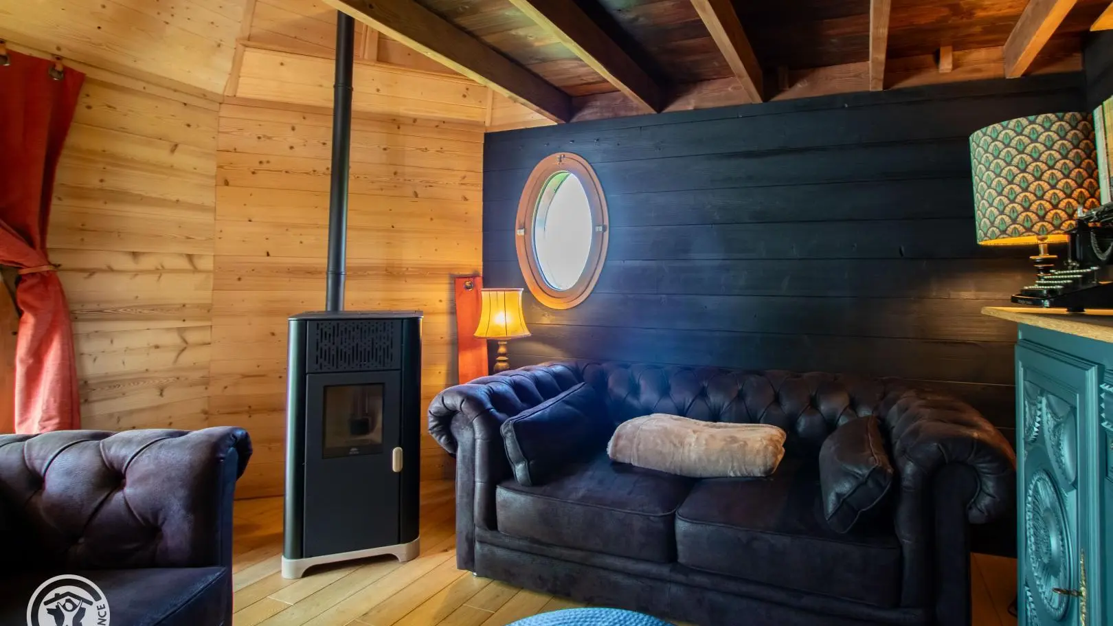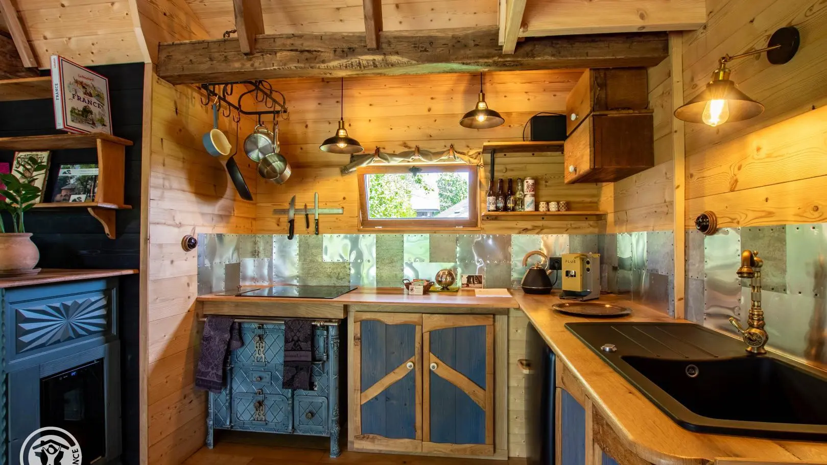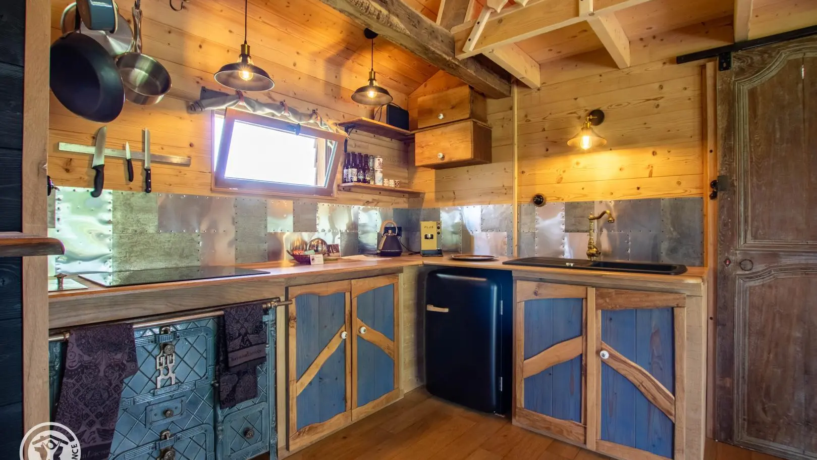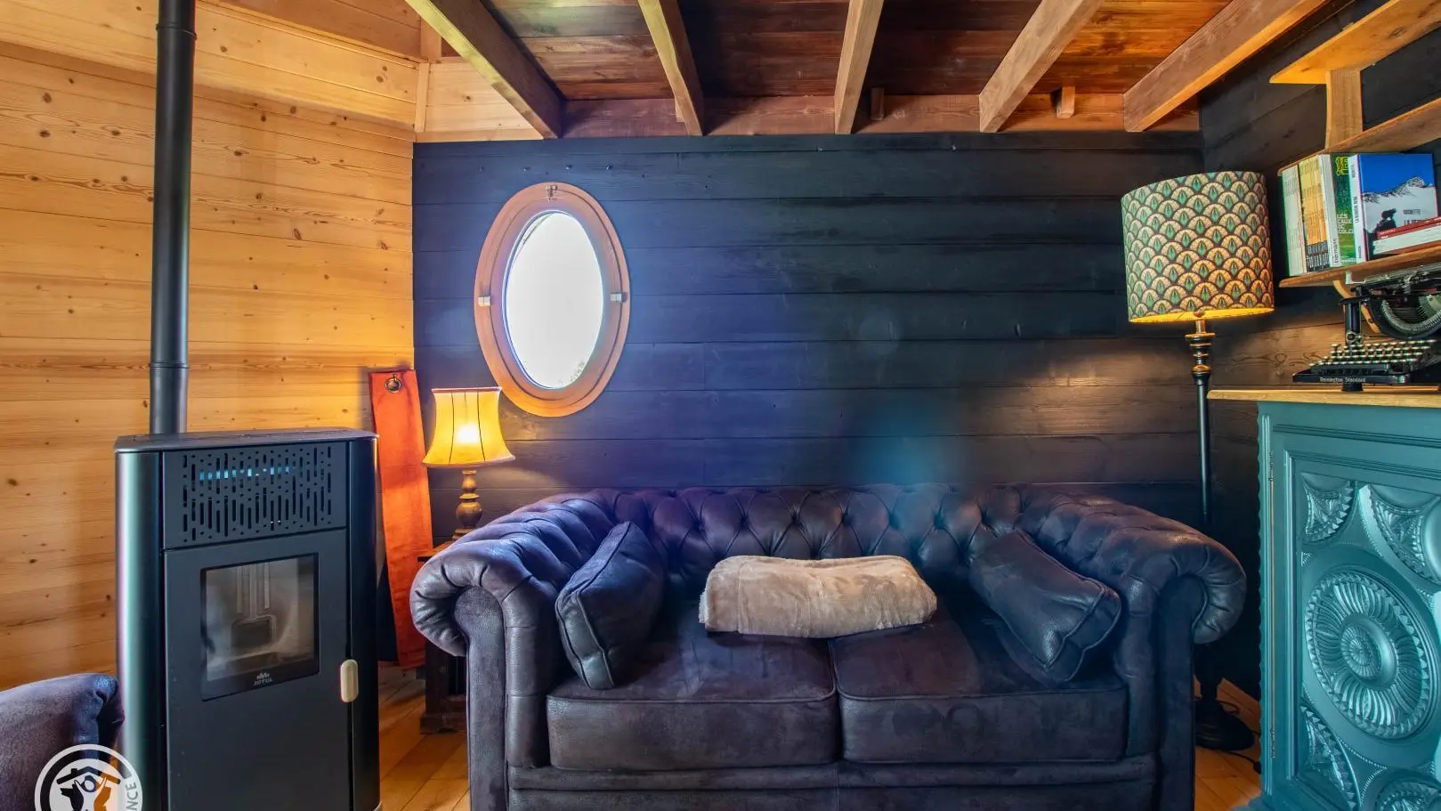 Gîte de 31 m² sur deux niveaux dans un chalet en bois à l'esprit cabane. Pièce de vie au rez-de-terrasse composée d'une cuisine ouverte sur séjour avec table de repas et d'un salon cosy avec poêle à granulés, petite bibliothèque et enceinte connectée. Salle d'eau (douche) et WC indépendant.