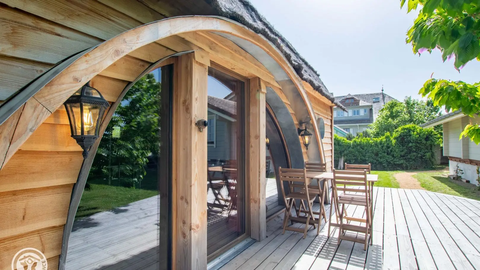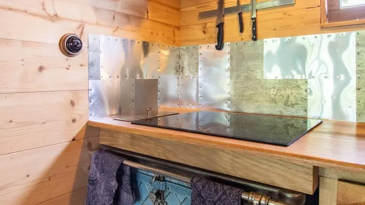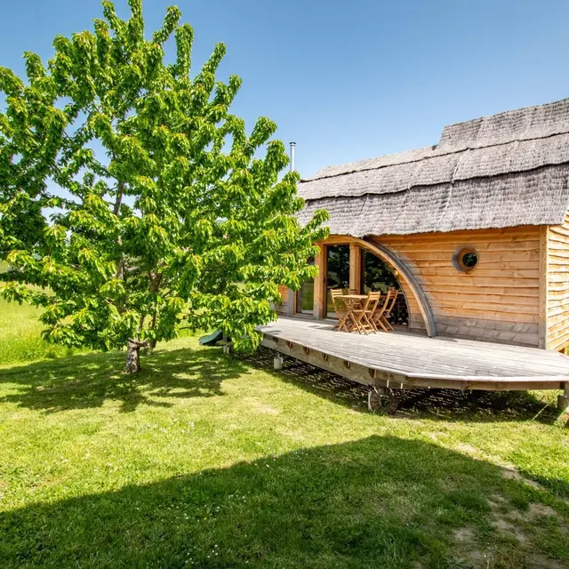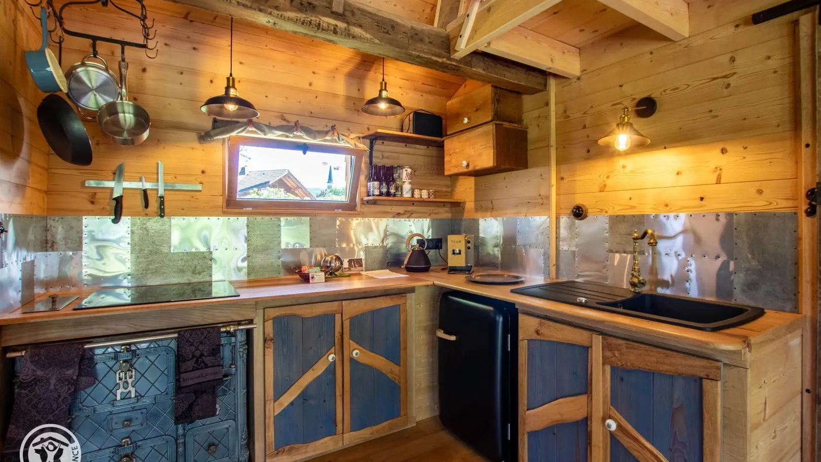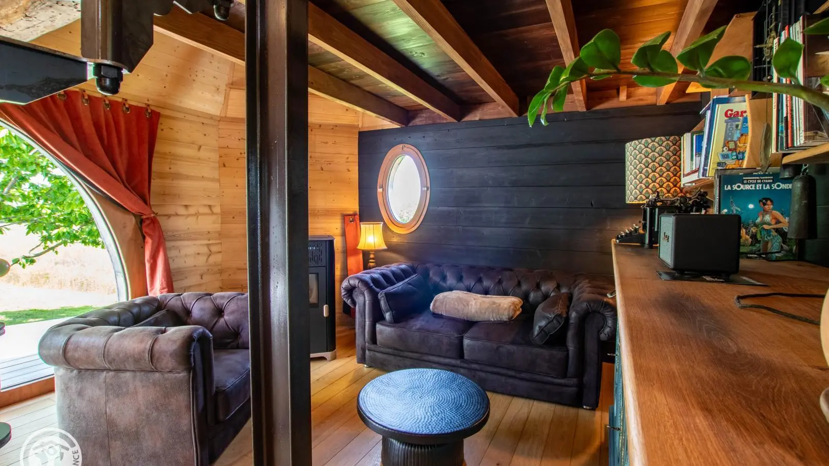 Gîte de 31 m² sur deux niveaux dans un chalet en bois à l'esprit cabane. Pièce de vie au rez-de-terrasse composée d'une cuisine ouverte sur séjour avec table de repas et d'un salon cosy avec poêle à granulés, petite bibliothèque et enceinte connectée. Salle d'eau (douche) et WC indépendant.