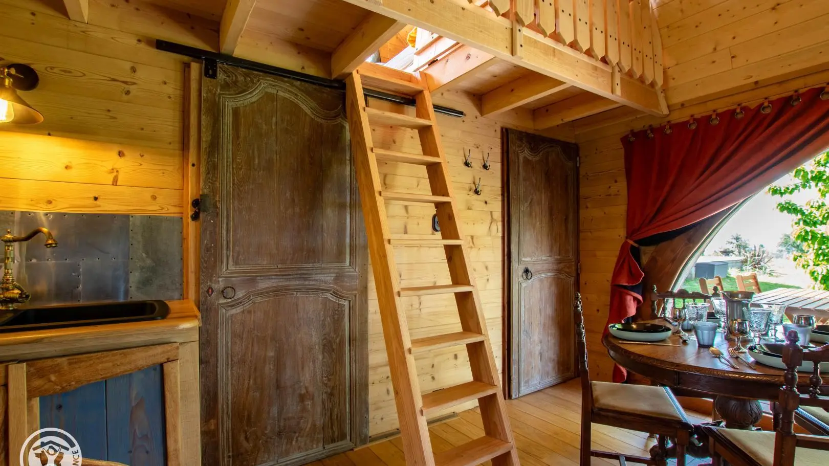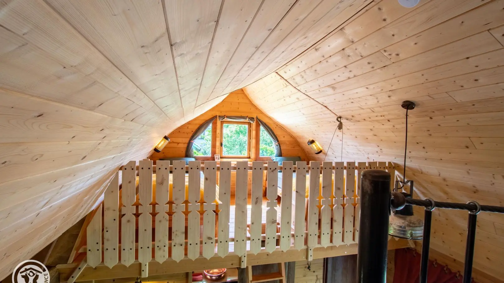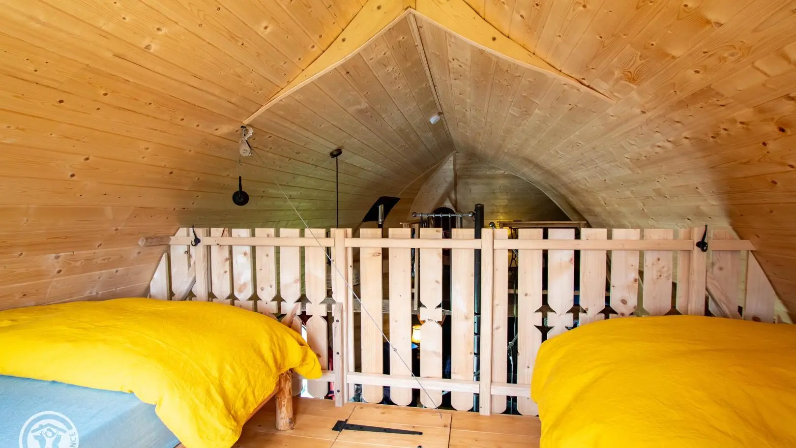 Accès à la chambre principale par un escalier en colimaçons étroit (mezzanine ouverte, lit 160x200 cm). Accès à la seconde chambre par une échelle et une trappe de sécurité (mezzanine ouverte avec deux lits 90x200 non rapprochables).
