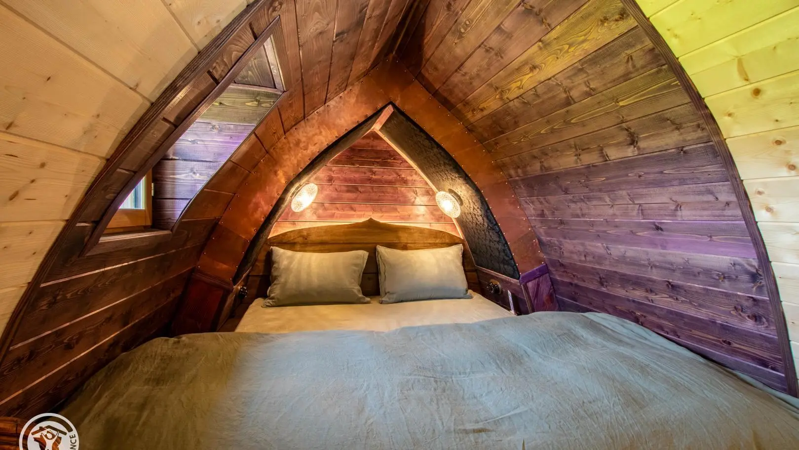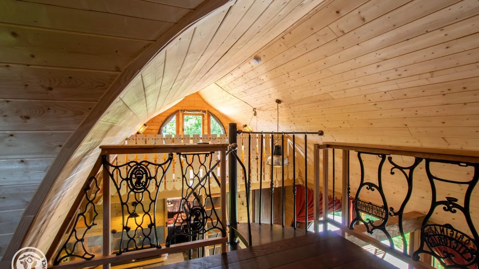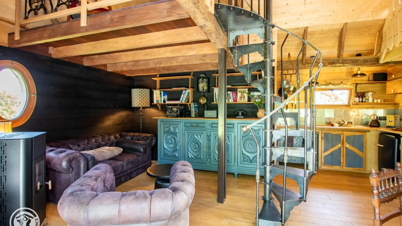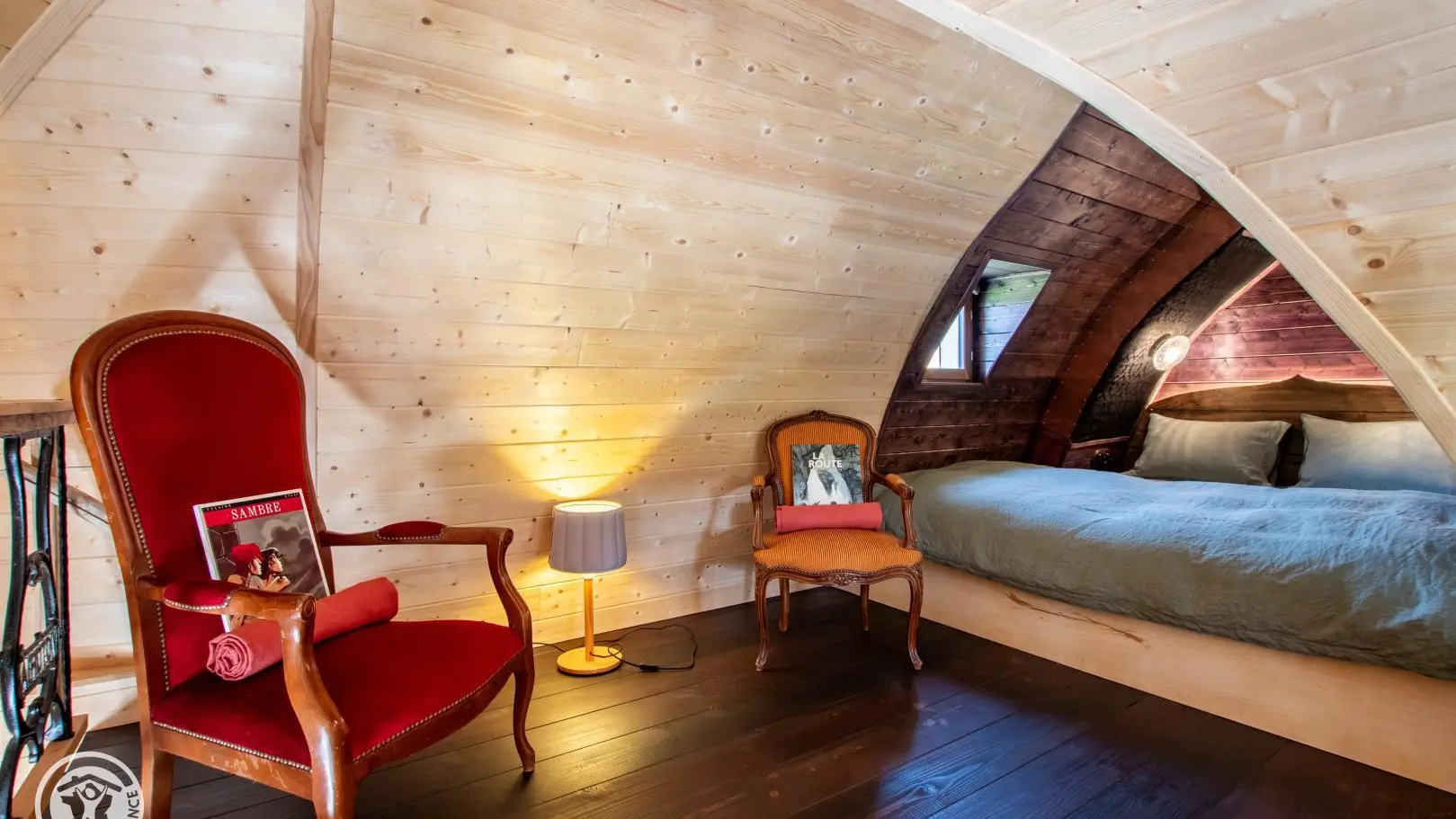 Accès à la chambre principale par un escalier en colimaçons étroit (mezzanine ouverte, lit 160x200 cm). Accès à la seconde chambre par une échelle et une trappe de sécurité (mezzanine ouverte avec deux lits 90x200 non rapprochables).