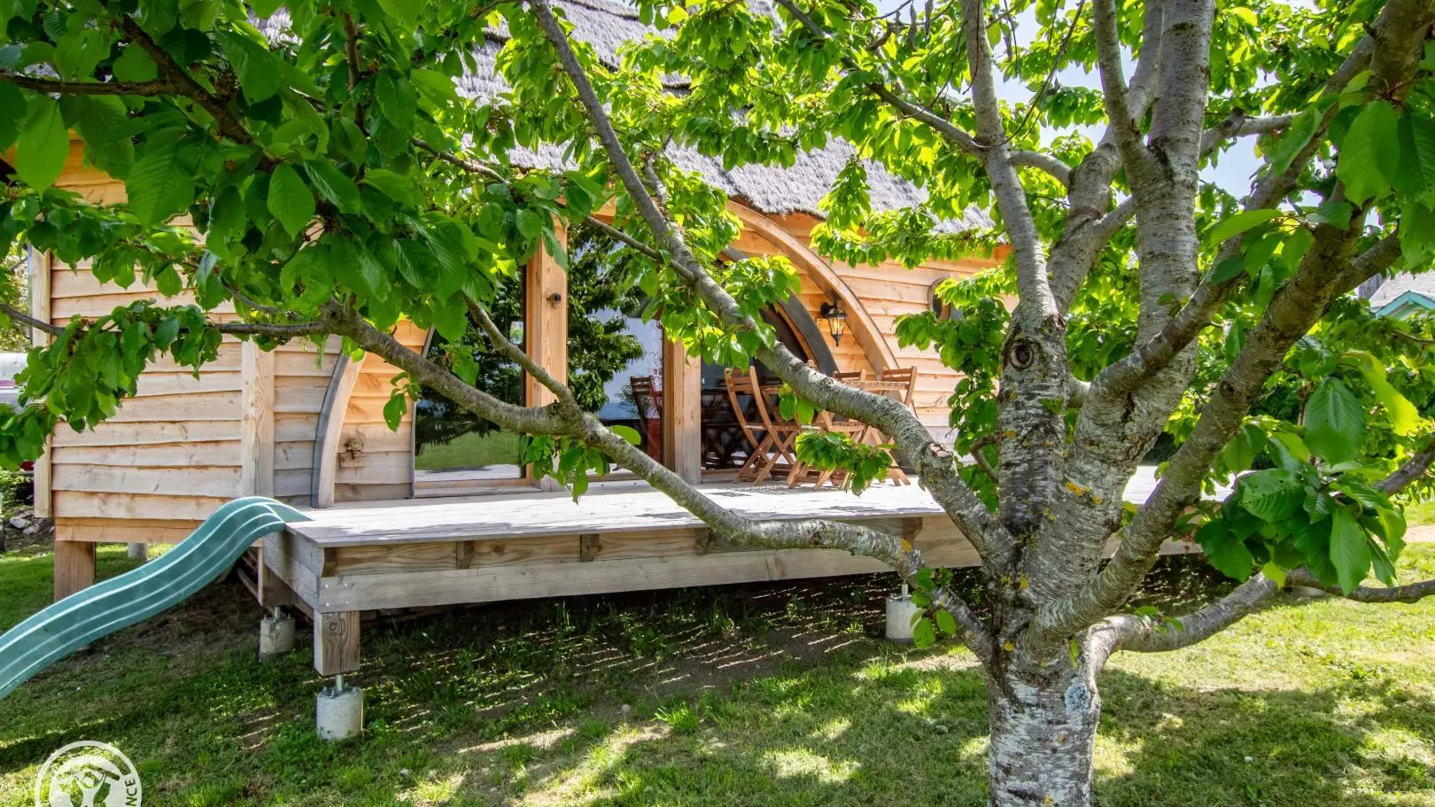 Large terrasse de plain-pied avec le gîte avec table extérieure. Accès par un escalier (4 marches). Petit toboggan (sous surveillance d'un adulte). Espace vert accessible.