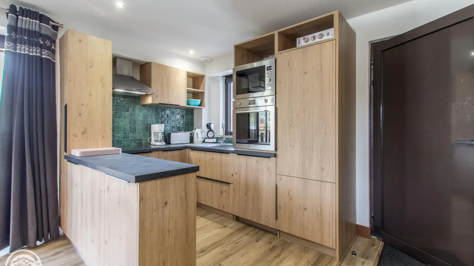 Cuisine intégrée ouvert sur séjour (Tv, banquette-lit gigogne offrant 2 couchages d'appoint 80x190cm jumelables).