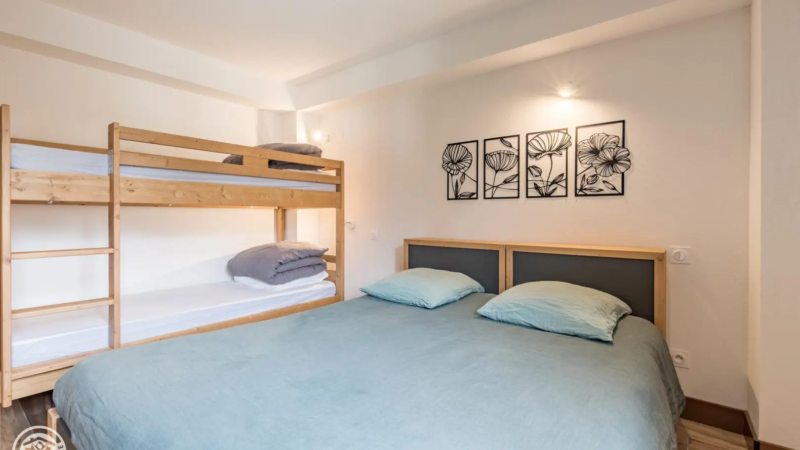 Chambre 1 (2 lits 80x200cm jumelables en lit 160cm + 2 lits 90x190cm superposés), chambre 2 (2 lits 80x200cm jumelables en lit 160cm + 2 lits 90x190cm superposés), chambre 3 (1 lit 140x190cm + 2 lits 90x190cm superposés).
