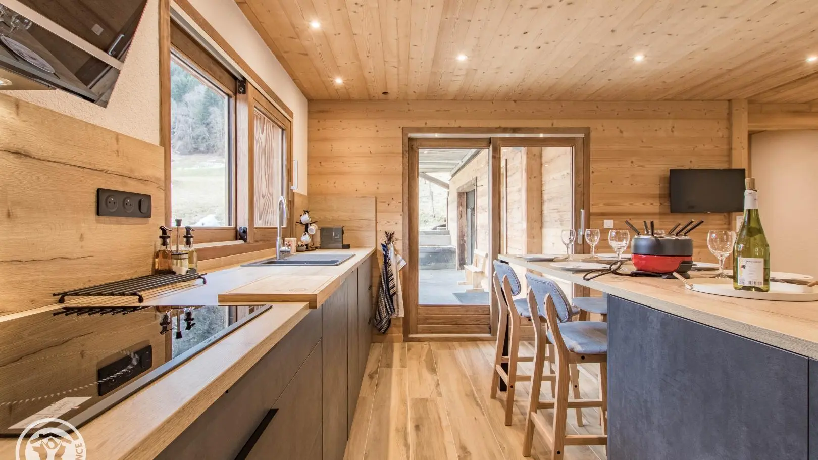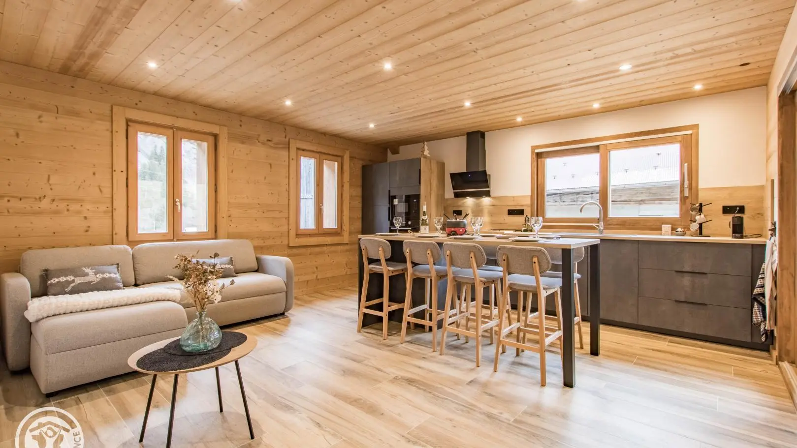 Cuisine intégrée ouverte sur le séjour : repas sur table haute avec tabourets, canapé d'angle, 2 fauteuils, télévision connectée, baie vitrée donnant sur la terrasse.