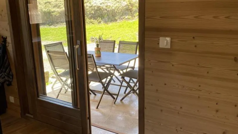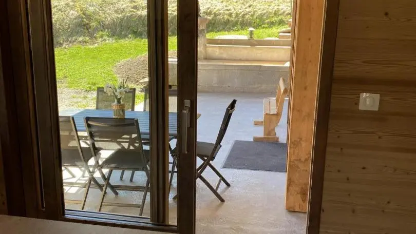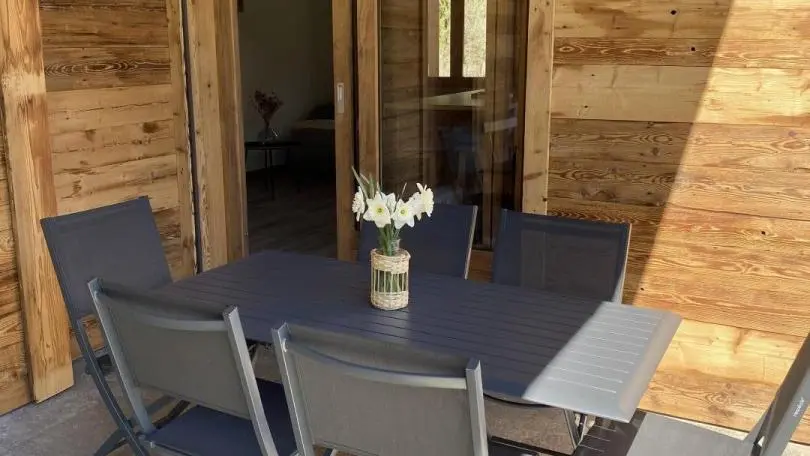 Espace terrasse abritée devant le gîte avec mobilier de jardin, terrain sur l'avant et l'arrière du chalet. Cour devant le gîte pour le stationnement.