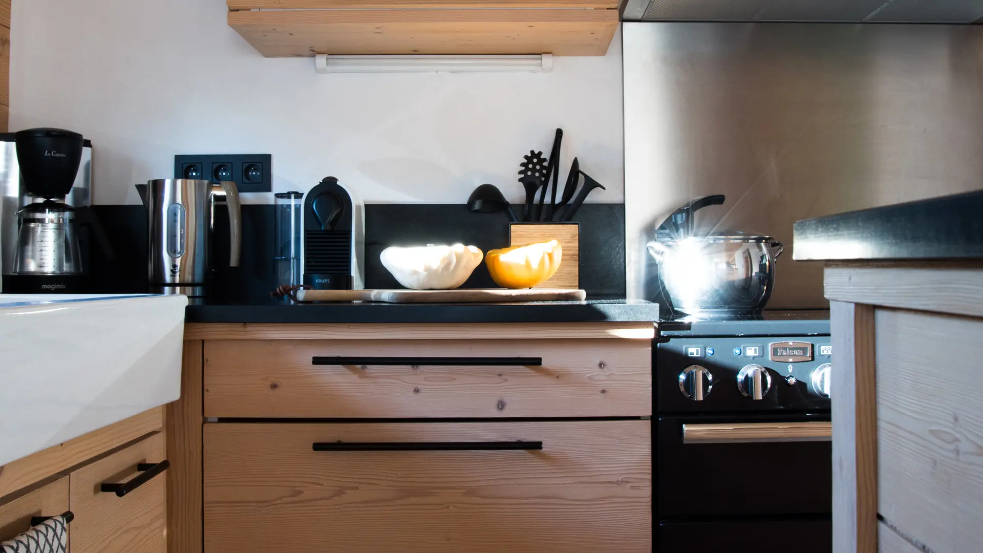 Salon-séjour avec poêle à bois (bois fournis) et cuisine américaine toute équipée (cuisinière semi-pro avec 5 feux induction et 3 fours, micro ondes, lave vaisselle, cafetière nespresso, et cafetière filtre, bouilloire et grille pain, appareils à raclette et fondue...). 1 WC indépendant.