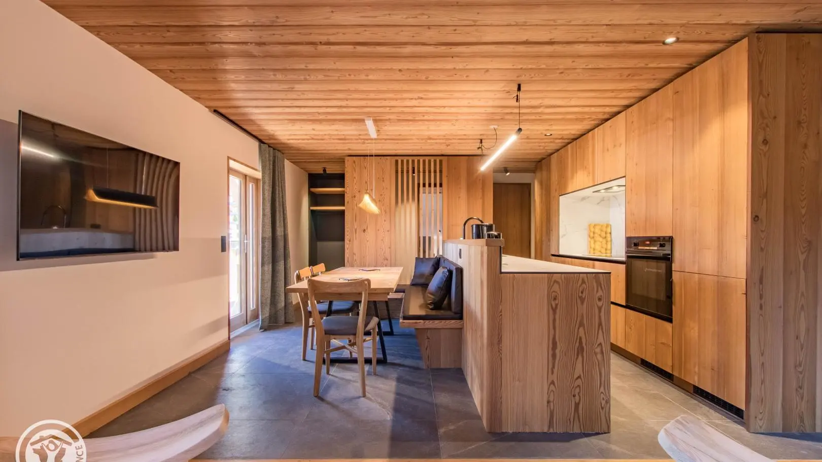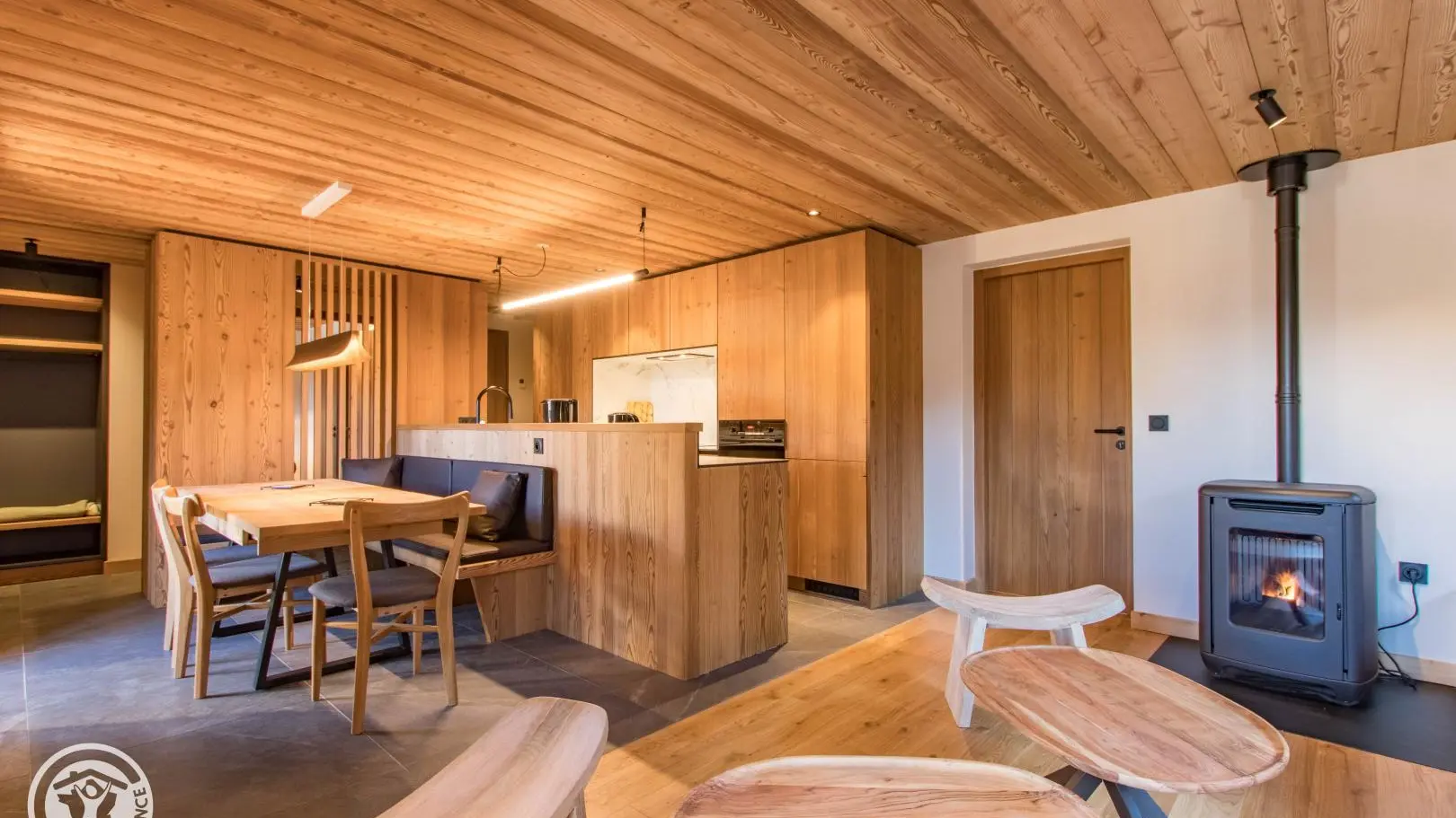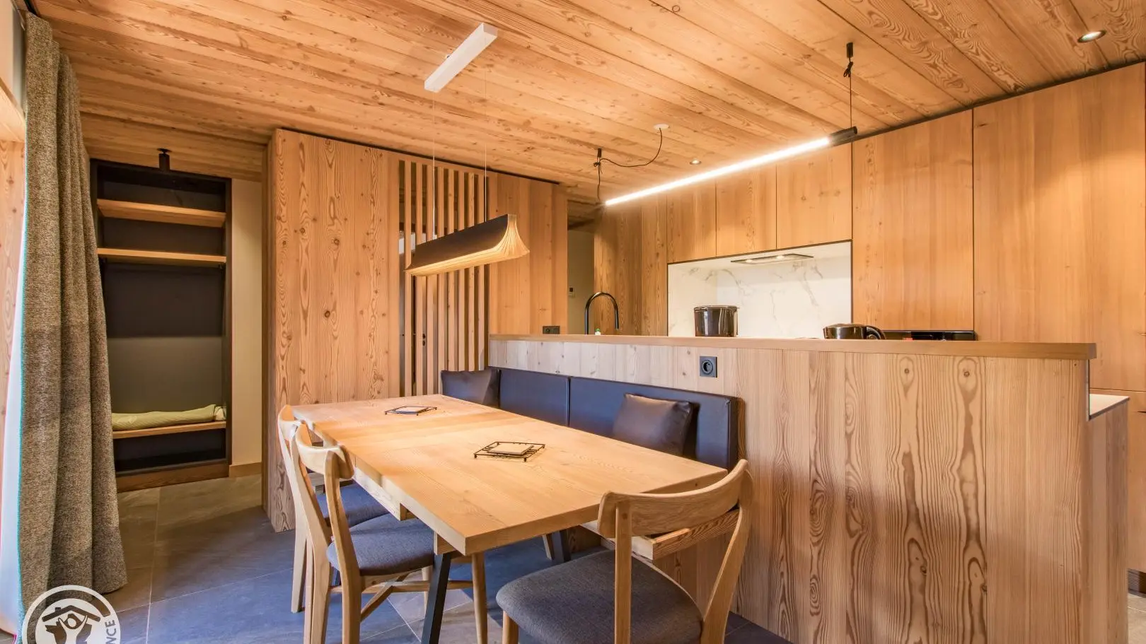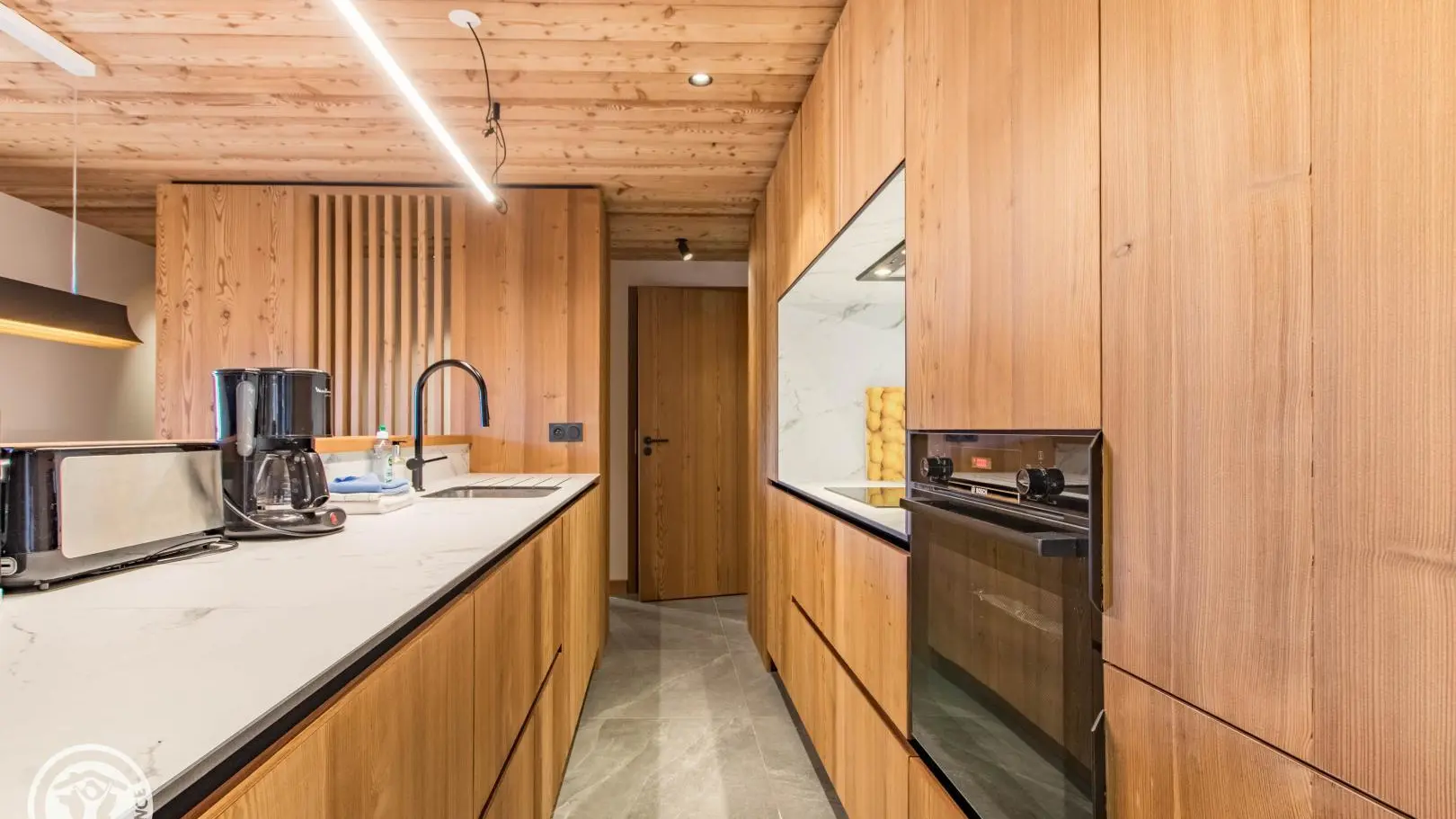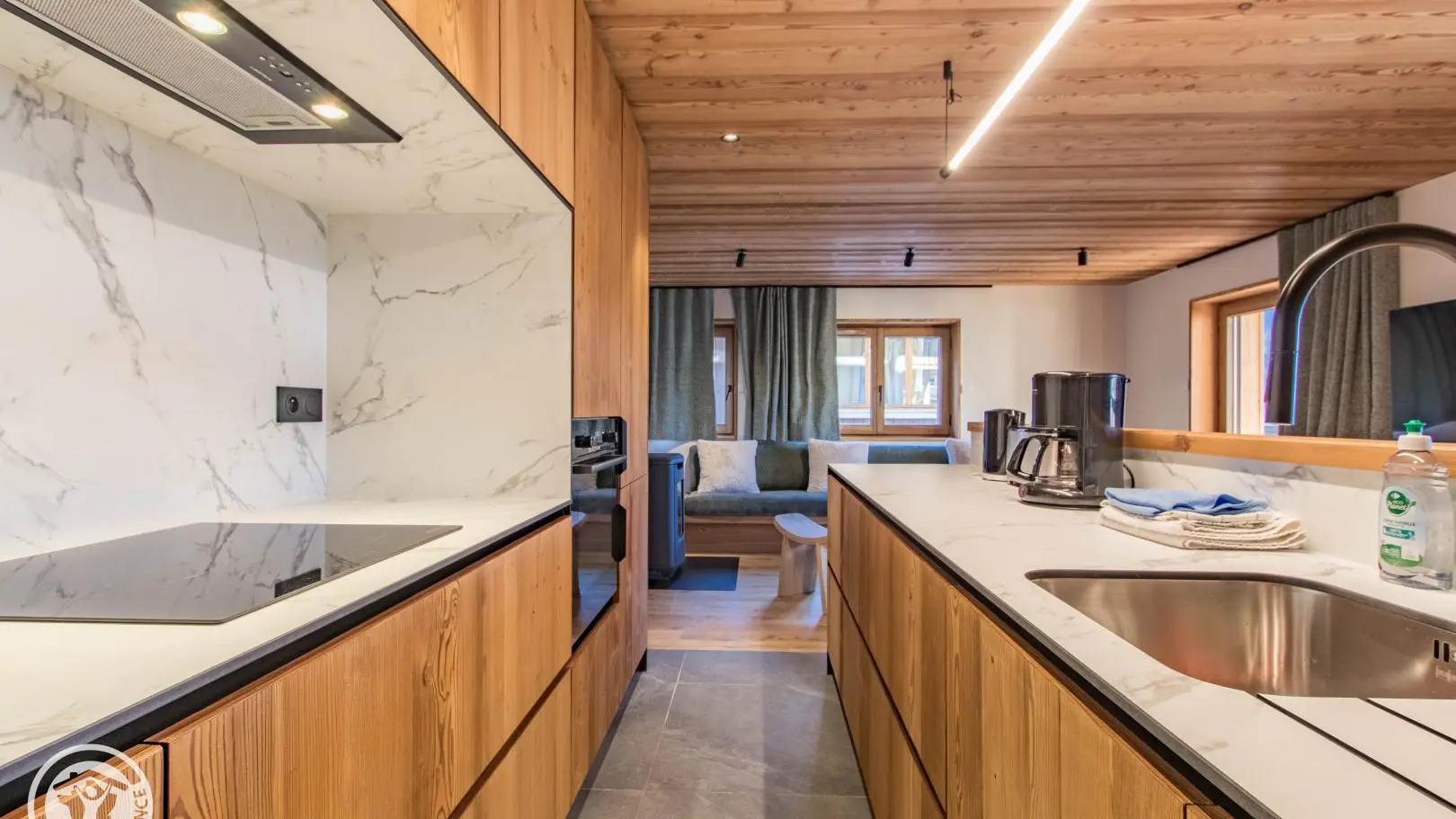 Cuisine équipée ouverte sur le salon. Micro-onde, four, plaques, réfrigérateur, congélateur, lave-vaisselle, cafetière, bouilloire et grille-pain.