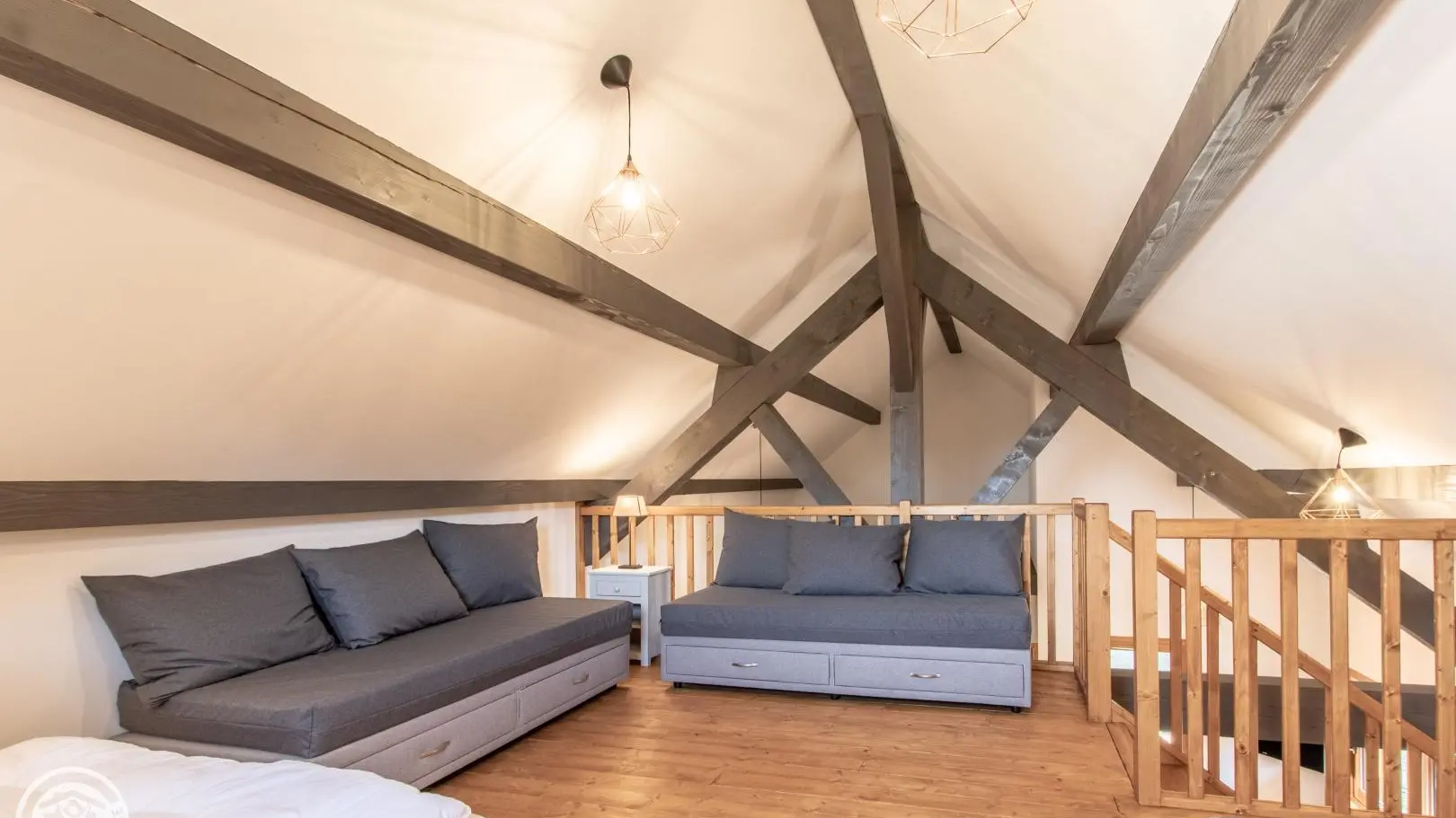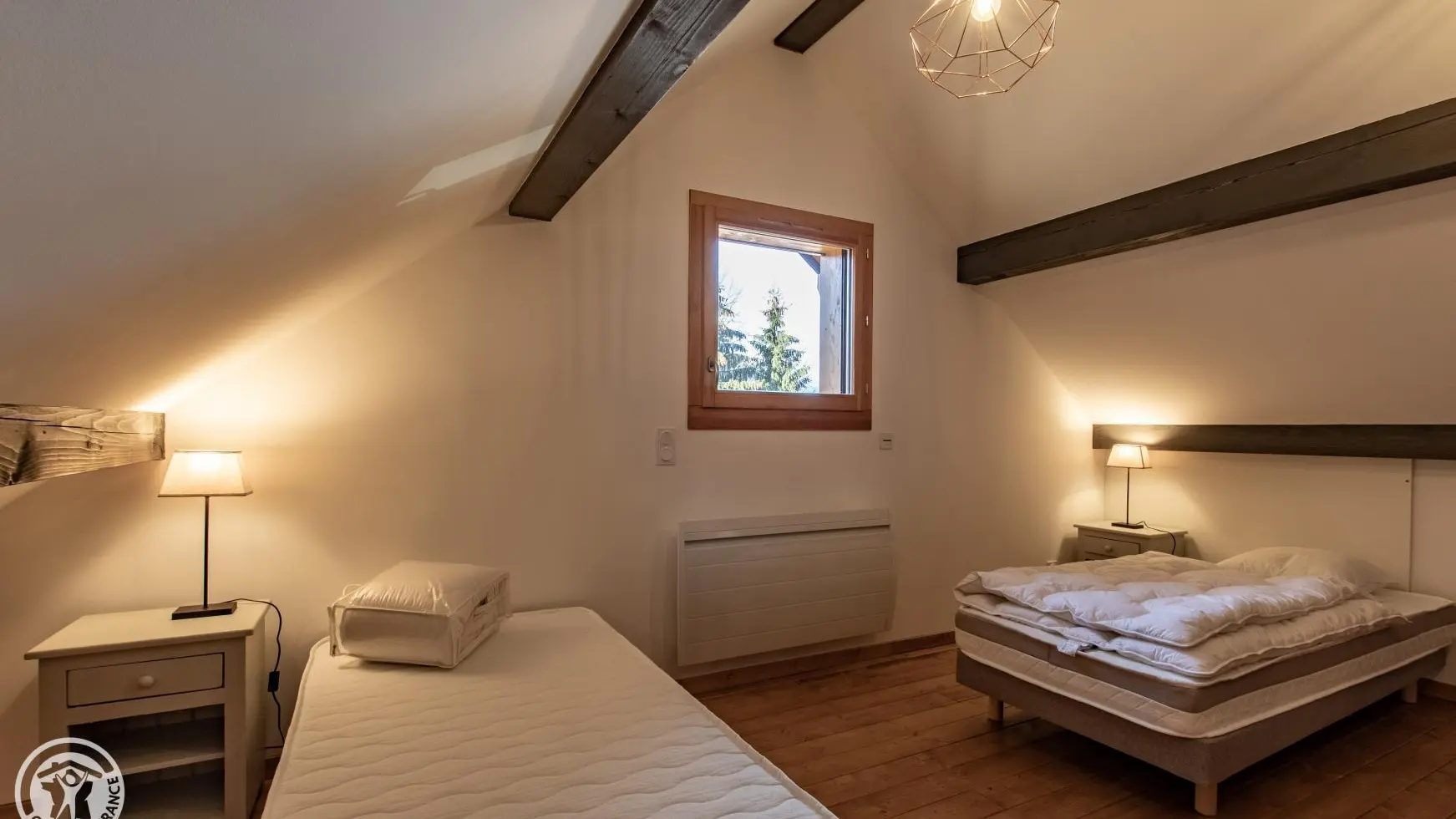 A l'étage (mezzanine mansardée), espace de couchage avec deux lits (90x200 cm jumelables) et deux banquettes (90x200 cm).