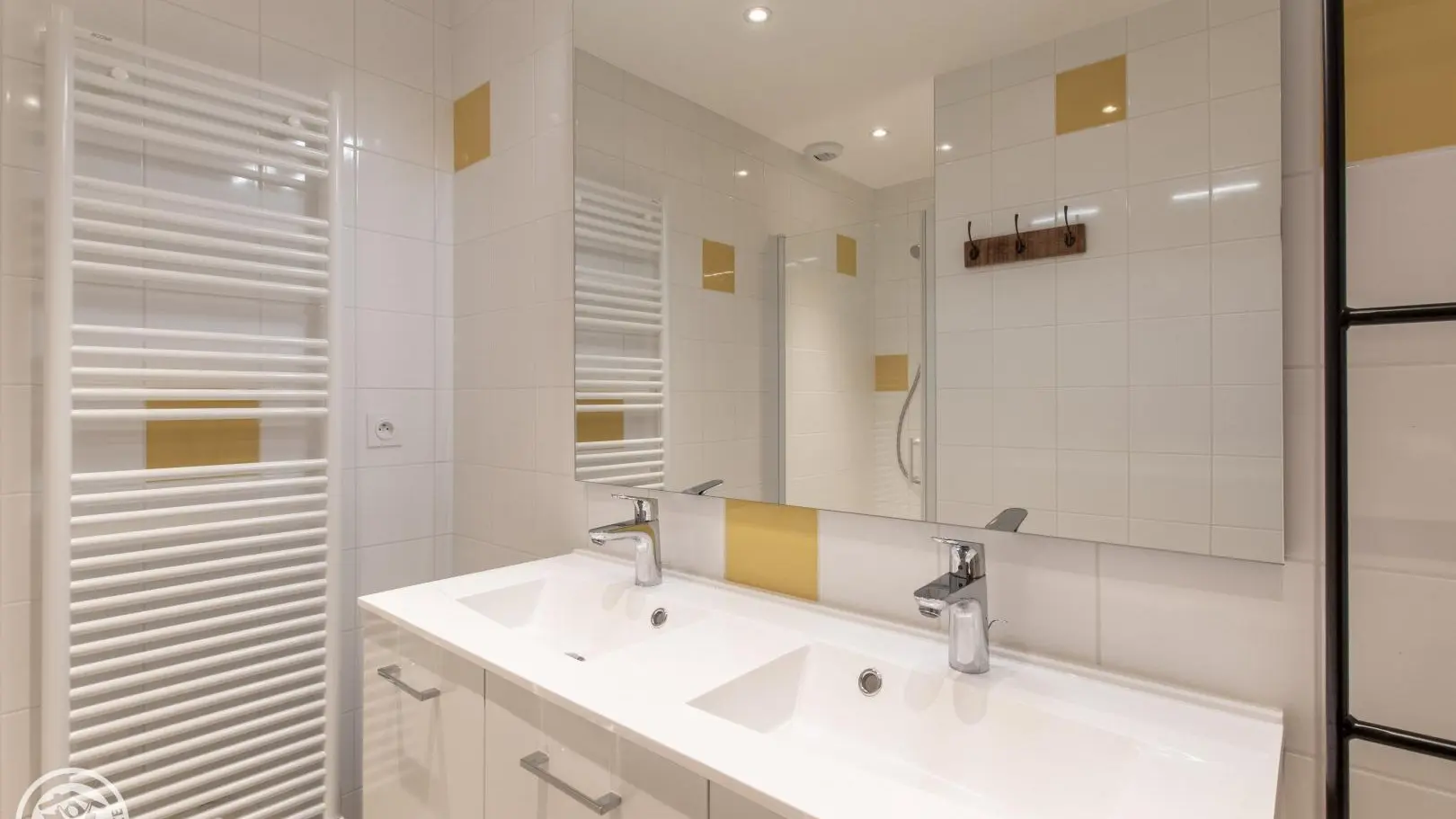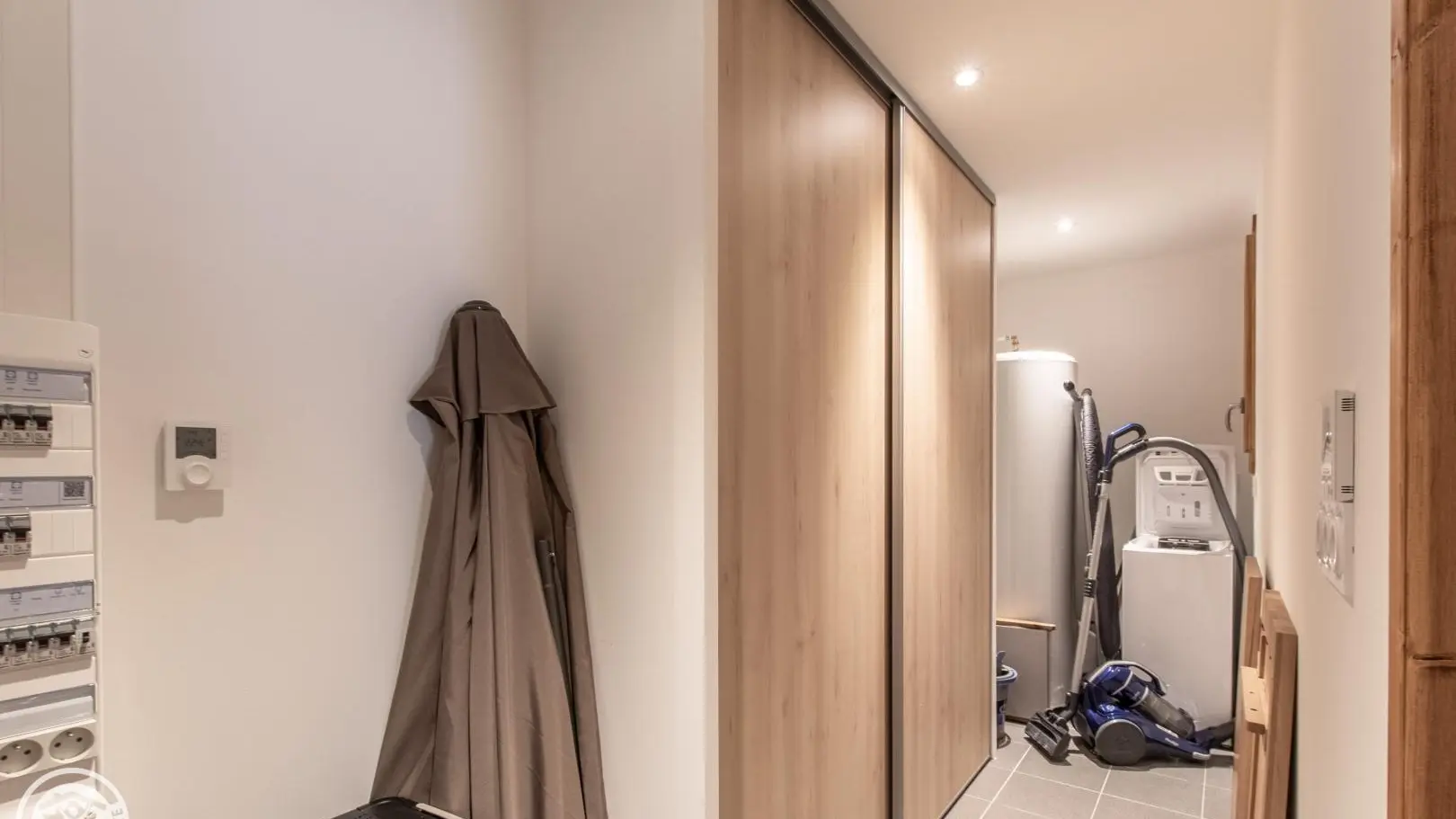Au rez-de-chaussée, cuisine ouverte sur séjour avec espace repas et coin TV avec canapé. Deux chambres (lits 140x190 cm) et salle d'eau avec WC séparés. Buanderie avec lave-linge et rangements.