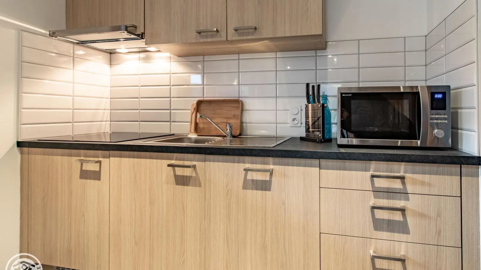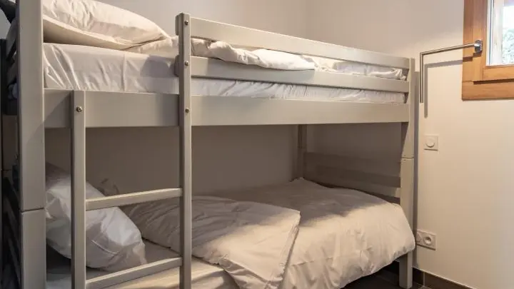 Hébergement de plain pied sur un niveau avec équipements pour personne à mobilité réduite : salle d'eau, fenêtres équipée d'équipement d'aide à la mobilité. Cuisine ouverte sur séjour avec espace repas et coin TV avec canapé. Chambre 1 spacieuse ( lit 140x190 cm) pour accès avec chaise roulante. Chambre 2 (2 lits superposés 90x200 cm). Salle d'eau avec WC.