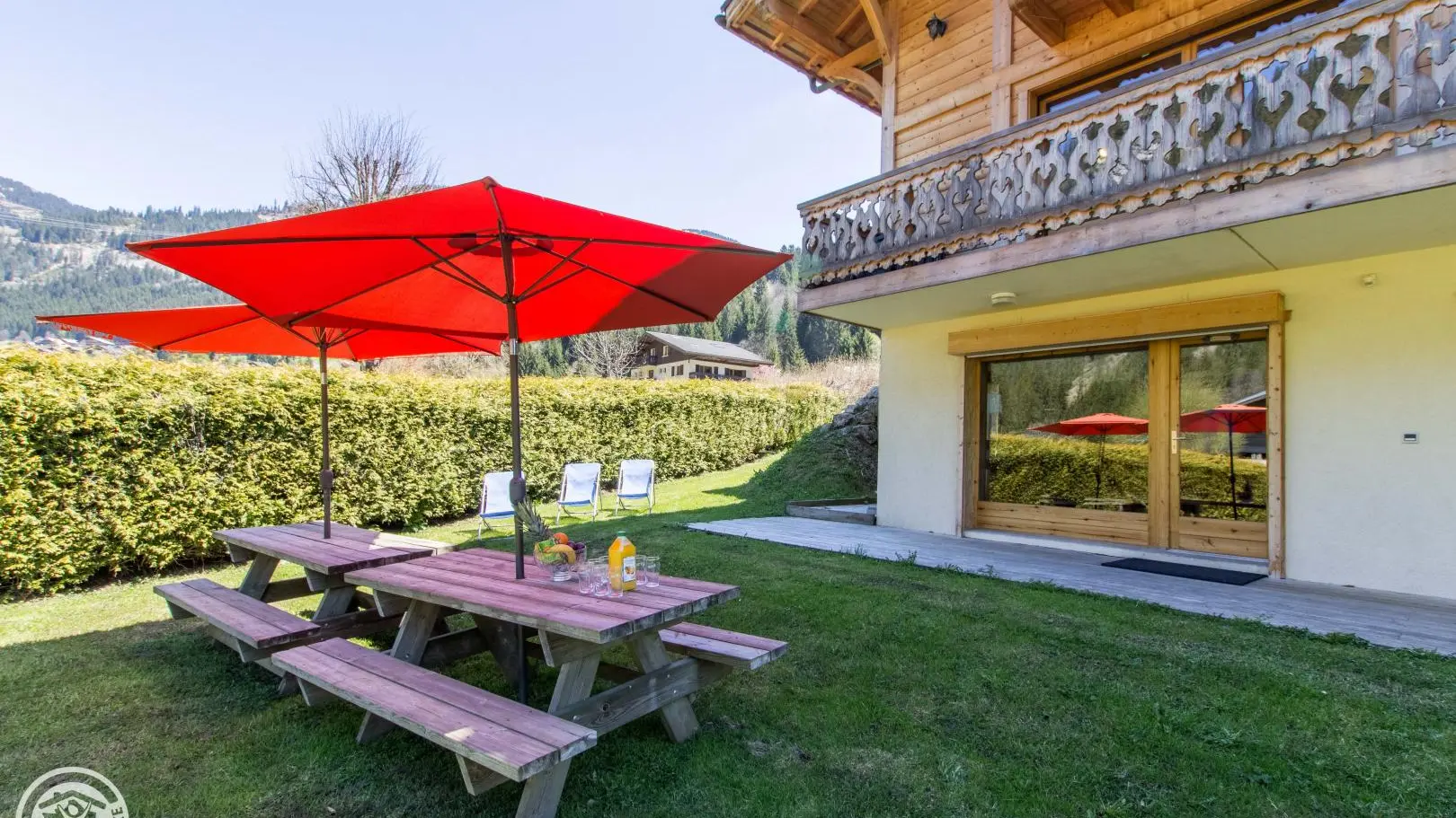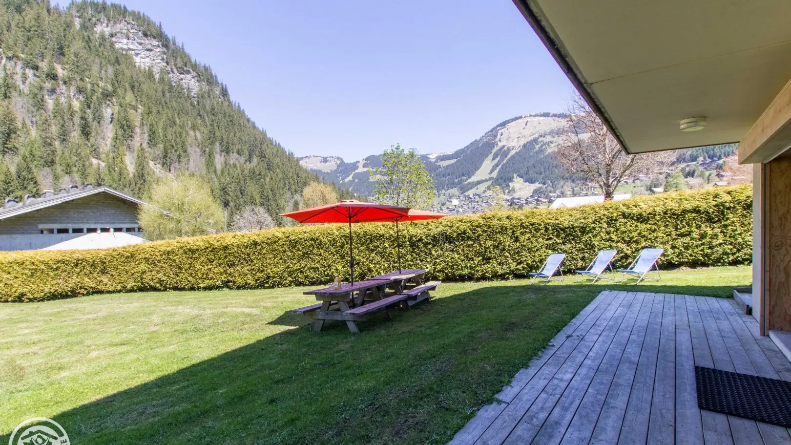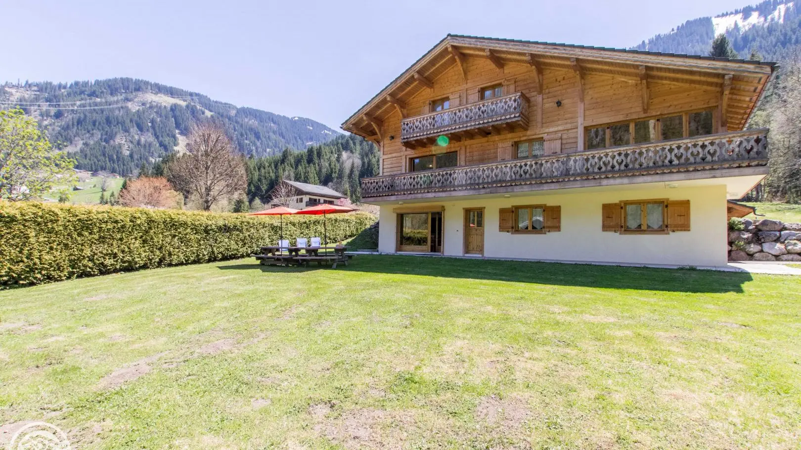 Terrasse et jardin avec tables forestières, transats. Le terrain/jardin devant le chalet est commun aux 2 gîtes. Barbecue. Parking privatif. Local skis / vélos commun avec sèche-chaussures électrique. Un petit ruisseau longe la propriété.
