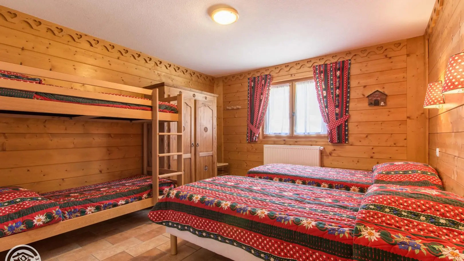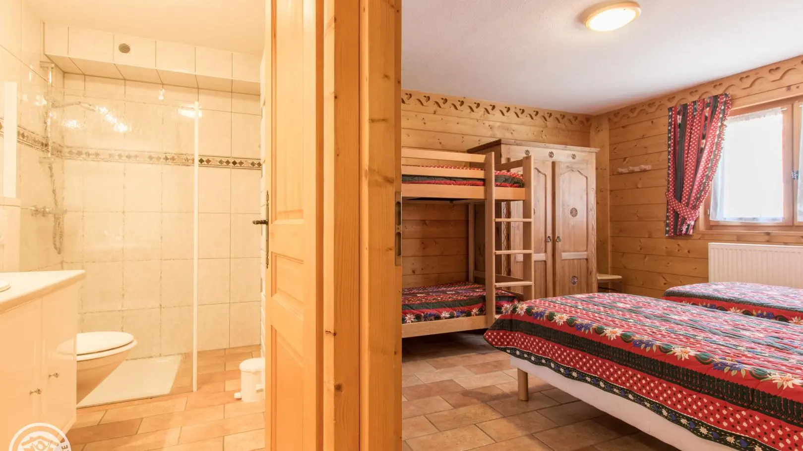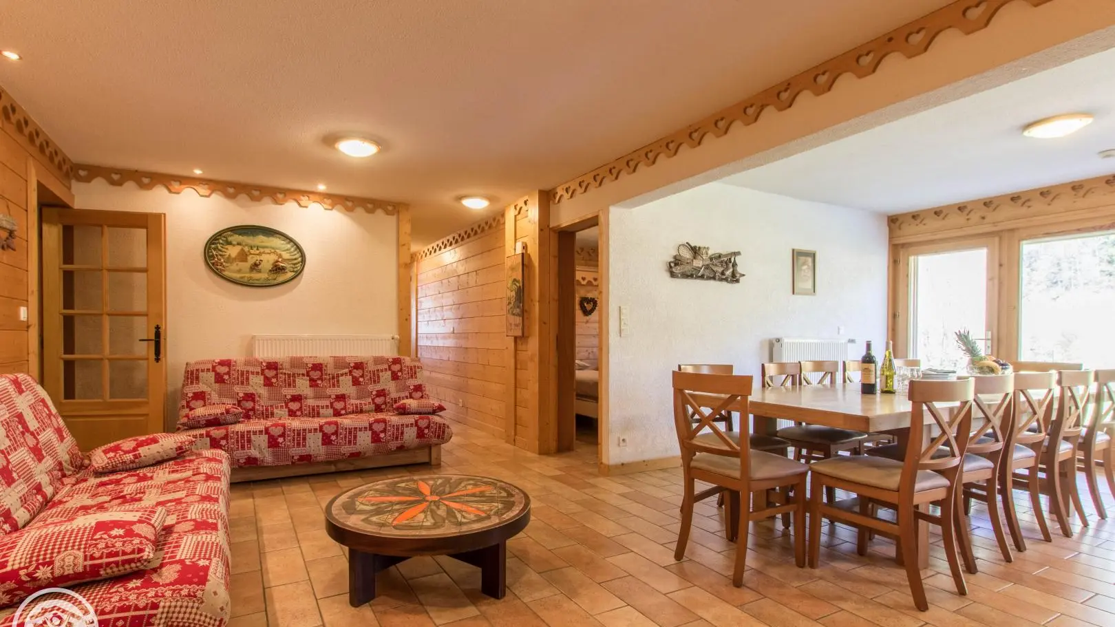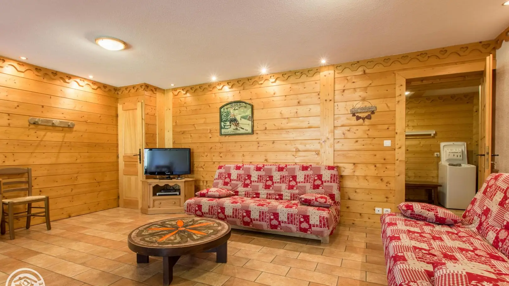 Dans un grand chalet, gite de 108m² aménagé sur un même niveau (rez-de-jardin / partie basse du chalet). Un autre gîte (référence 63027) est également disponible à l'étage. Entrée indépendante. Rez-de-jardin : hall d'entrée, cuisine intégrée ouverte sur le séjour (tv, 2 canapés), porte fenêtre donnant accès à la terrasse et au jardin. Chambre 1 (2 lits 90x200cm pouvant être rapprochés), chambre 2 (1 lit 160x200cm), chambre 3 (2 lits 90x200cm pouvant être rapprochés), chambre 4 (2 lits 90x200cm pouvant être rapprochés + 2 lits 80x190cm superposés). 2 salles d'eau avec chacune douche, vasque, sèche-serviettes et wc. 1 wc indépendant.