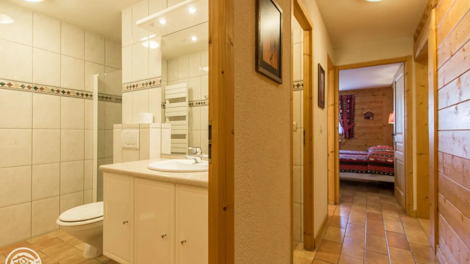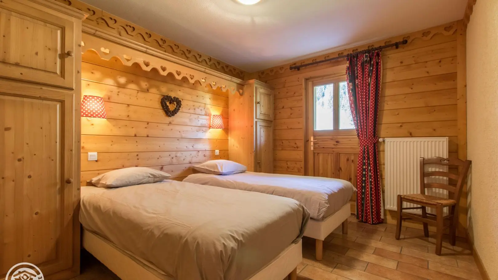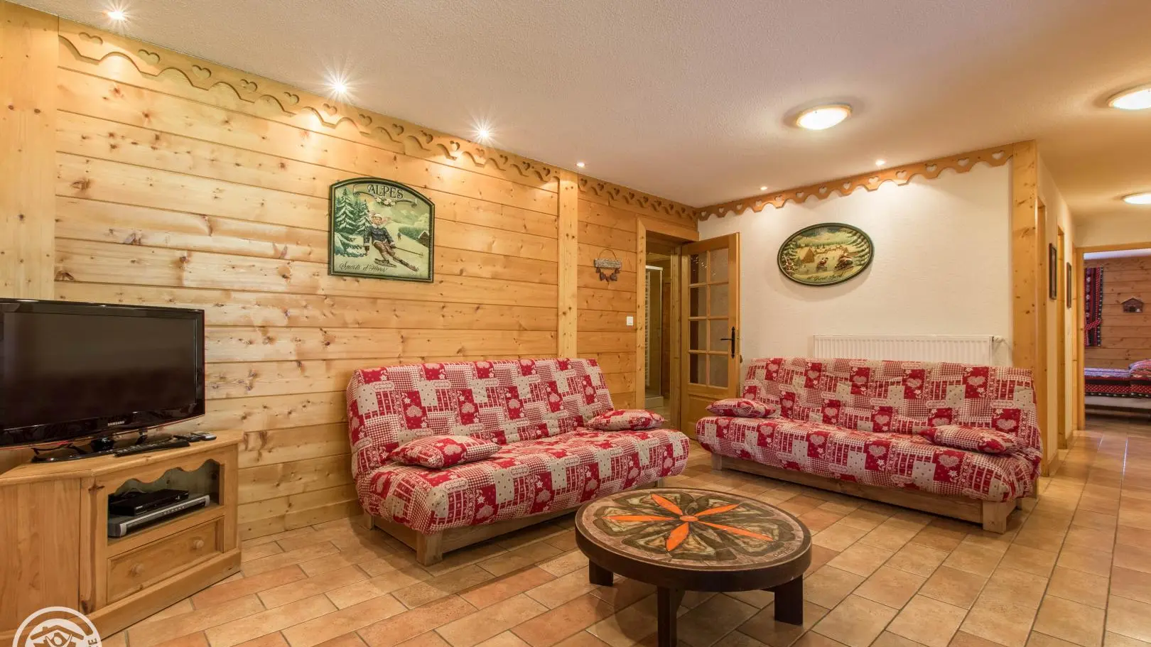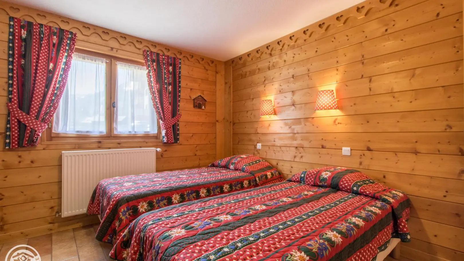 Dans un grand chalet, gite de 108m² aménagé sur un même niveau (rez-de-jardin / partie basse du chalet). Un autre gîte (référence 63027) est également disponible à l'étage. Entrée indépendante. Rez-de-jardin : hall d'entrée, cuisine intégrée ouverte sur le séjour (tv, 2 canapés), porte fenêtre donnant accès à la terrasse et au jardin. Chambre 1 (2 lits 90x200cm pouvant être rapprochés), chambre 2 (1 lit 160x200cm), chambre 3 (2 lits 90x200cm pouvant être rapprochés), chambre 4 (2 lits 90x200cm pouvant être rapprochés + 2 lits 80x190cm superposés). 2 salles d'eau avec chacune douche, vasque, sèche-serviettes et wc. 1 wc indépendant.