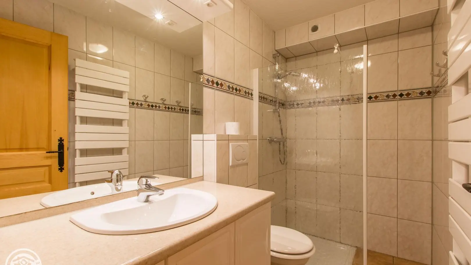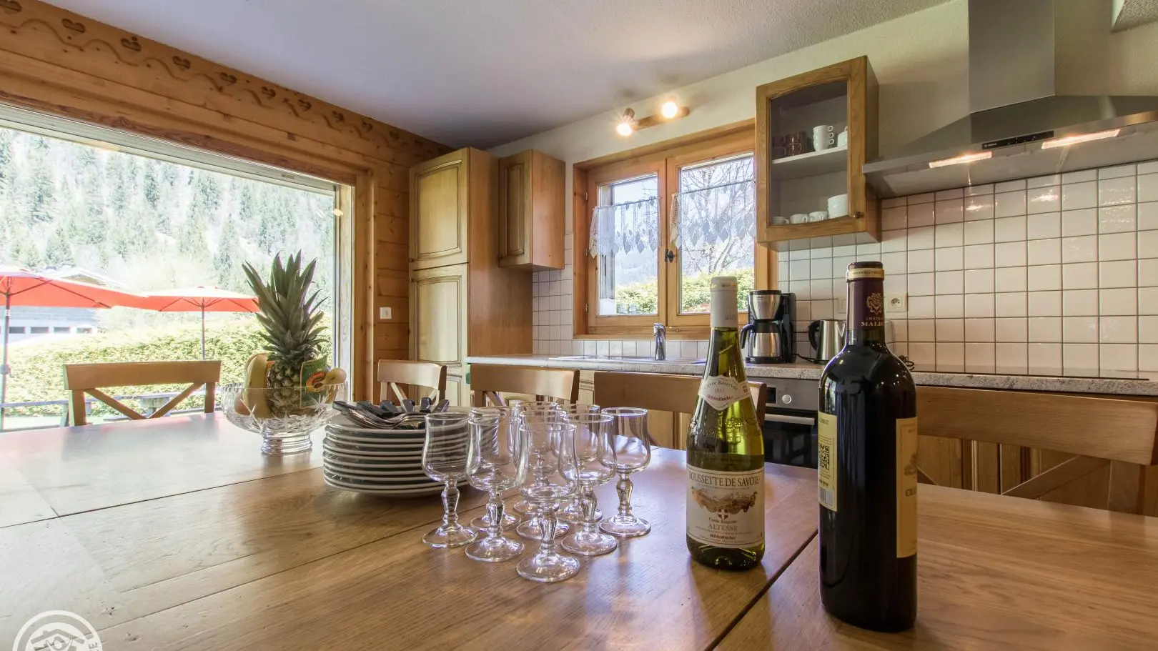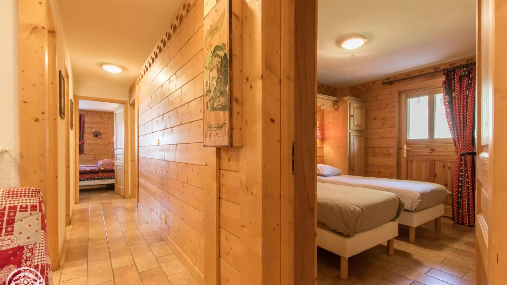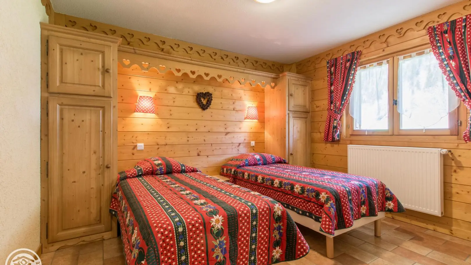 Dans un grand chalet, gite de 108m² aménagé sur un même niveau (rez-de-jardin / partie basse du chalet). Un autre gîte (référence 63027) est également disponible à l'étage. Entrée indépendante. Rez-de-jardin : hall d'entrée, cuisine intégrée ouverte sur le séjour (tv, 2 canapés), porte fenêtre donnant accès à la terrasse et au jardin. Chambre 1 (2 lits 90x200cm pouvant être rapprochés), chambre 2 (1 lit 160x200cm), chambre 3 (2 lits 90x200cm pouvant être rapprochés), chambre 4 (2 lits 90x200cm pouvant être rapprochés + 2 lits 80x190cm superposés). 2 salles d'eau avec chacune douche, vasque, sèche-serviettes et wc. 1 wc indépendant.