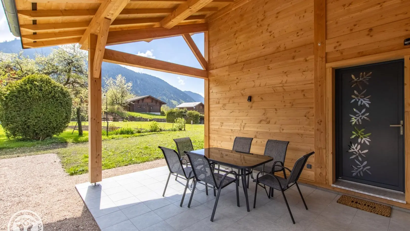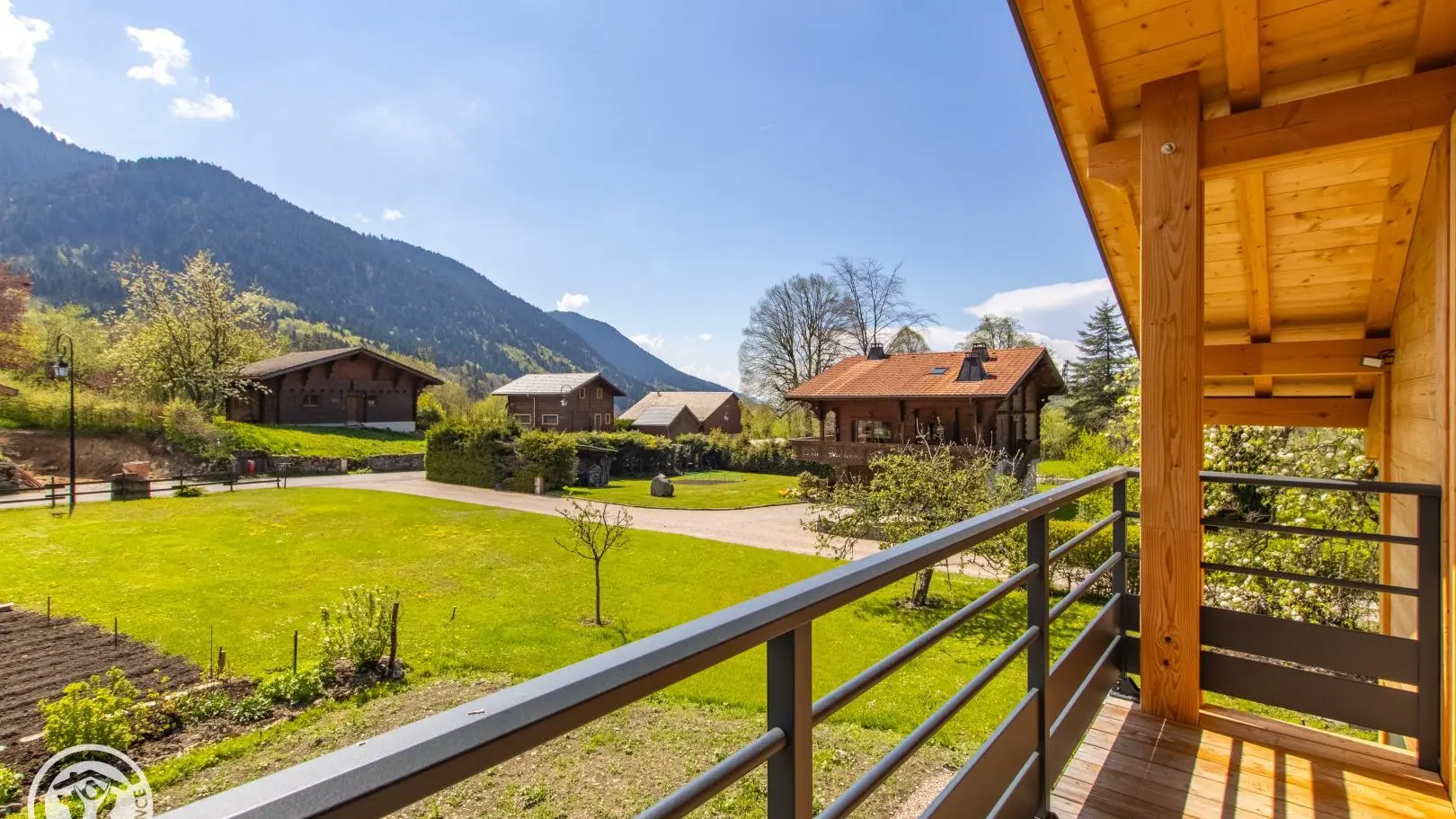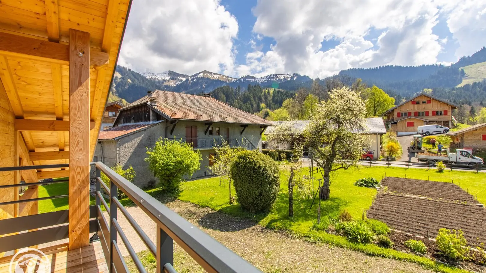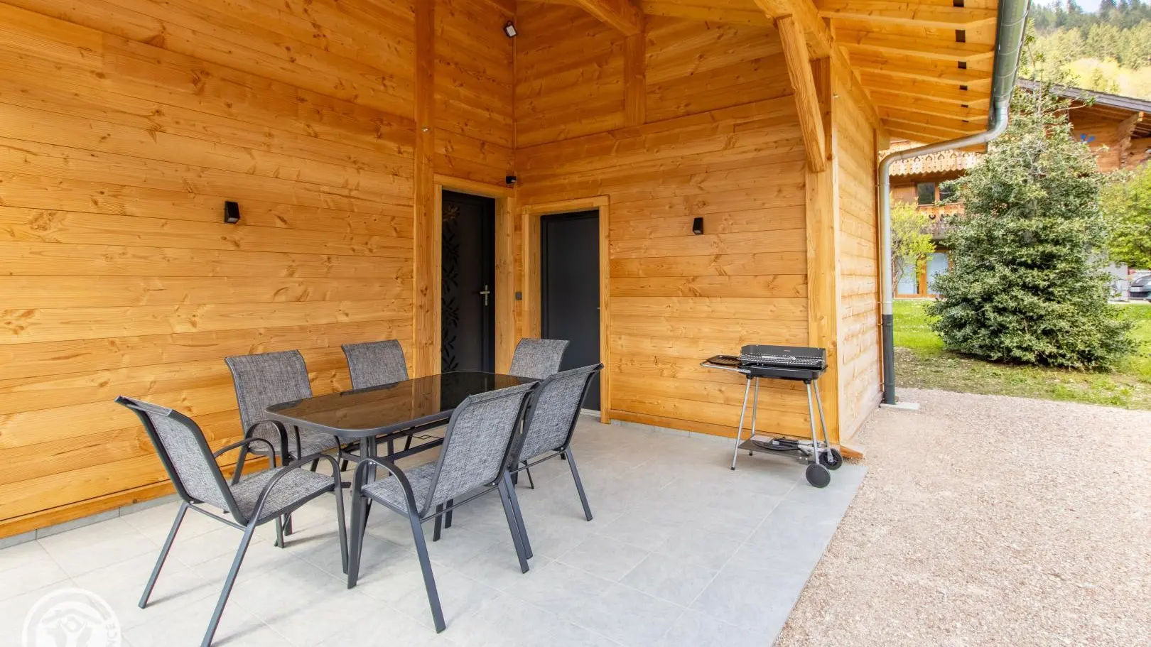 Terrasse couverte sud-est avec salon de jardin, barbecue. Jardin, balcon. 2ème terrasse sud avec transats. Très belle vue montagnes.