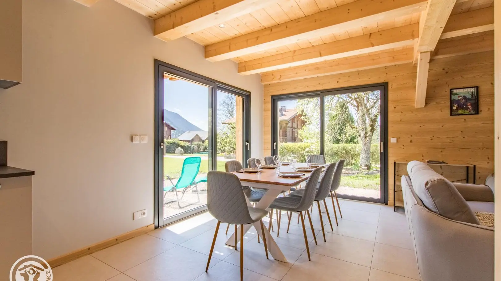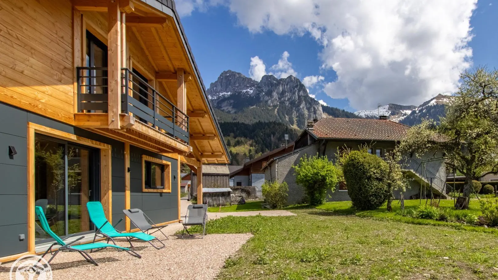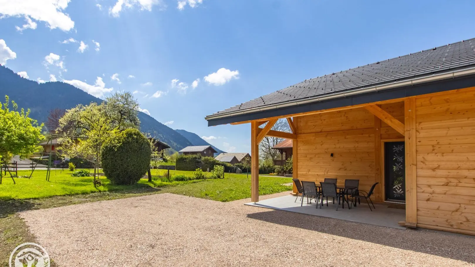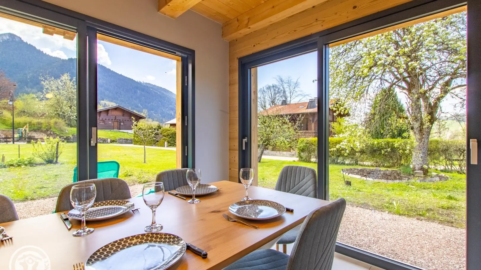 Terrasse couverte sud-est avec salon de jardin, barbecue. Jardin, balcon. 2ème terrasse sud avec transats. Très belle vue montagnes.