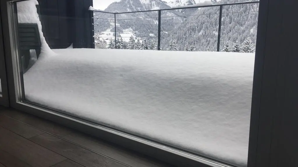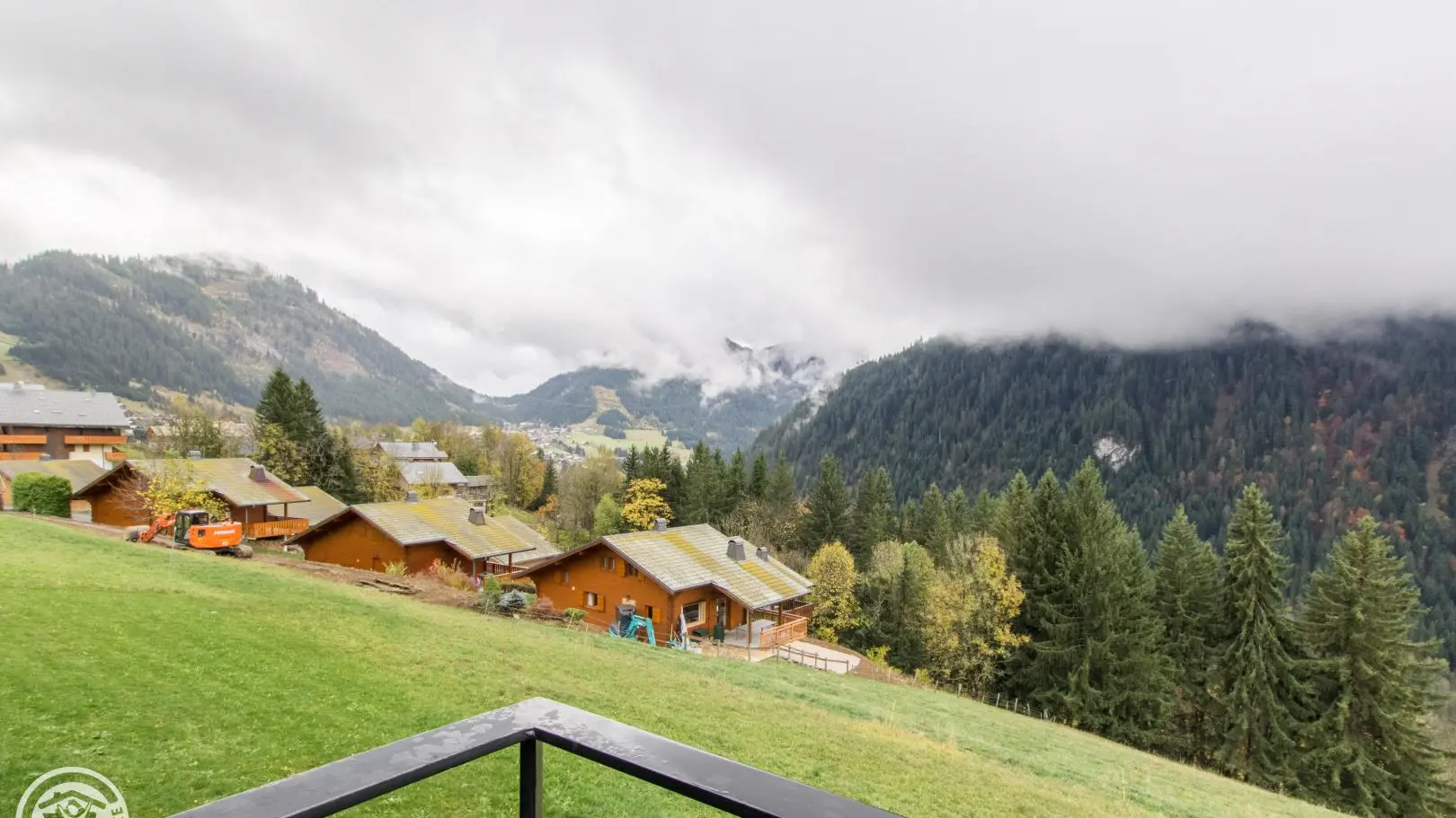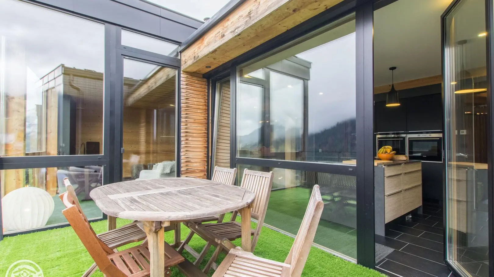 Balcon - terrasse avec mobilier de jardin, magnifique vue sur les montagnes et le village de Châtel.