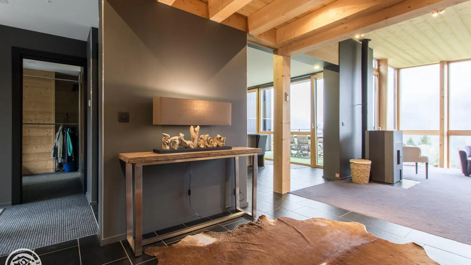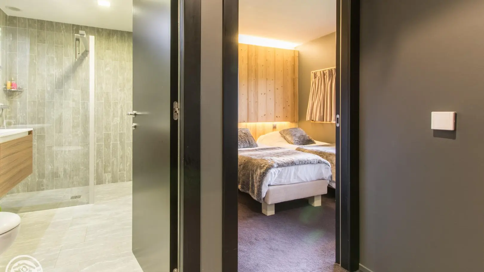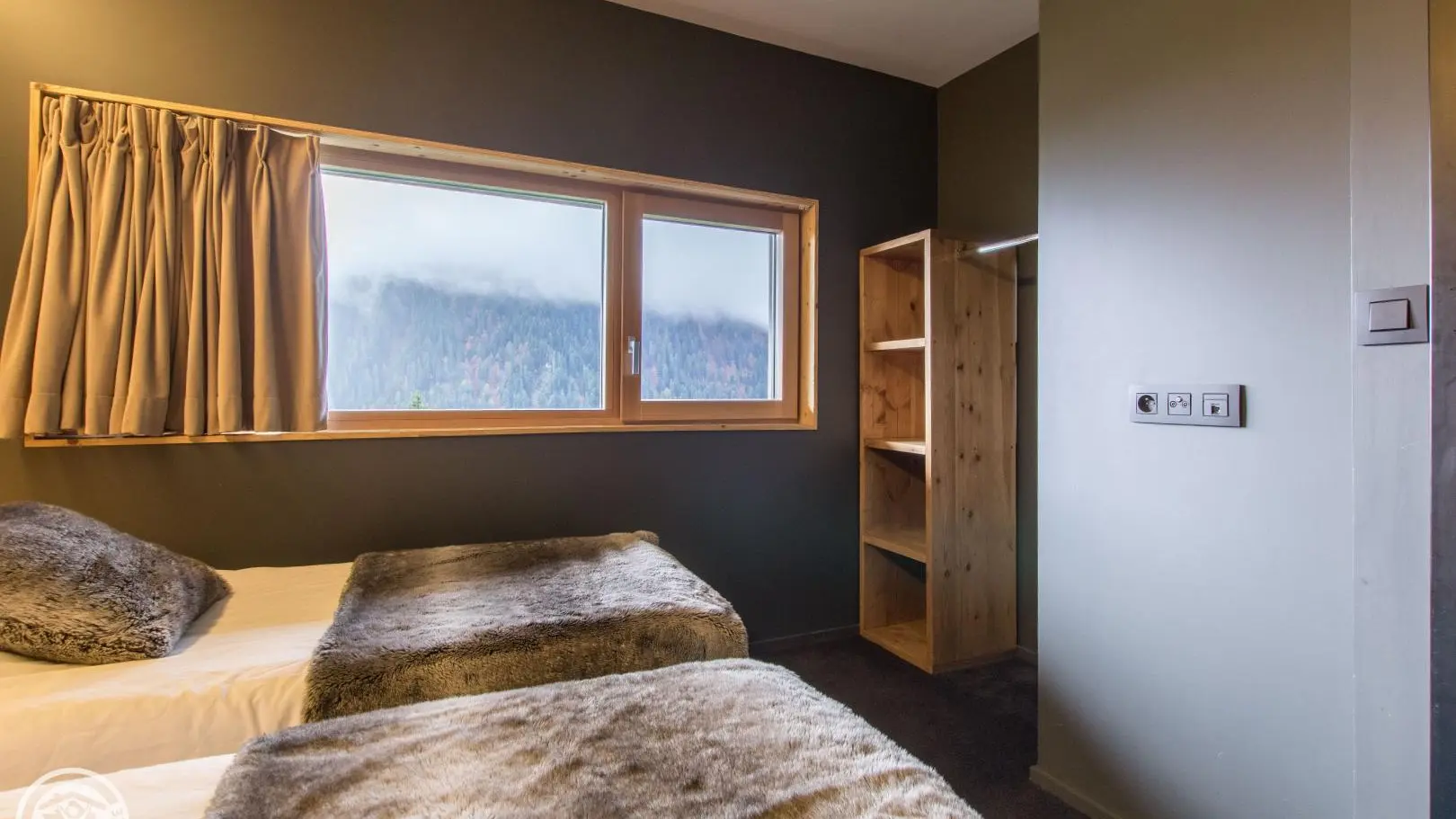 Rez-de-chaussée : hall d'entrée + vestiaire avec rangements. Cuisine intégrée ouverte sur séjour et salle à manger : télévision, lecteur DVD, poêle à granulés (granulés fournis), accès au balcon-terrasse avec mobilier de jardin. WC indépendant. En rez-de-jardin (partie basse du chalet), 3 chambres avec chacune 2 lits 80x190cm pouvant être jumelés pour créer 1 lit double (160x190cm), 1 salle d'eau (dans chambre 1) + 1 salle d'eau/wc, 1 wc indépendant. Lave + sèche-linge. Accès au terrain devant le gîte.