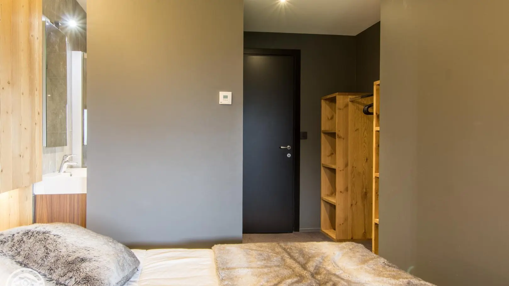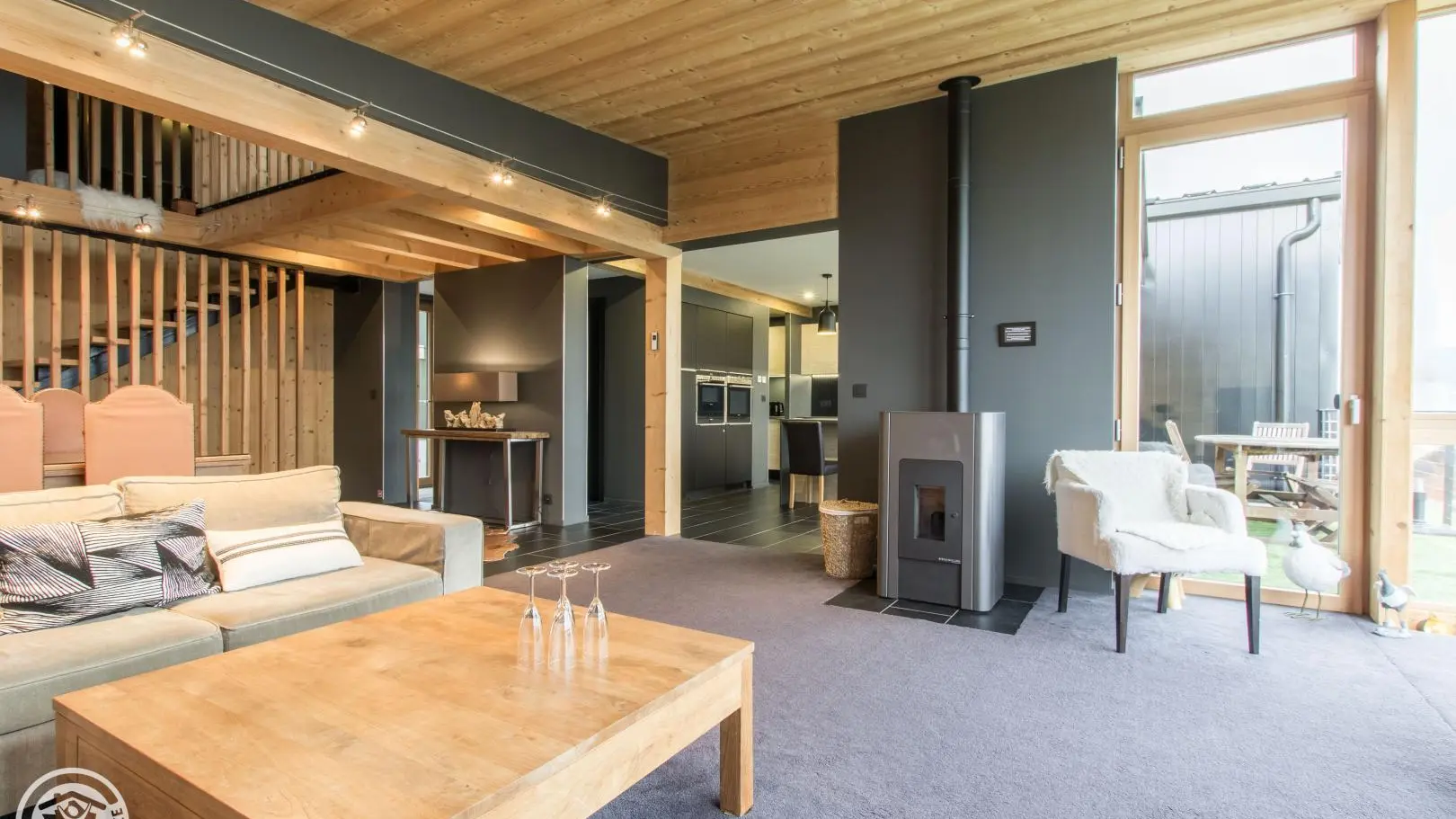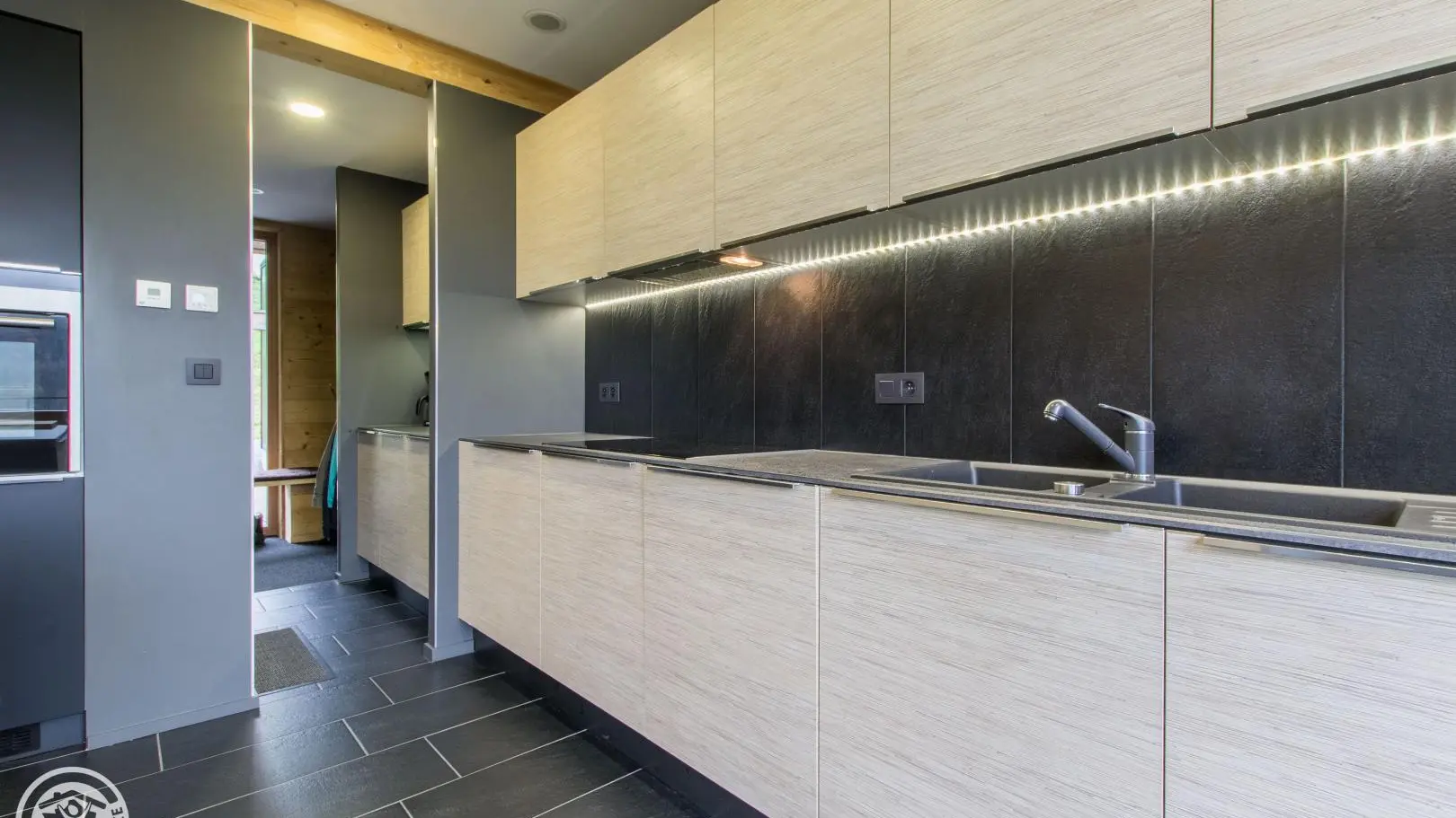 Rez-de-chaussée : hall d'entrée + vestiaire avec rangements. Cuisine intégrée ouverte sur séjour et salle à manger : télévision, lecteur DVD, poêle à granulés (granulés fournis), accès au balcon-terrasse avec mobilier de jardin. WC indépendant. En rez-de-jardin (partie basse du chalet), 3 chambres avec chacune 2 lits 80x190cm pouvant être jumelés pour créer 1 lit double (160x190cm), 1 salle d'eau (dans chambre 1) + 1 salle d'eau/wc, 1 wc indépendant. Lave + sèche-linge. Accès au terrain devant le gîte.