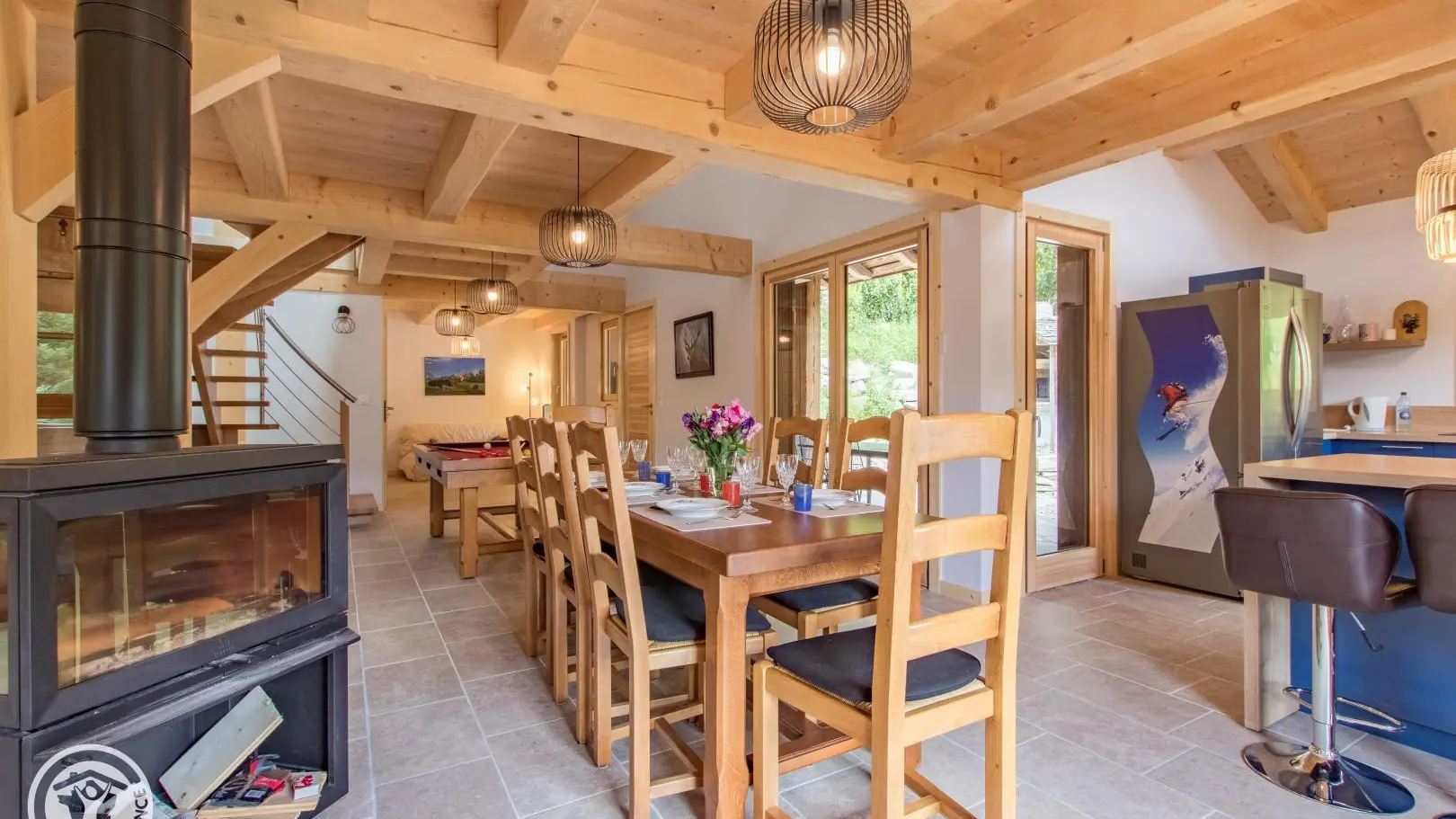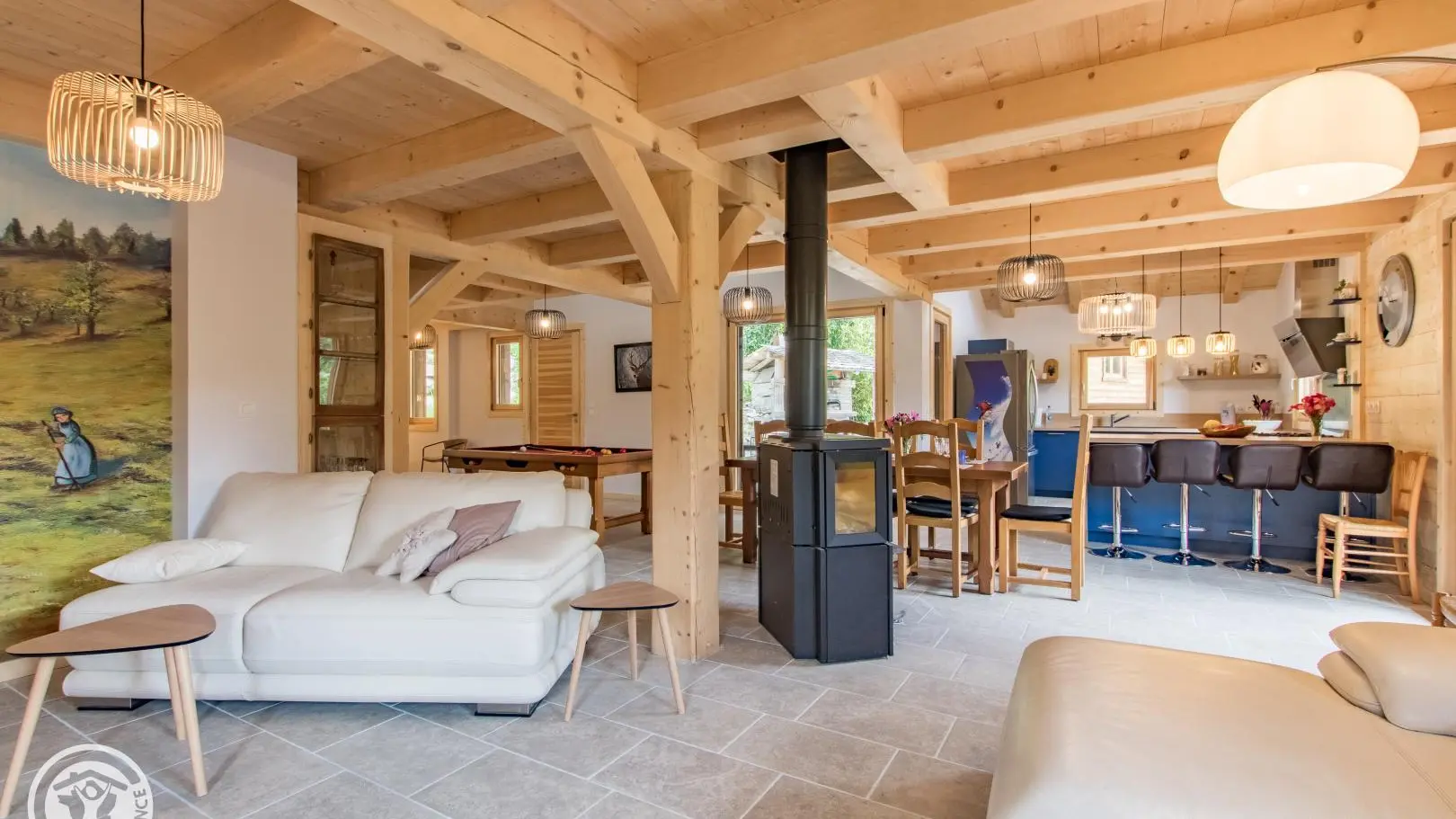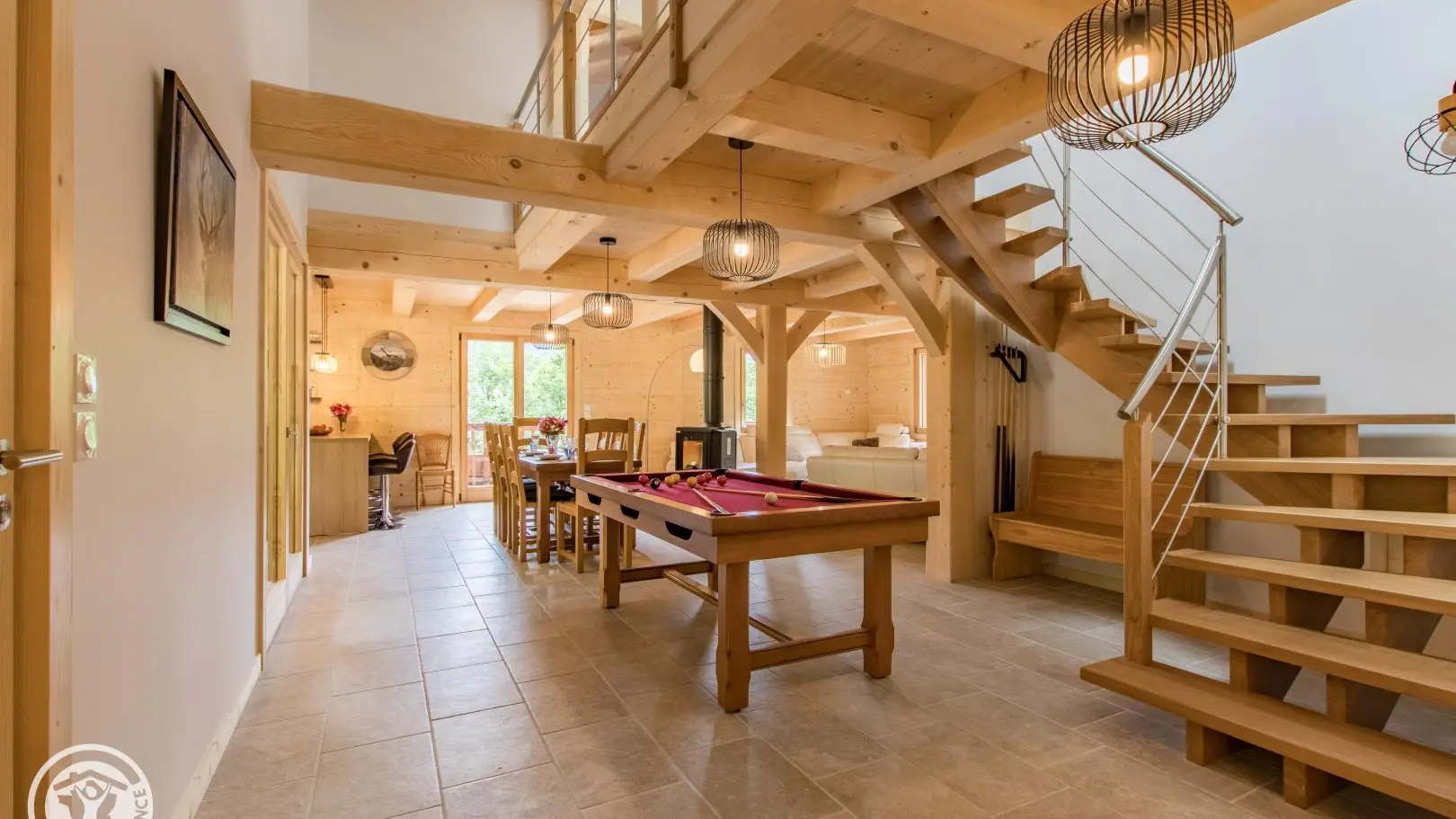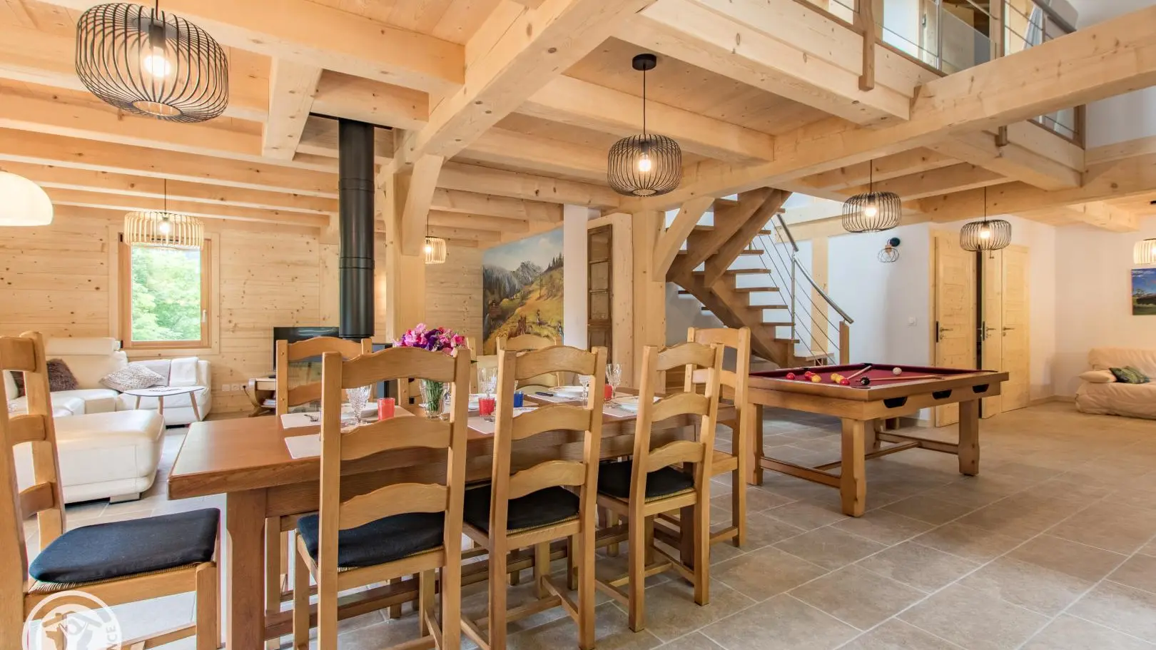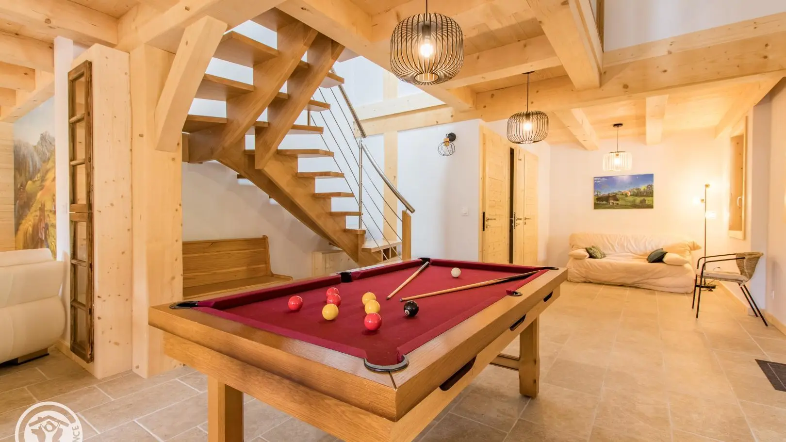 - Spacieuse pièce de vie : table de repas + table billard, cheminée, canapés, télévision, cuisine toute équipée avec piano de cuisson, accès à la terrasse côté Est et balcon côté Sud.