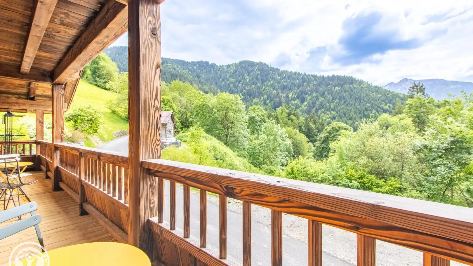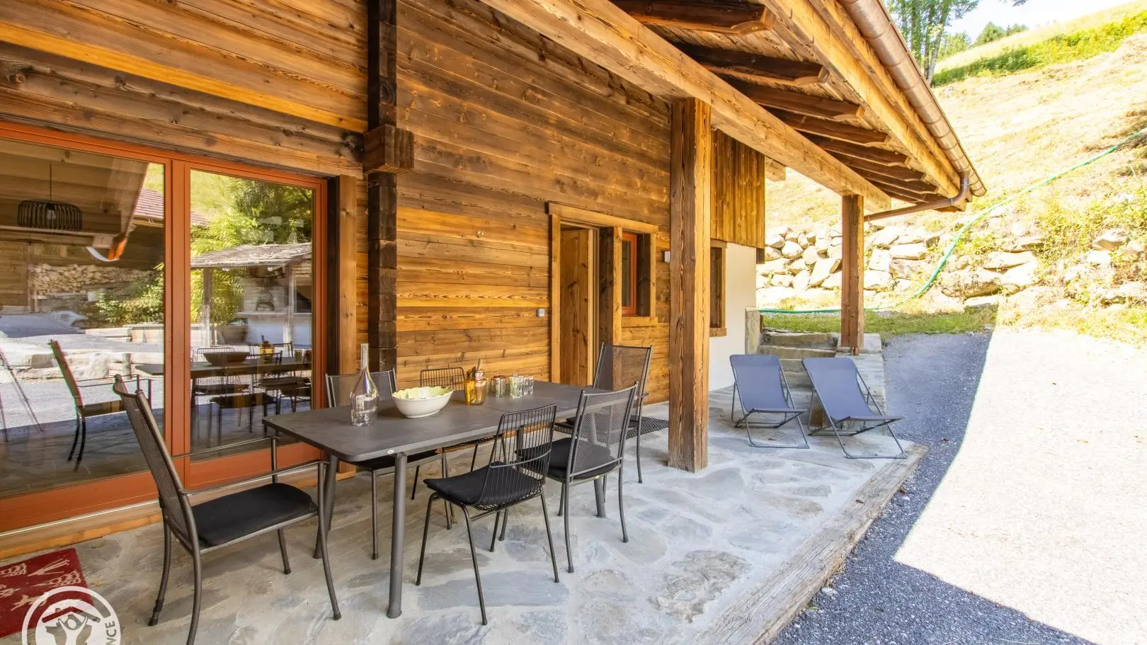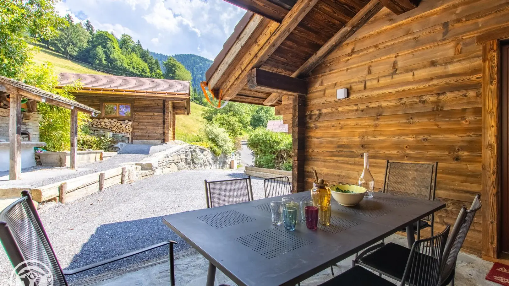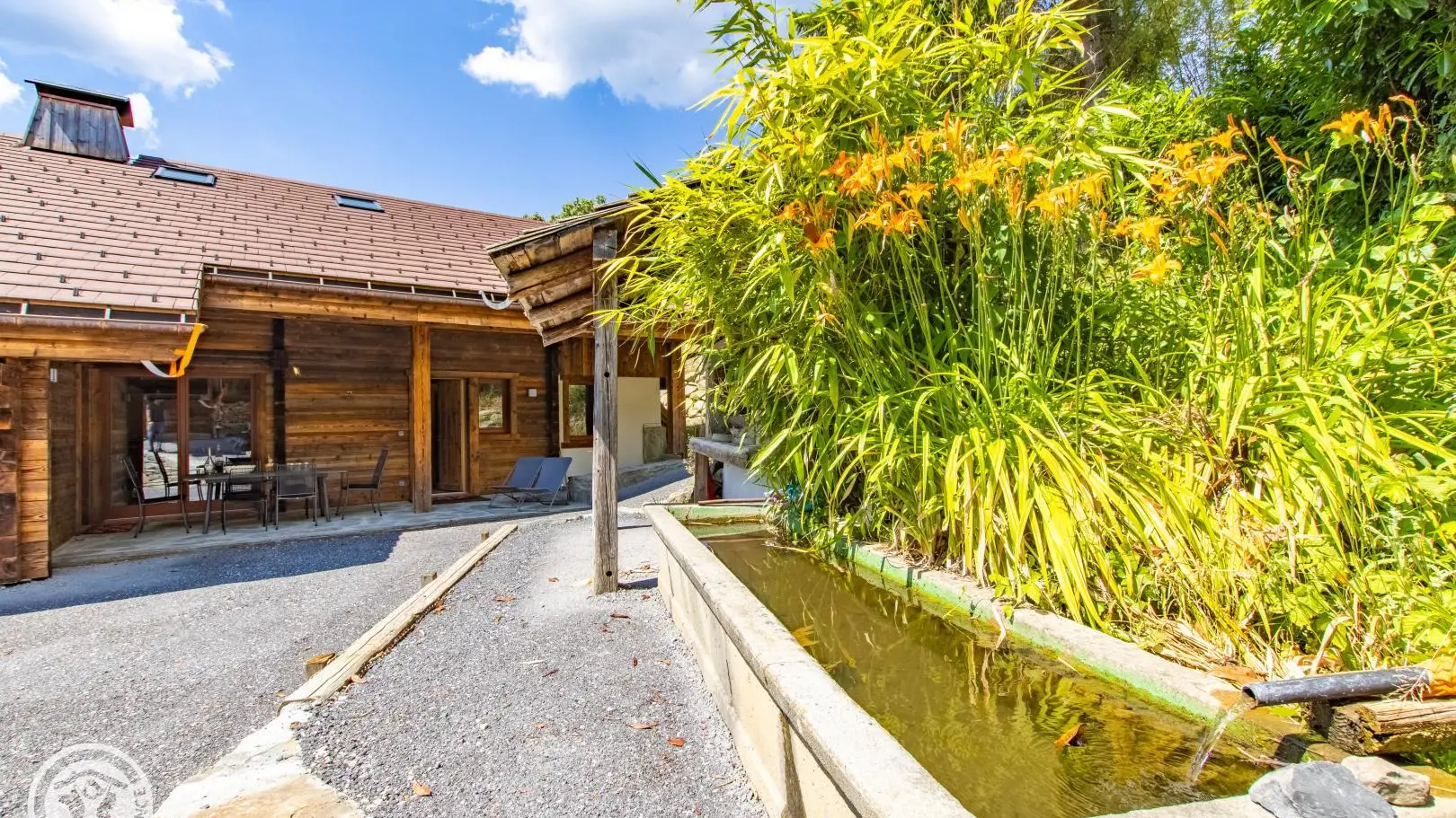 Terrasse avec mobilier de jardin, transats, barbecue, cour privative devant le gîte, balcon. Vue montagnes. Présence d'un petit bassin avec eau d'une source à côté de la terrasse (vigilance nécessaire pour les enfants).