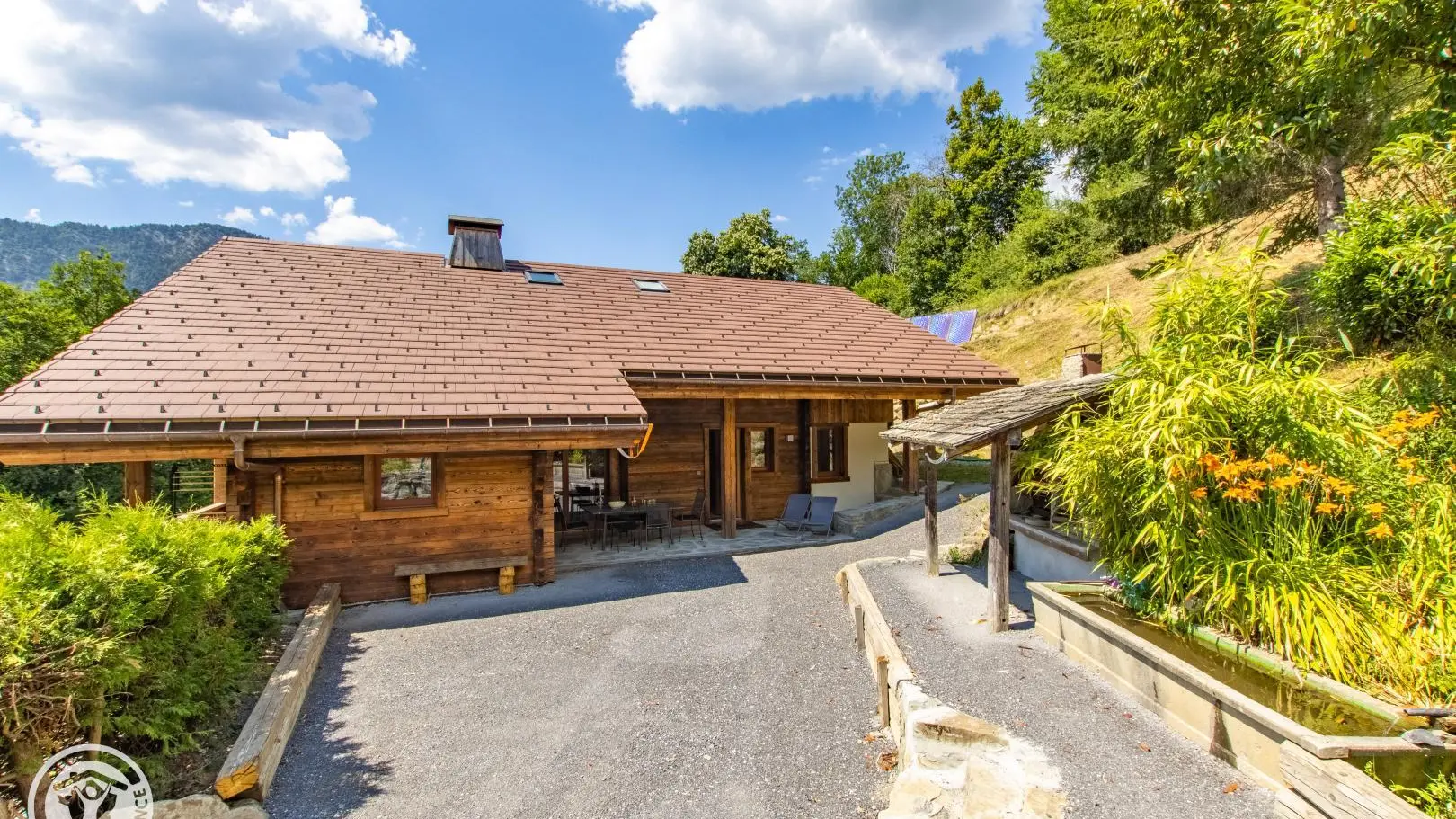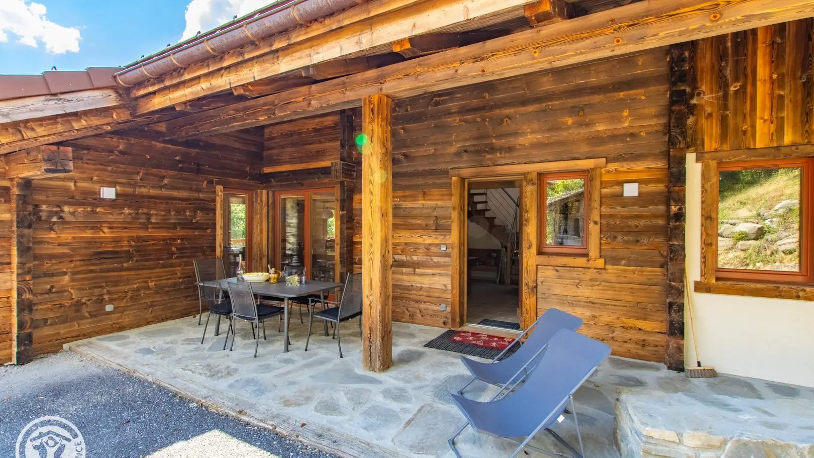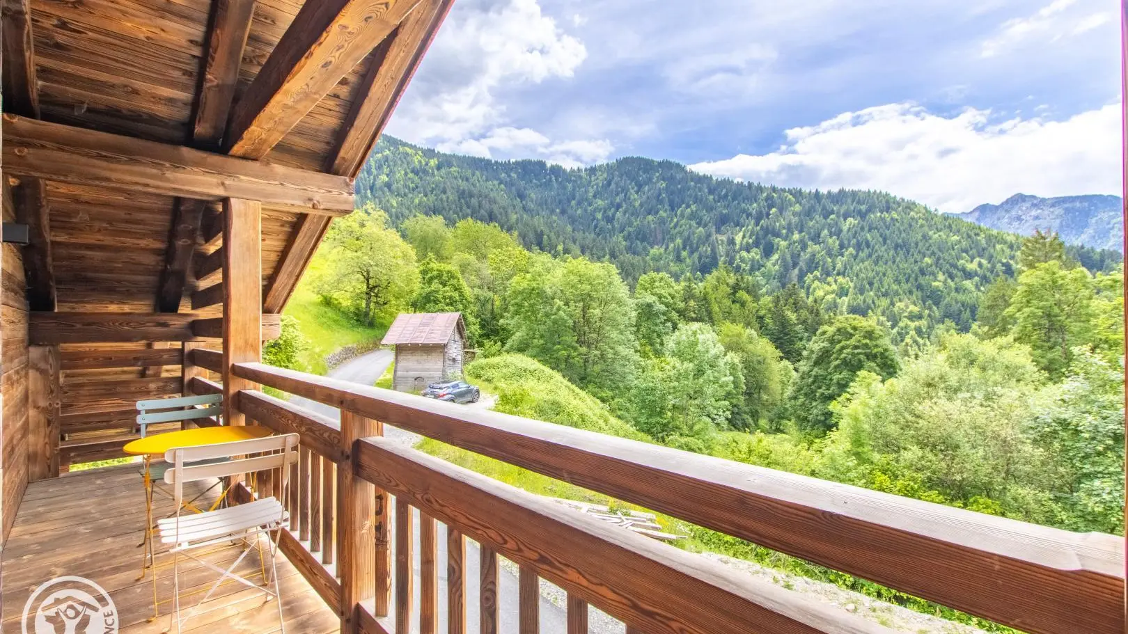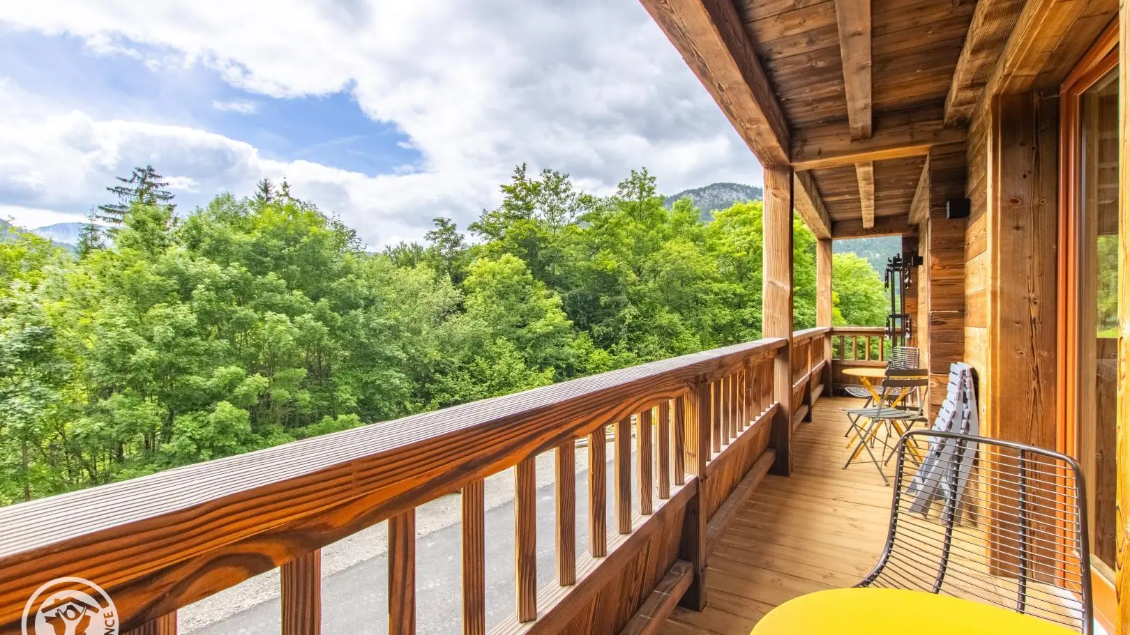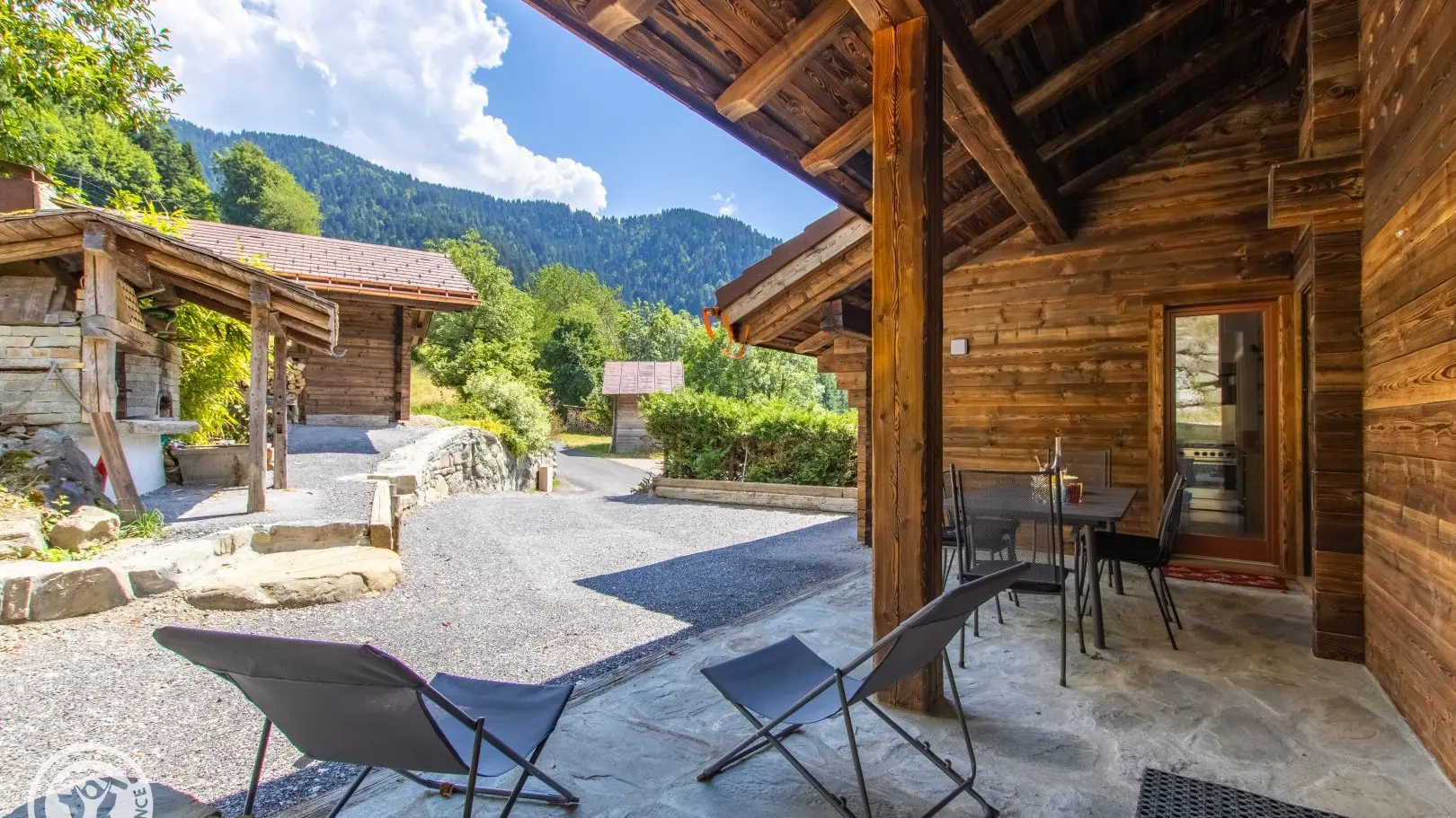 Terrasse avec mobilier de jardin, transats, barbecue, cour privative devant le gîte, balcon. Vue montagnes. Présence d'un petit bassin avec eau d'une source à côté de la terrasse (vigilance nécessaire pour les enfants).