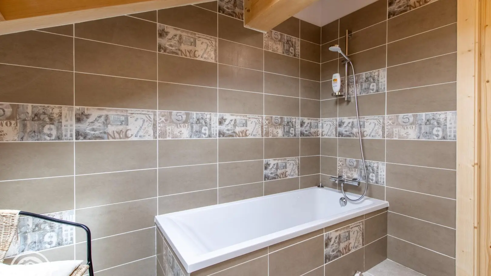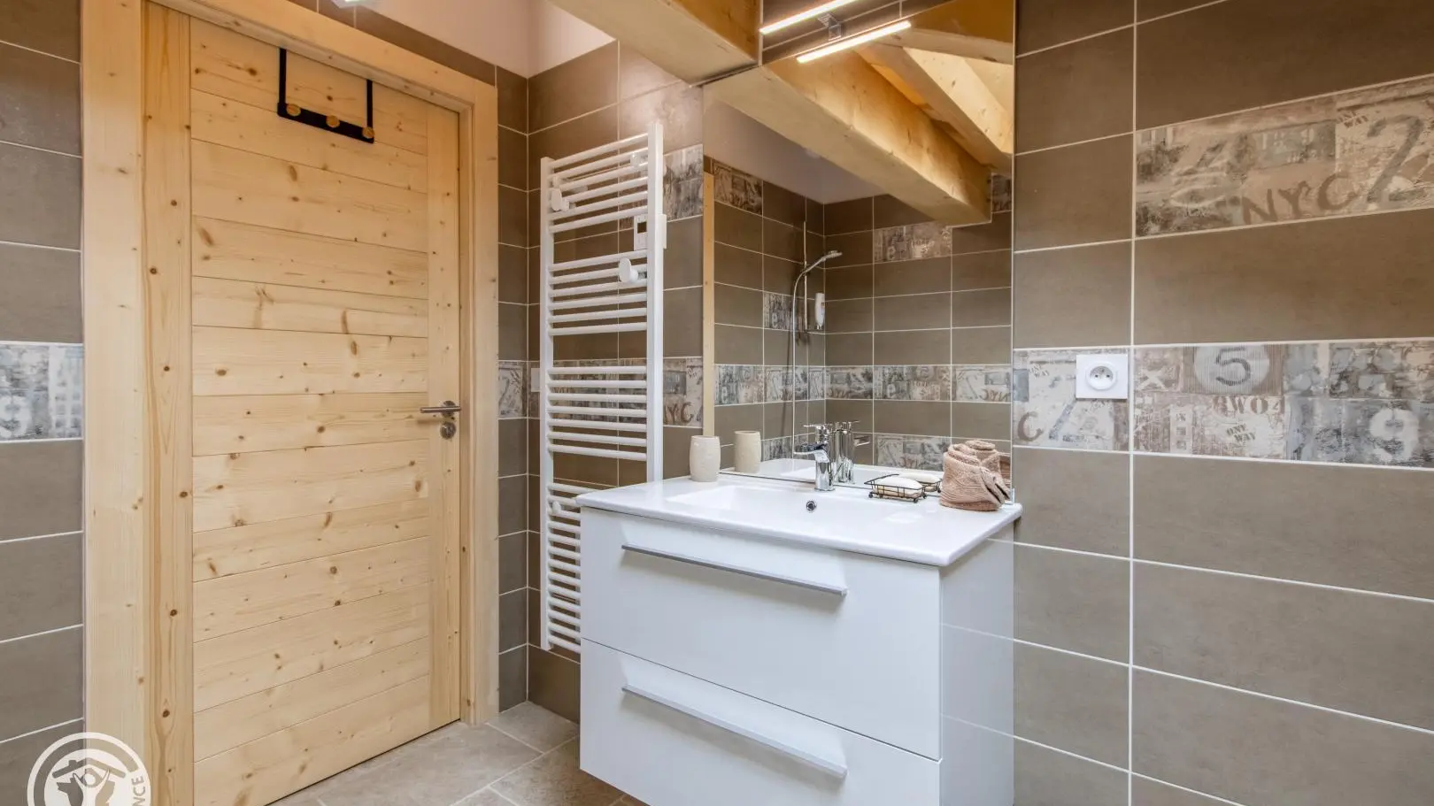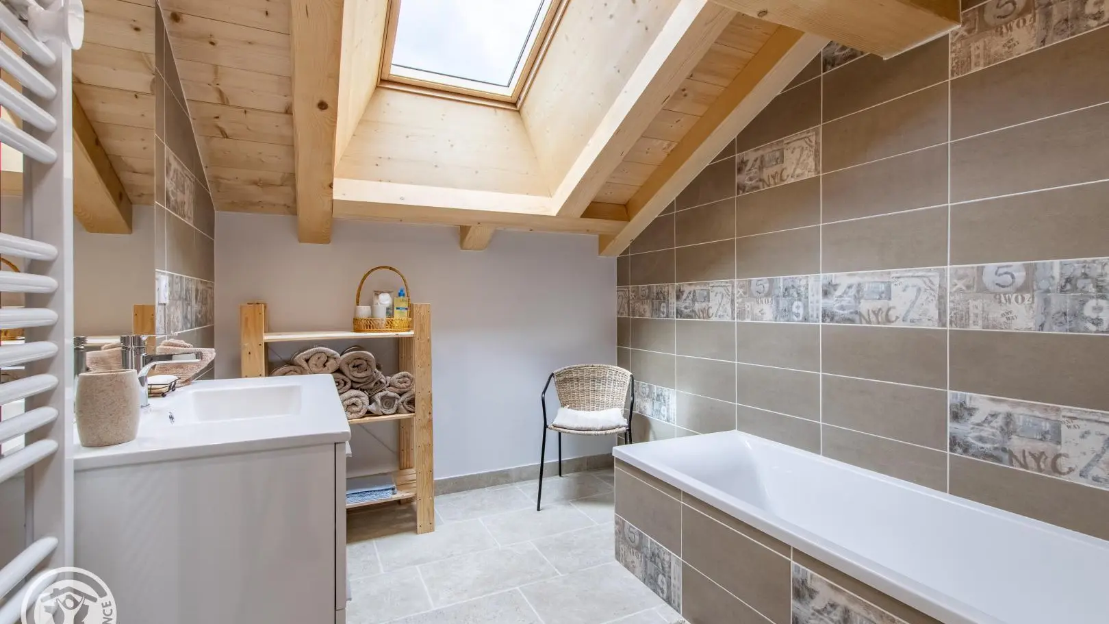- Salle de bains : vasque sur meuble, baignoire, sèche-serviettes.