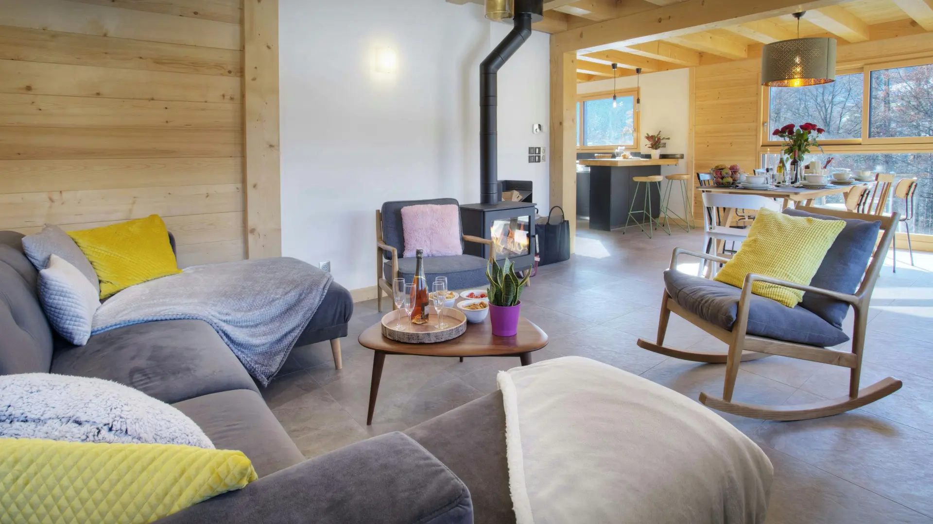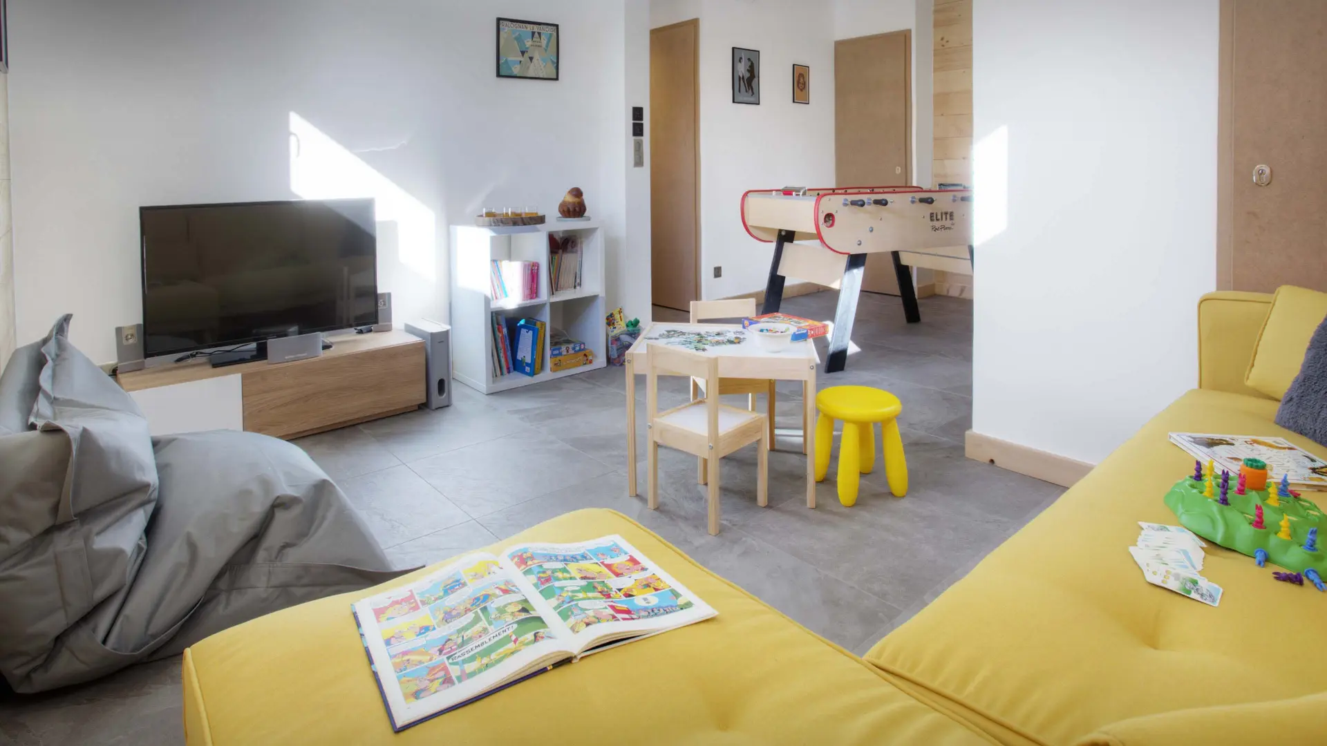 Ce chalet est spacieux et bien décoré. Il est idéal pour les familles puisqu’il comprend une chambre cosy à lits superposés ainsi qu’une salle de jeux avec babyfoot, poufs et télévision. Le joli salon à l’étage convient donc parfaitement aux adultes.