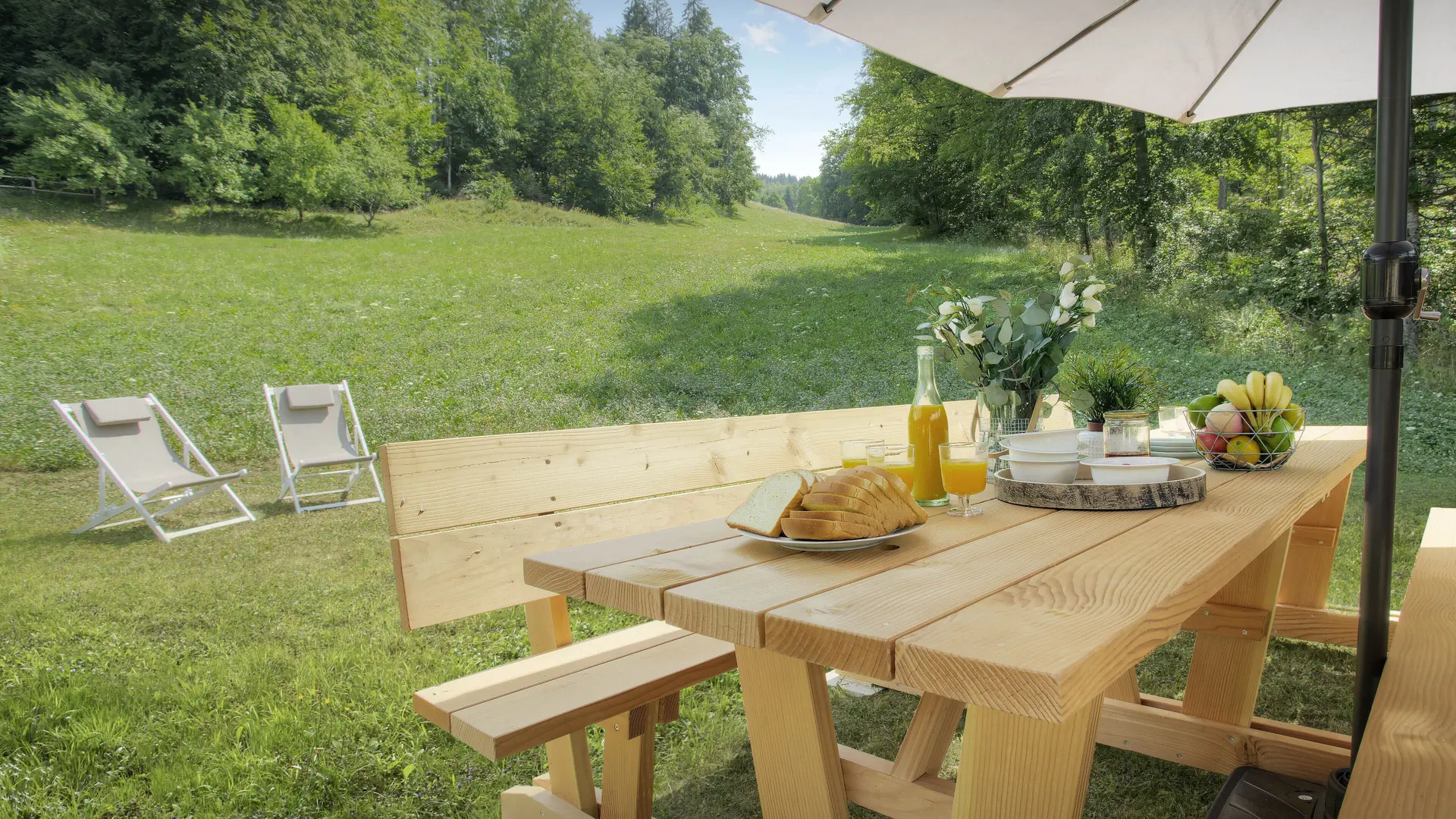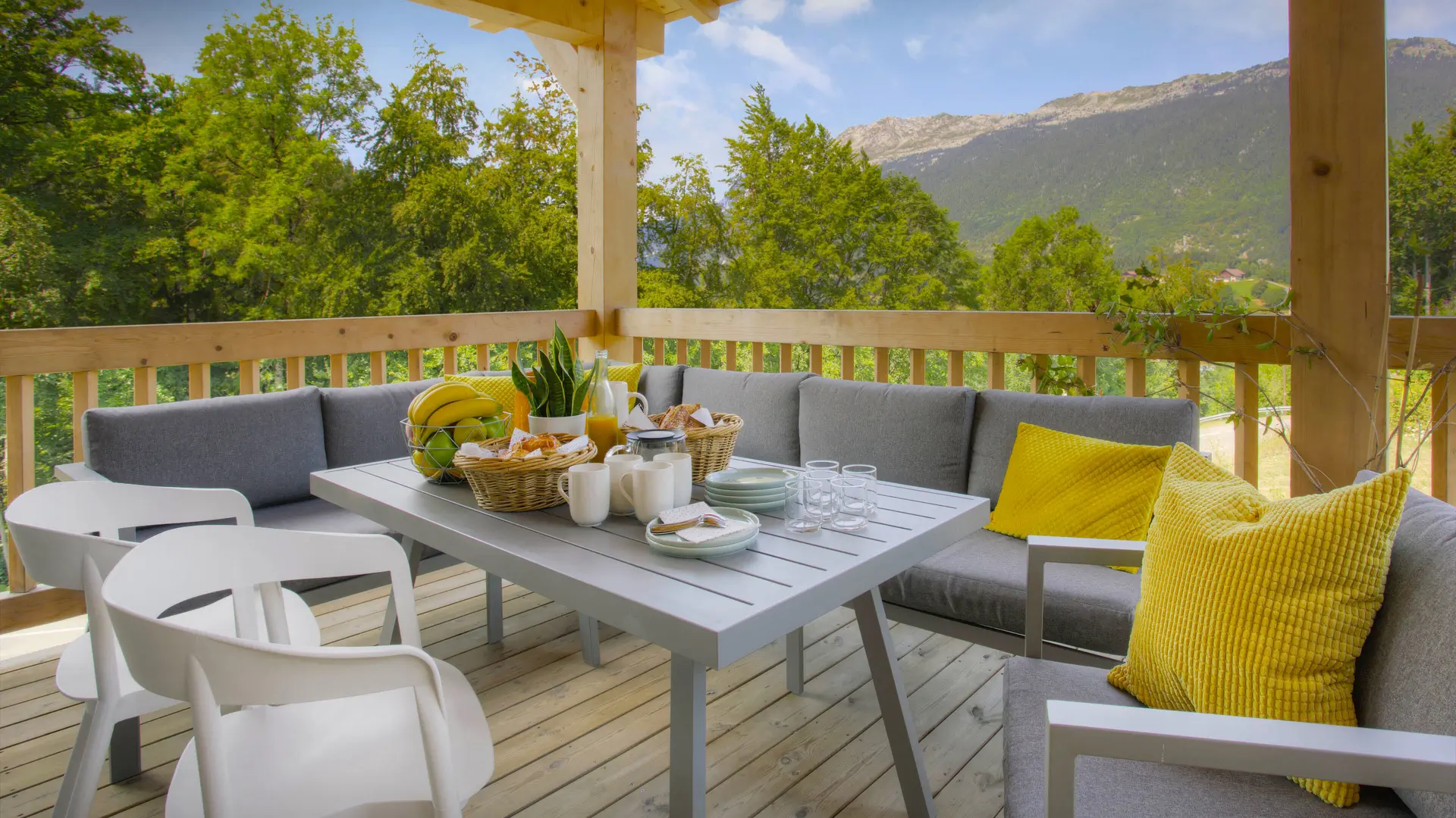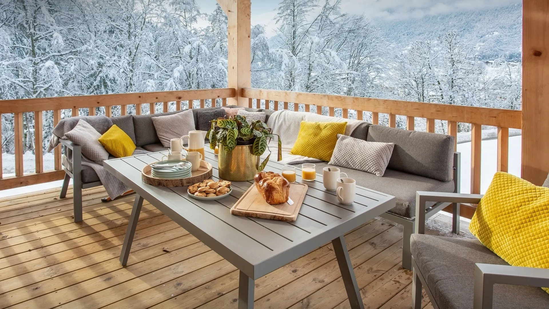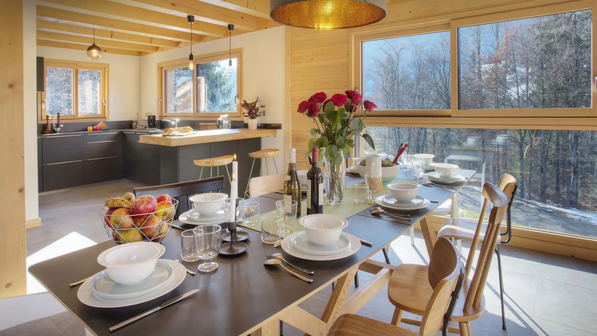 L’espace à vivre principal s’ouvre sur une charmante terrasse couverte, depuis laquelle les vues sur le coucher du soleil sont splendides. La journée, il est possible que le bruit de la route en contrebas remonte jusqu’à la terrasse. Mais avec cet accès direct à la route principale, vous ne perdrez pas de temps à rejoindre les pistes.