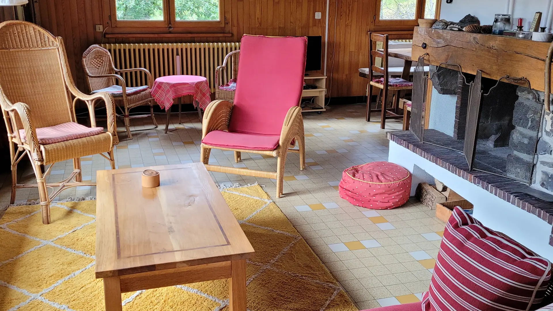 Séjour avec canapé, TV, DVD et cheminée (bois fourni).