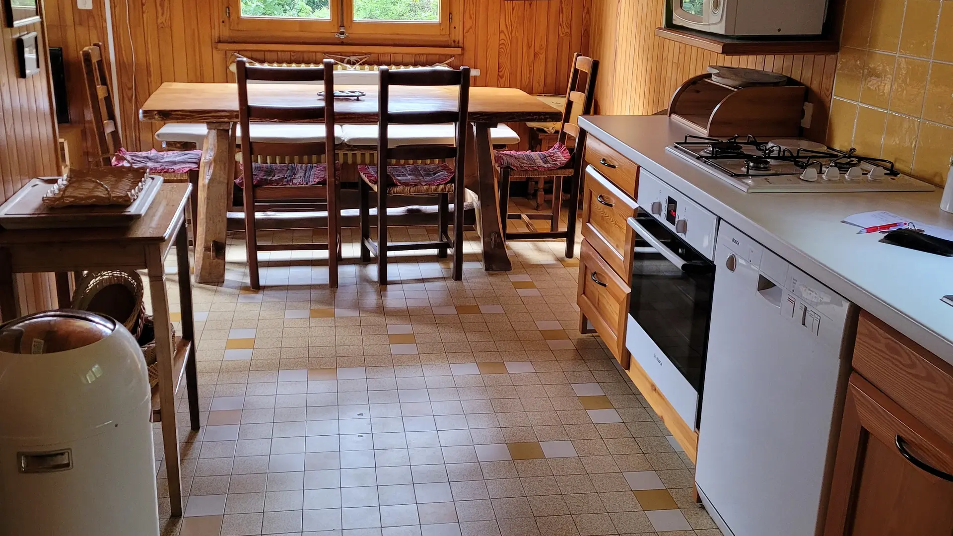 Cuisine équipée avec réfrigérateur, cuisinière, micro ondes, lave vaisselle et lave linge.