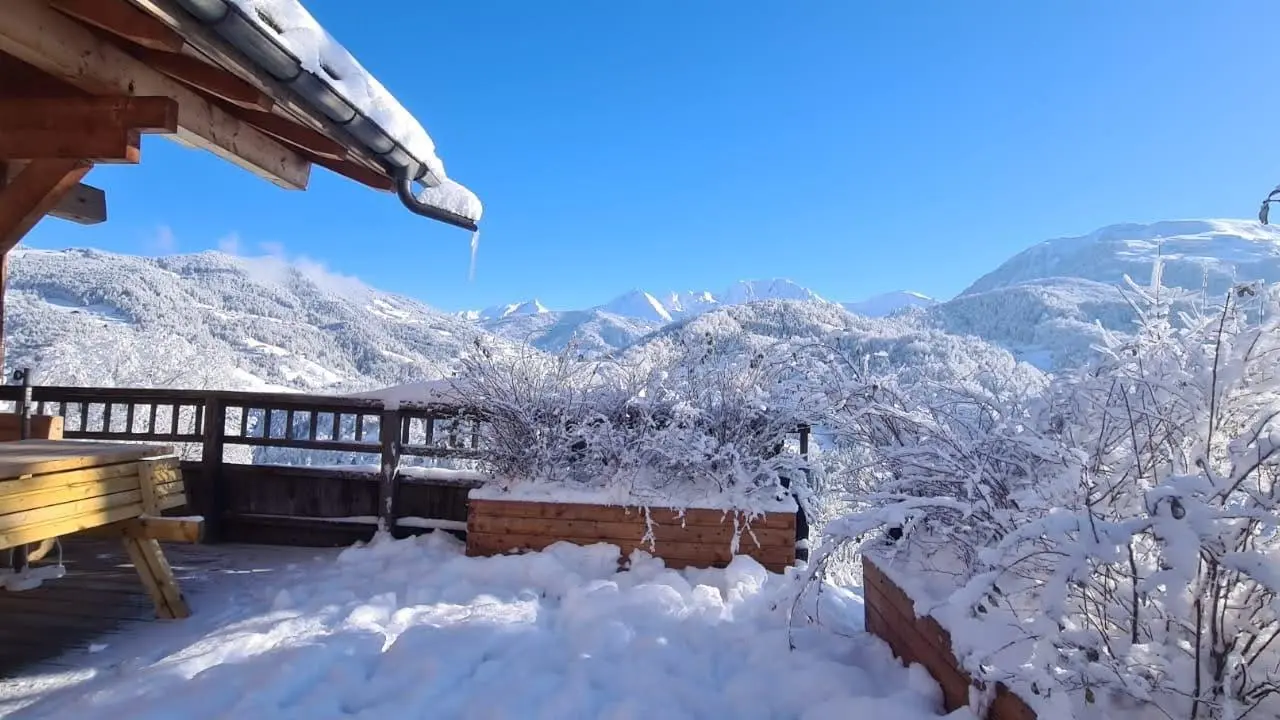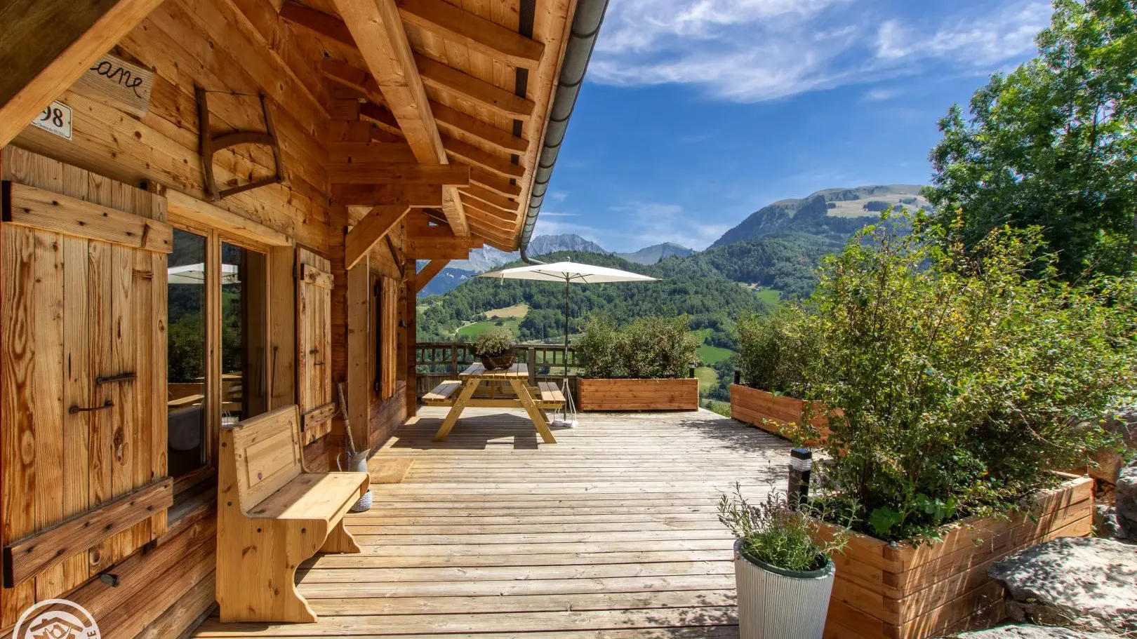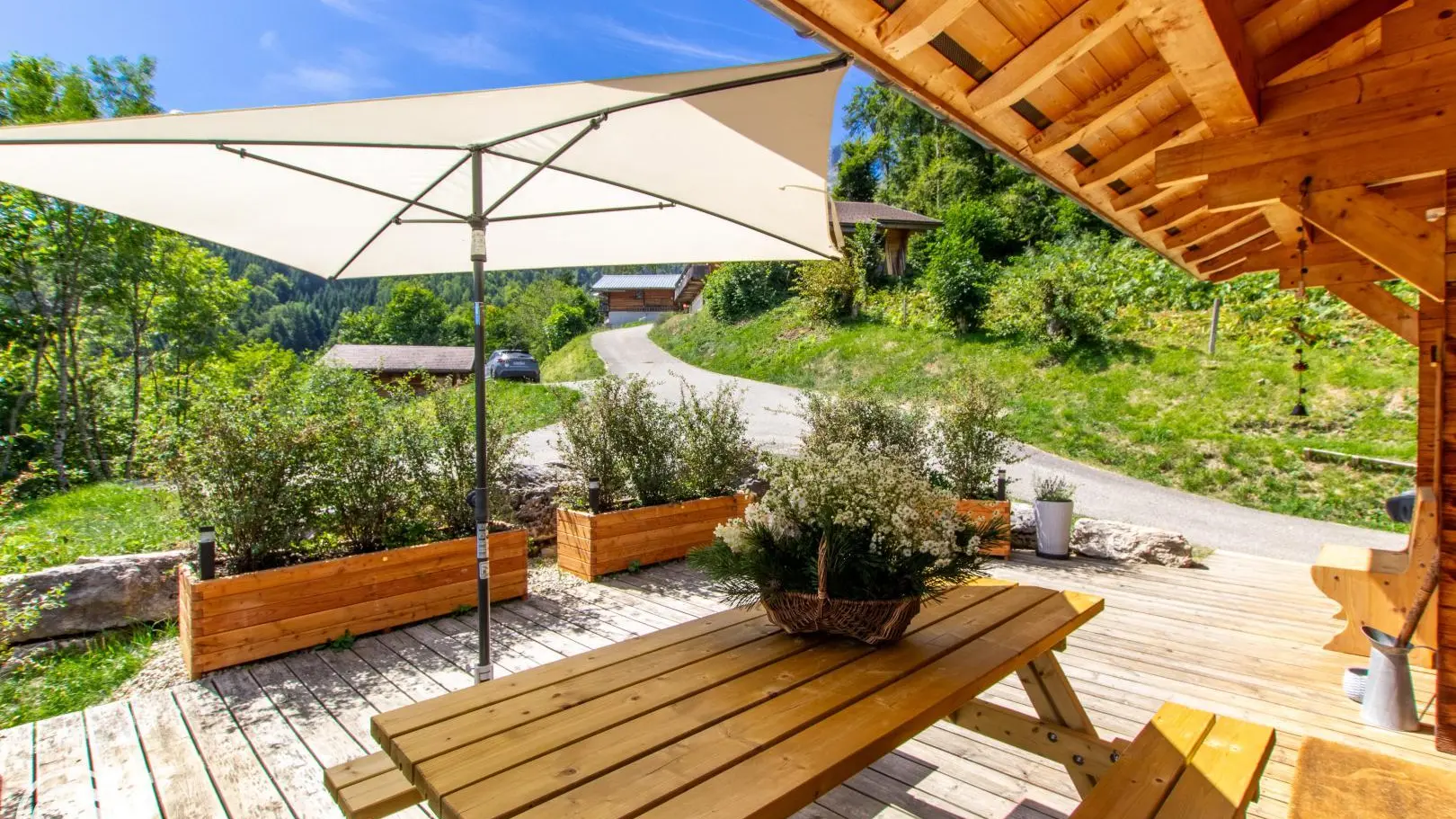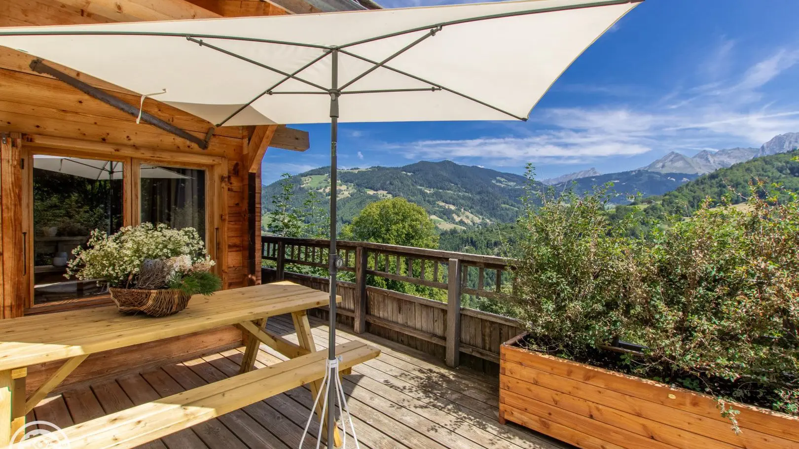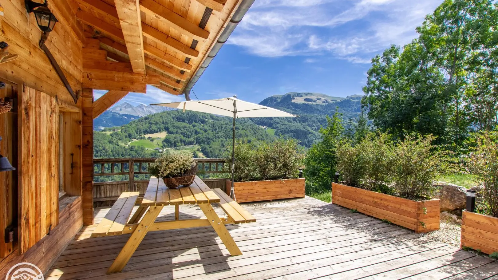 Terrasse orientée Sud et balcon Est offrant une magnifique vue sur les montagnes. Mobilier de jardin (table forestière), parasol.