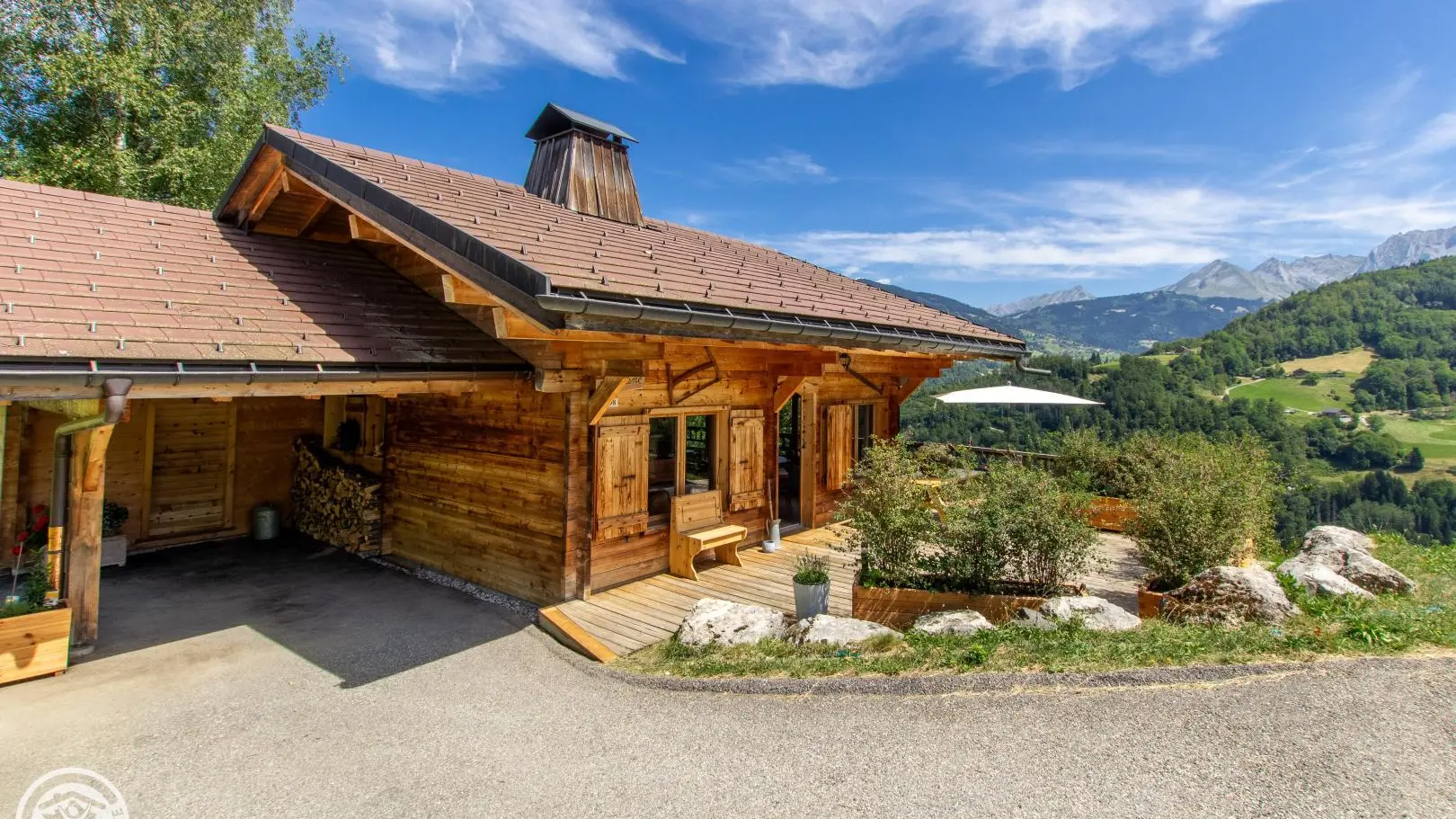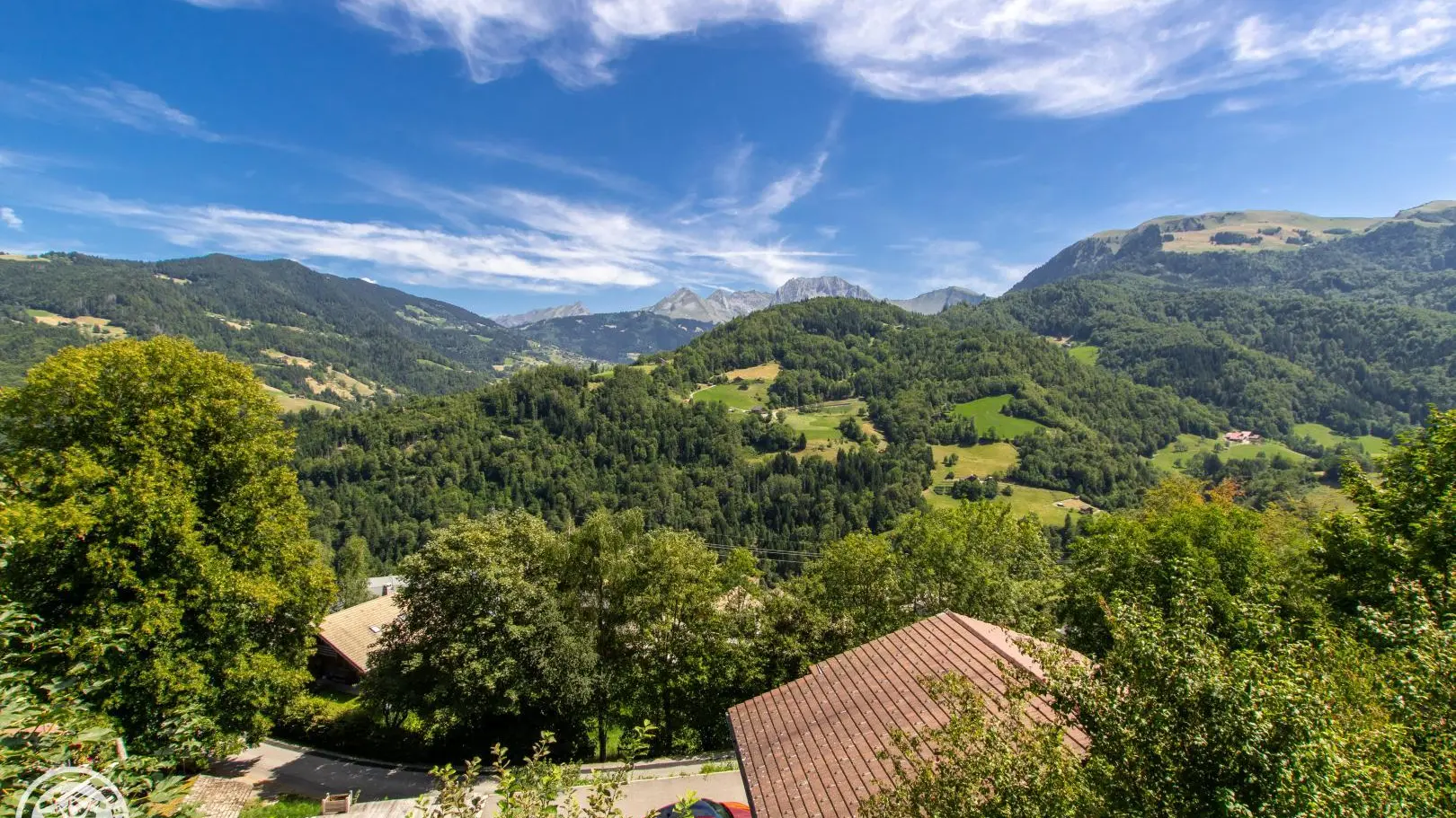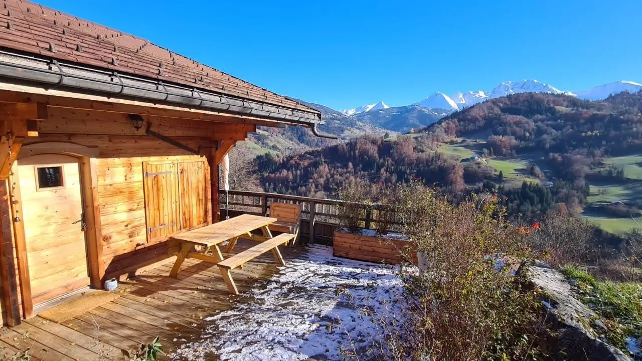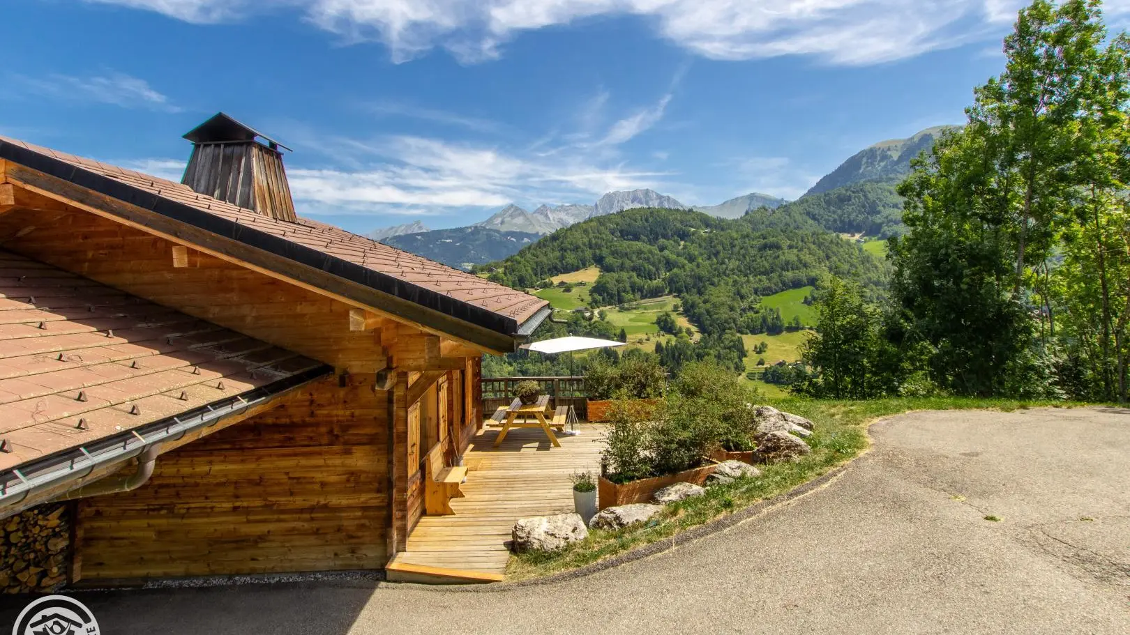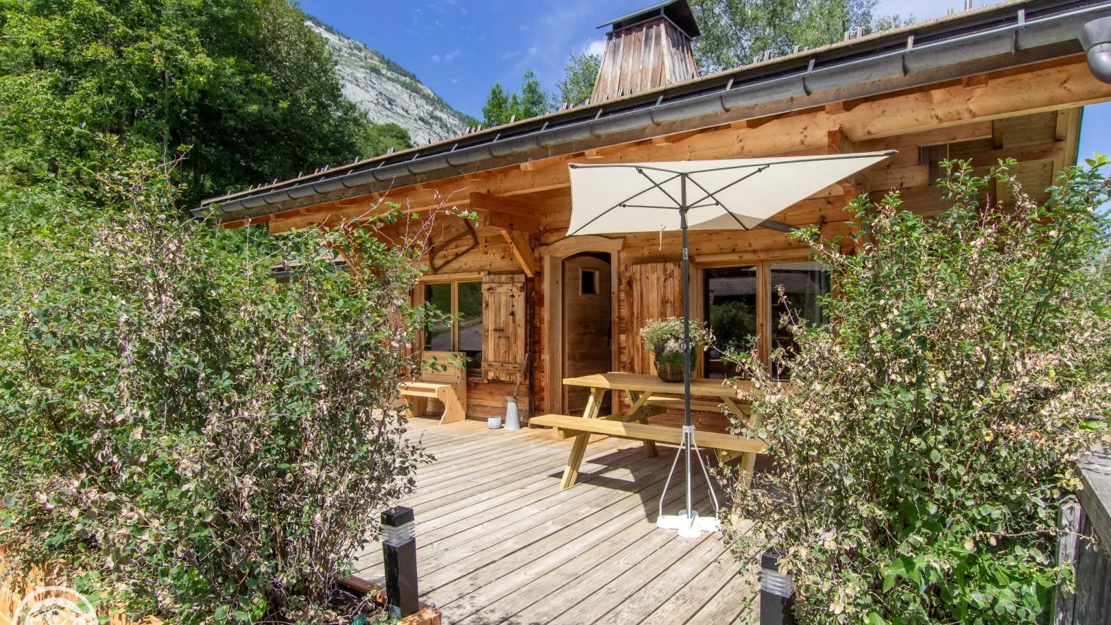 Terrasse orientée Sud et balcon Est offrant une magnifique vue sur les montagnes. Mobilier de jardin (table forestière), parasol.