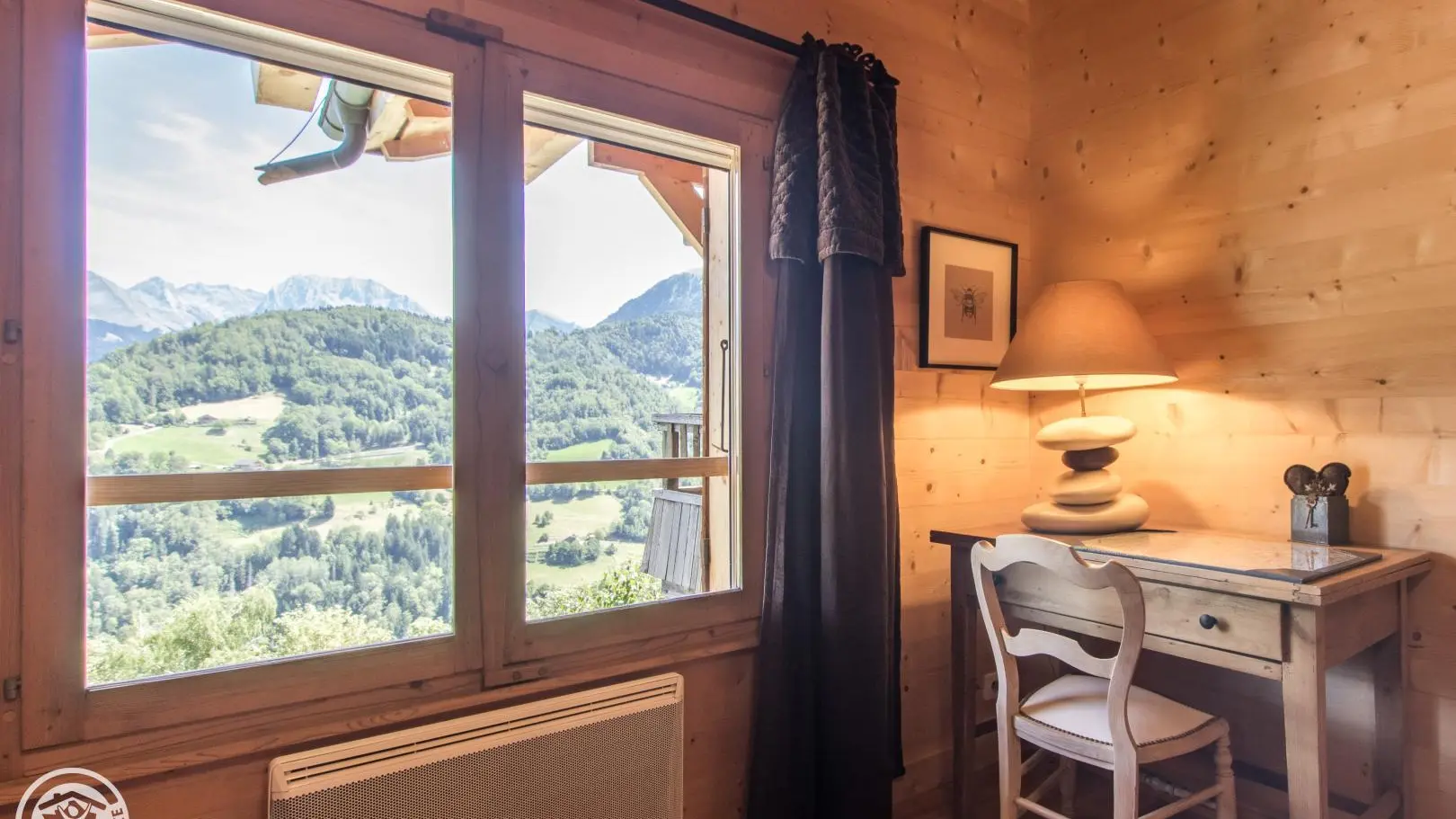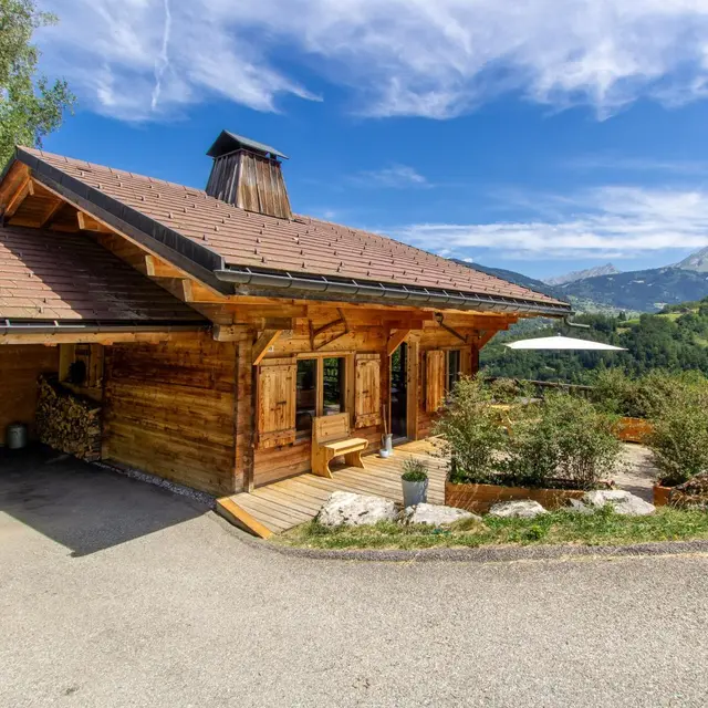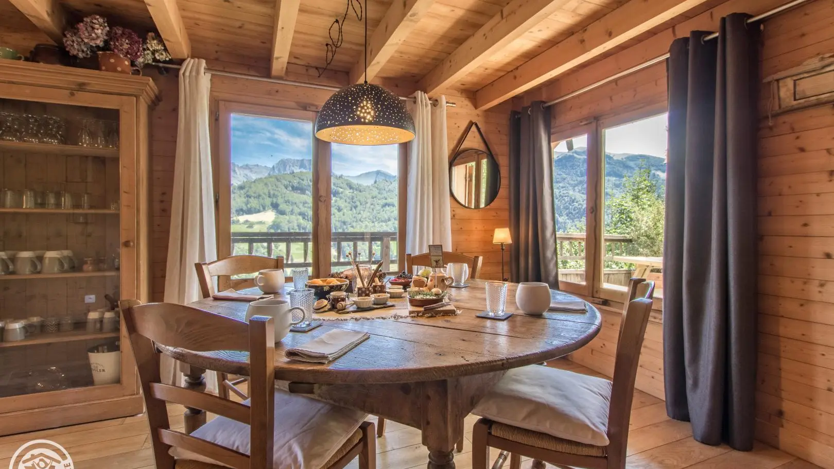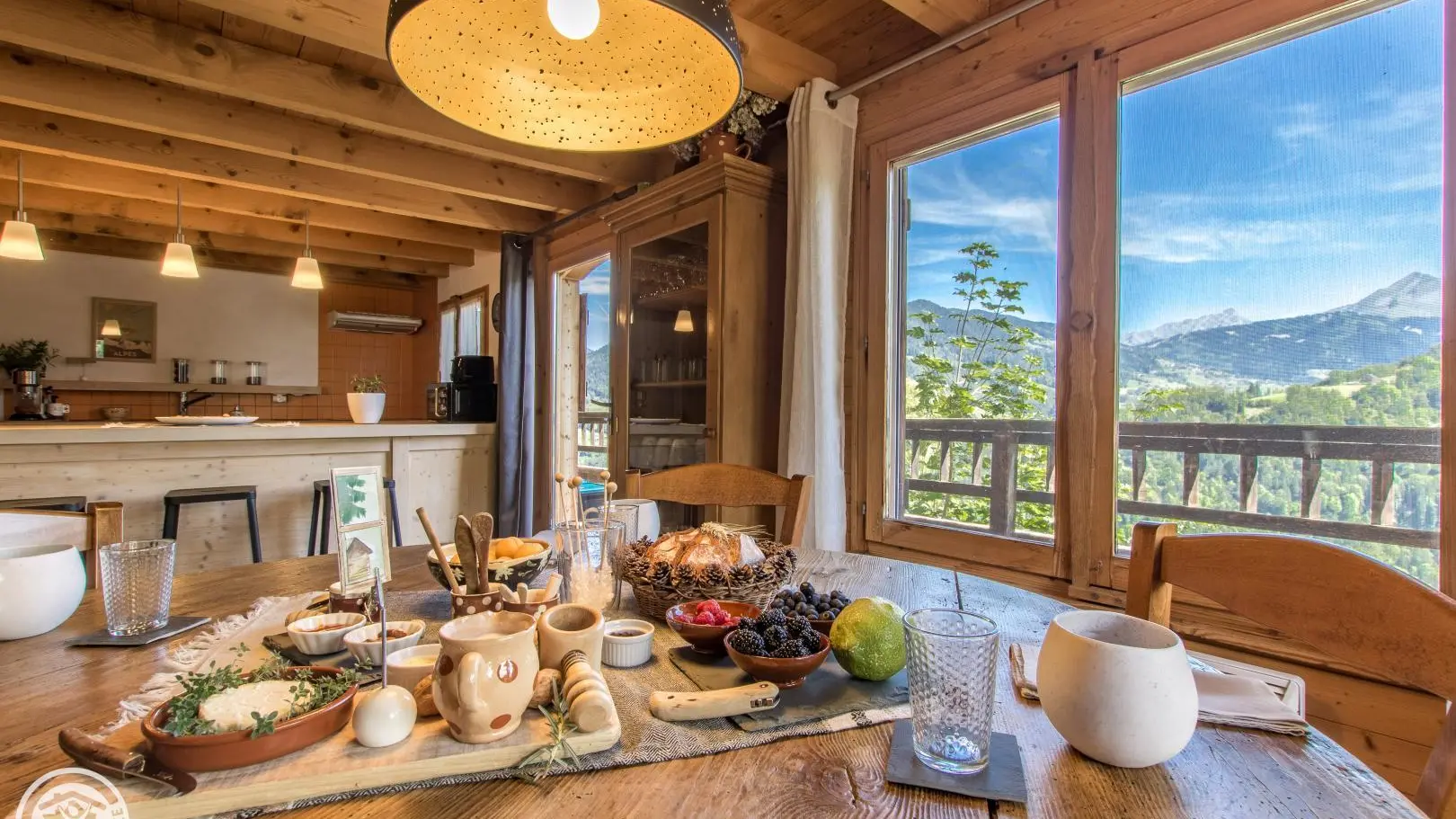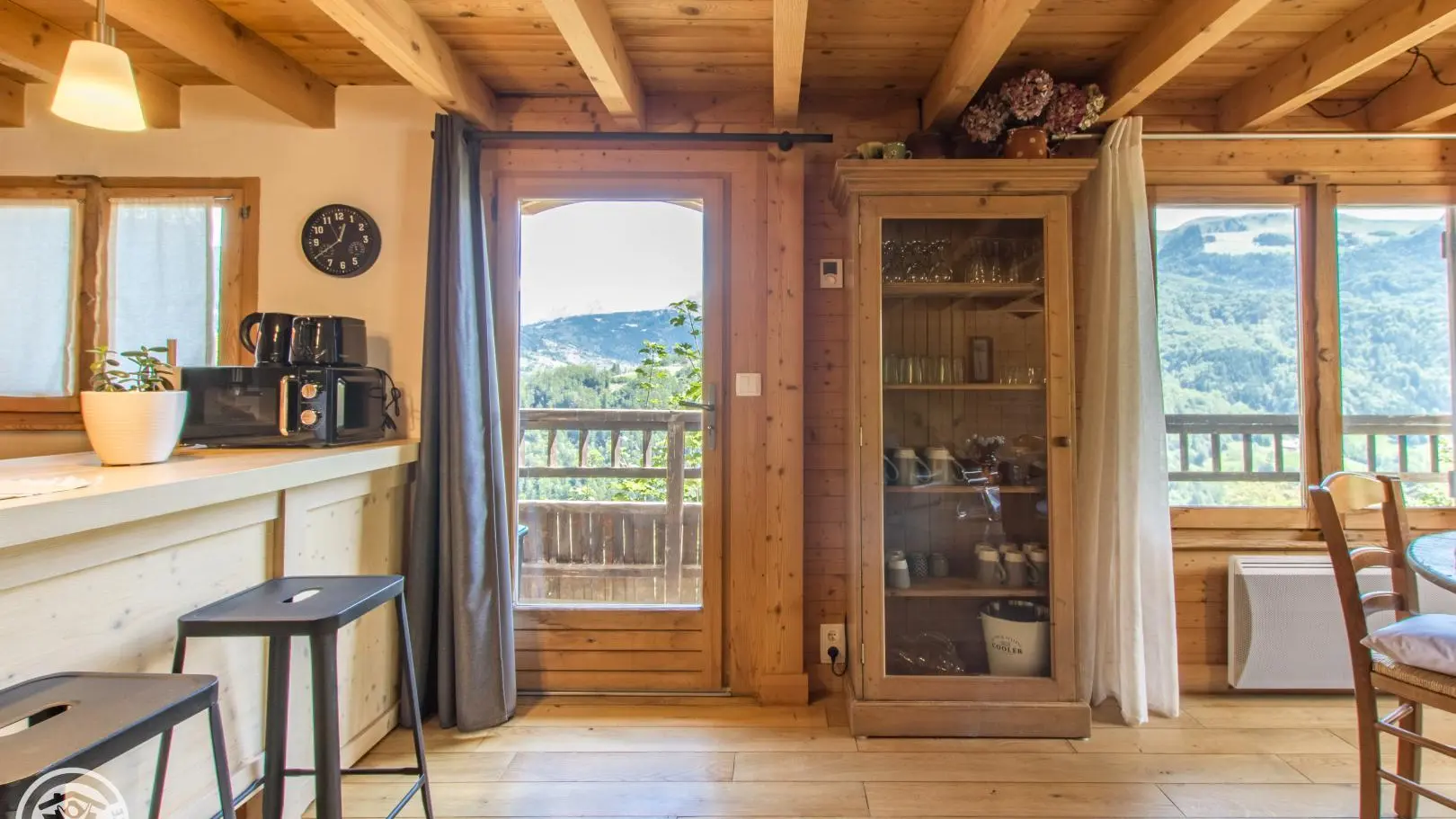 Terrasse orientée Sud et balcon Est offrant une magnifique vue sur les montagnes. Mobilier de jardin (table forestière), parasol.