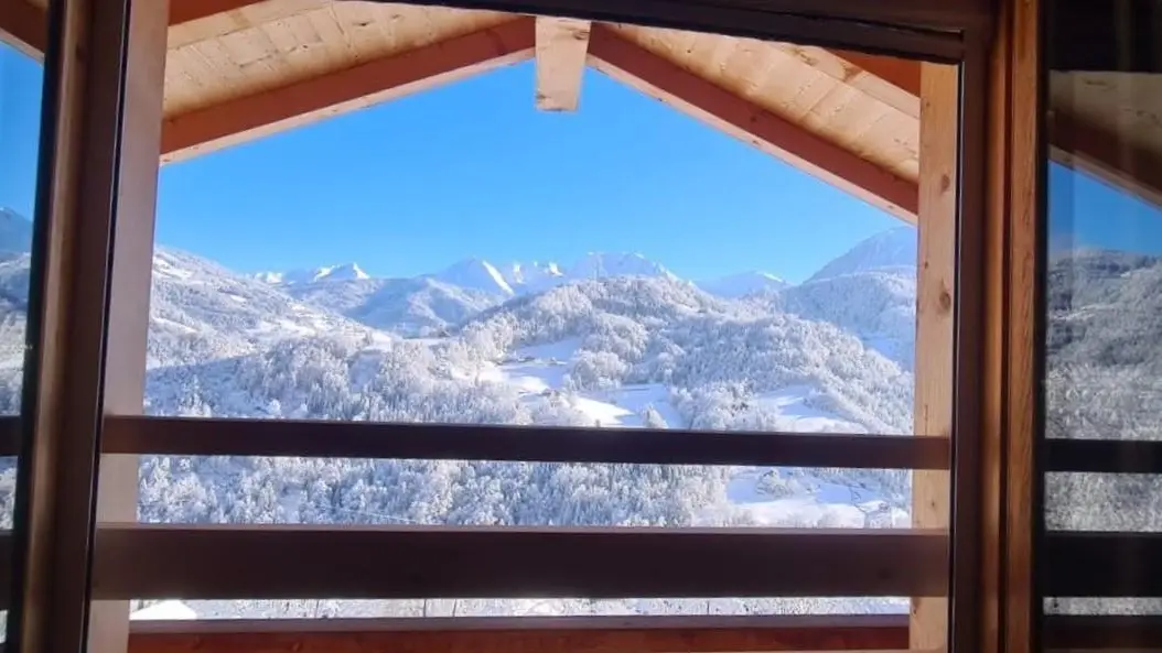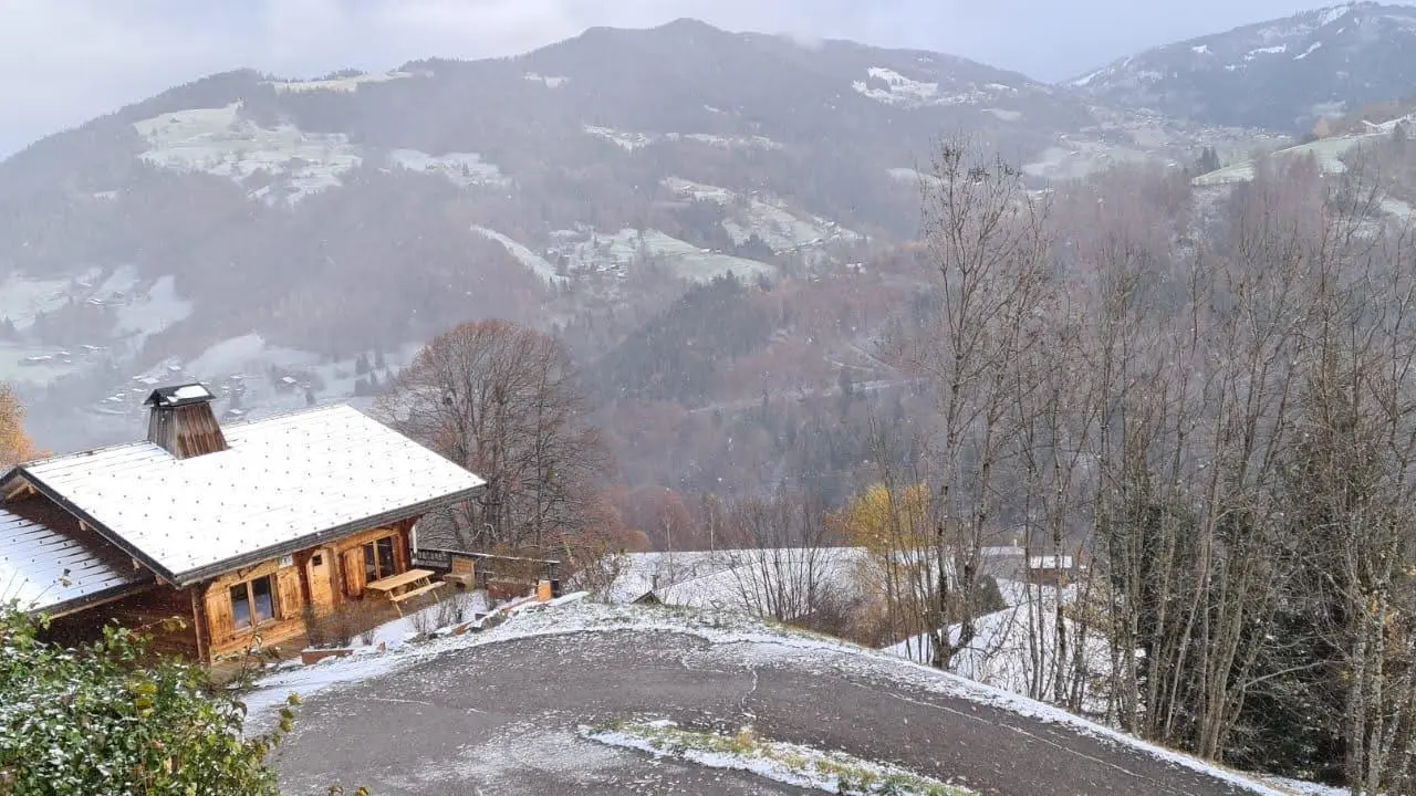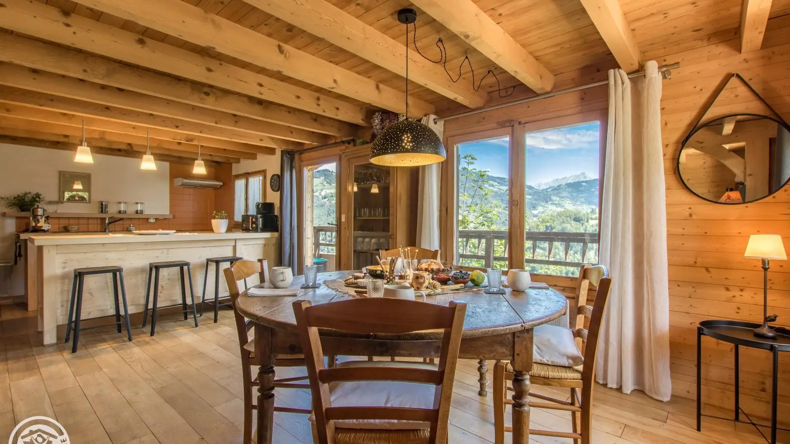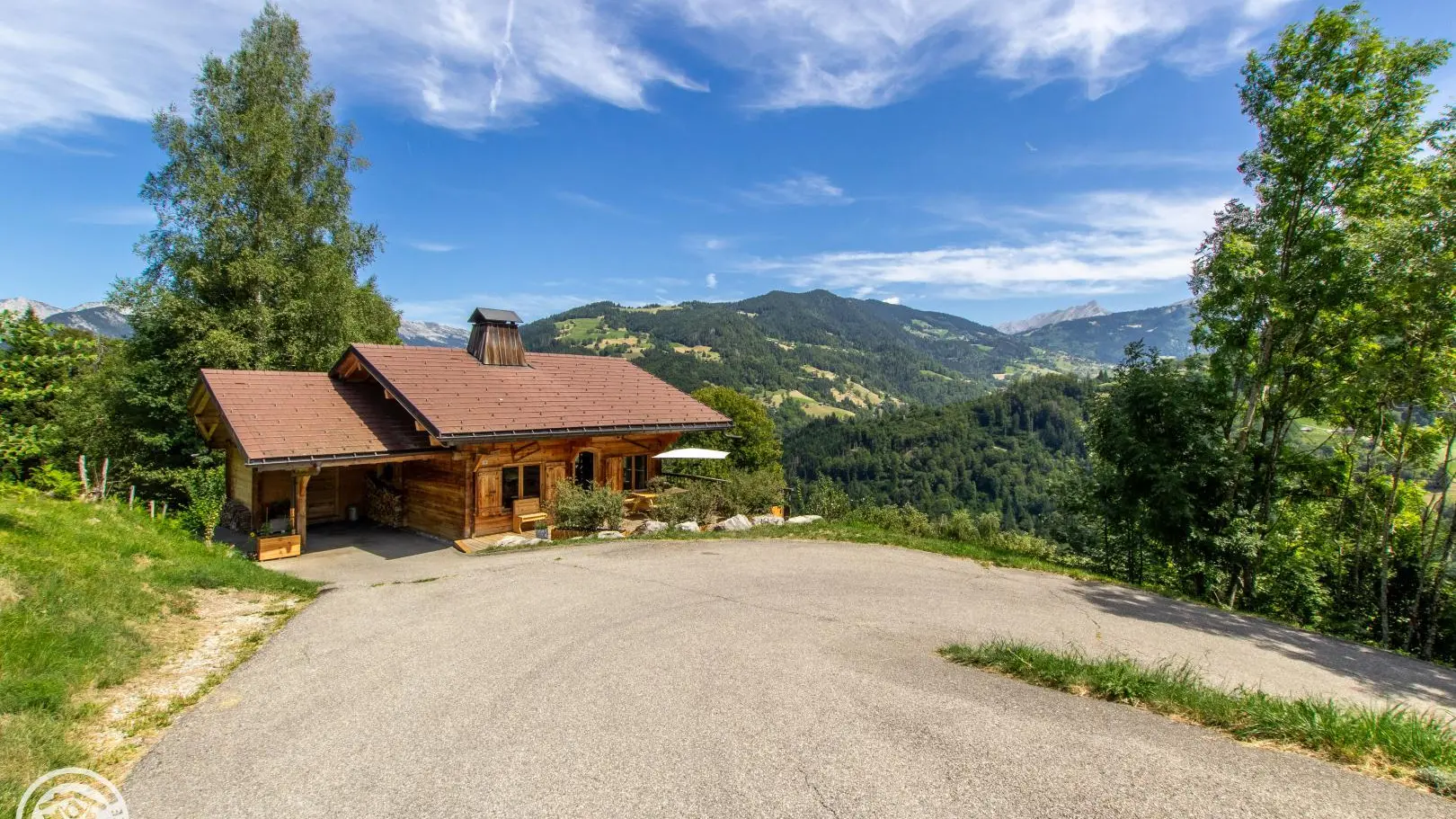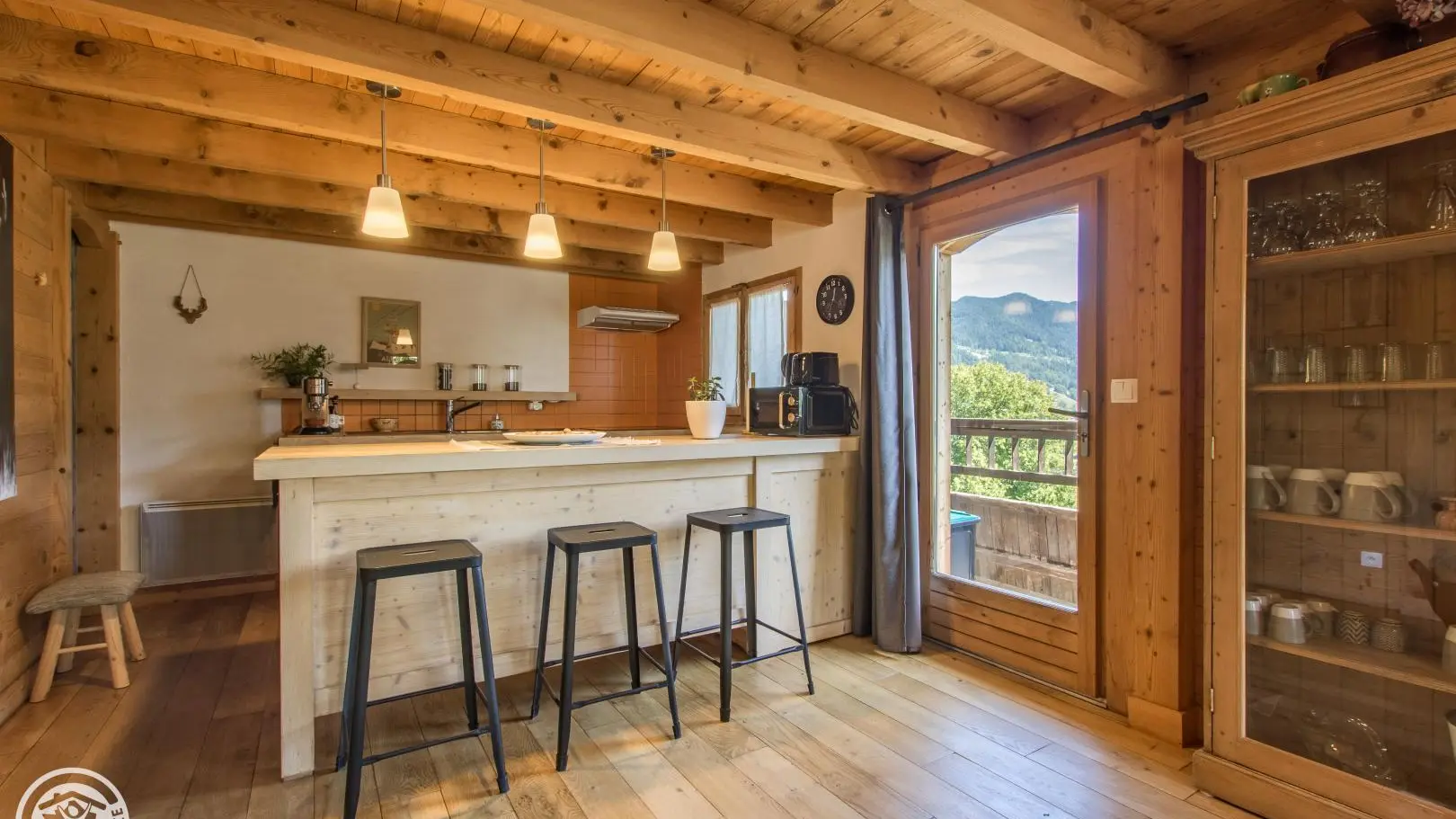 Terrasse orientée Sud et balcon Est offrant une magnifique vue sur les montagnes. Mobilier de jardin (table forestière), parasol.