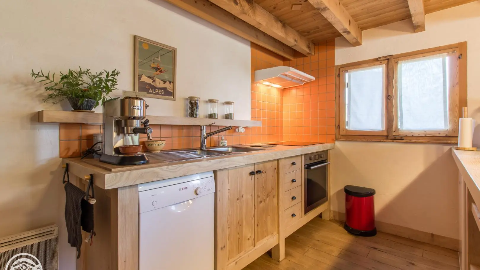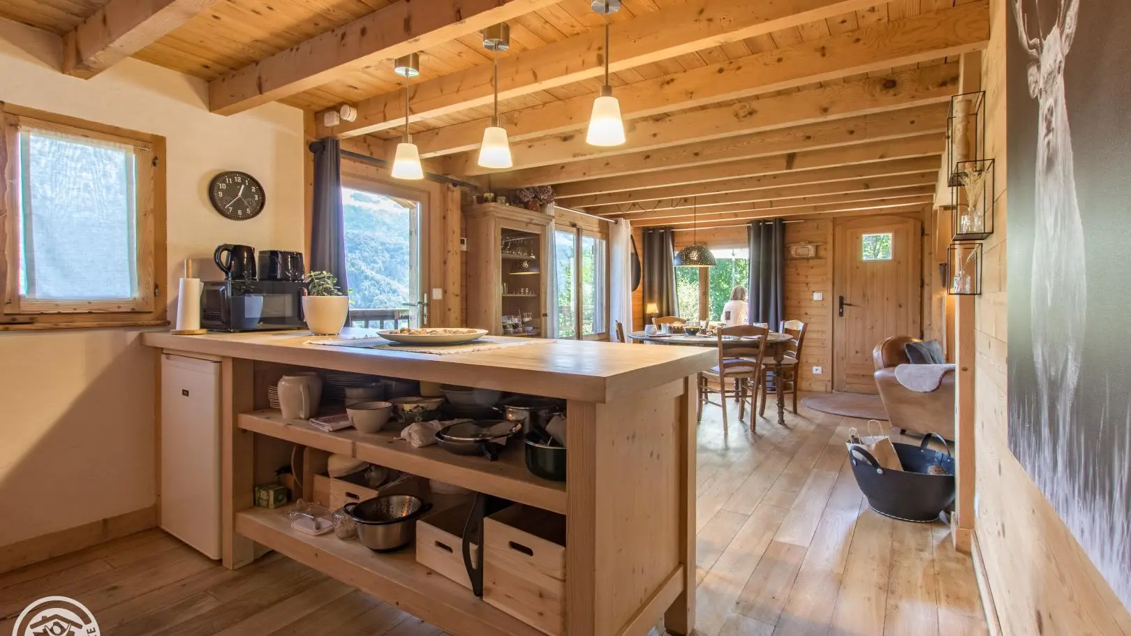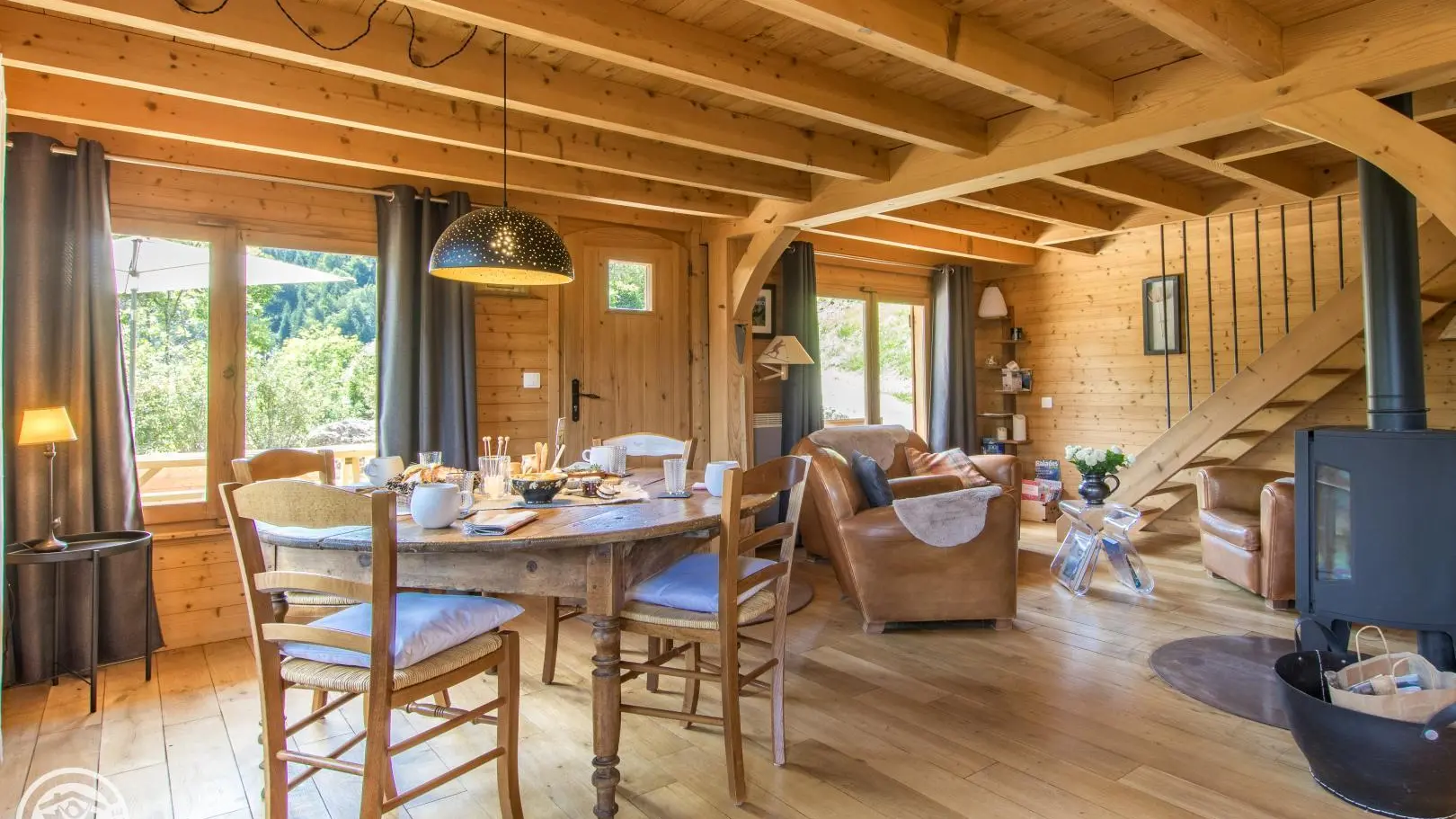 Rez-de-chaussée : cuisine équipée ouverte sur l'espace repas et le séjour (poêle à bois avec bois fourni, canapé, fauteuils, télévision, table repas). Chambre 1 (1 lit 160x200cm, bureau). Salle d'eau vasque sur meuble, douche, sèche-serviettes, lave-linge). 1 wc indépendant.