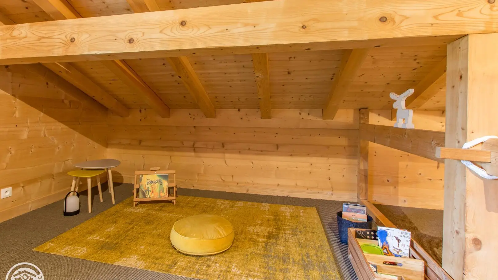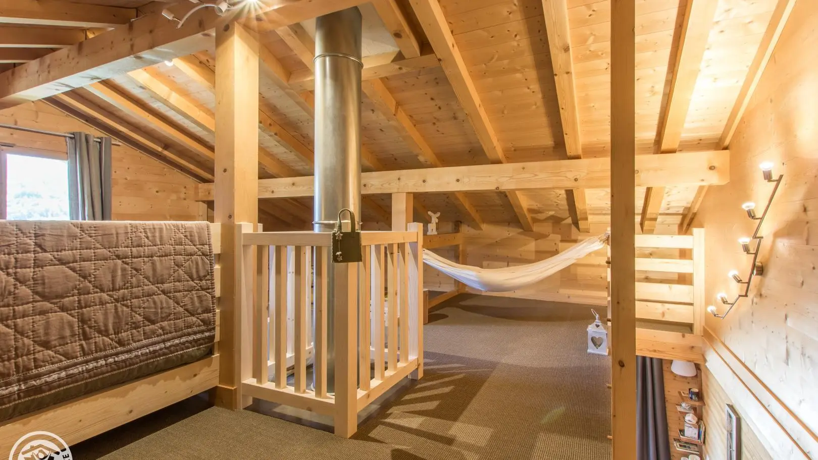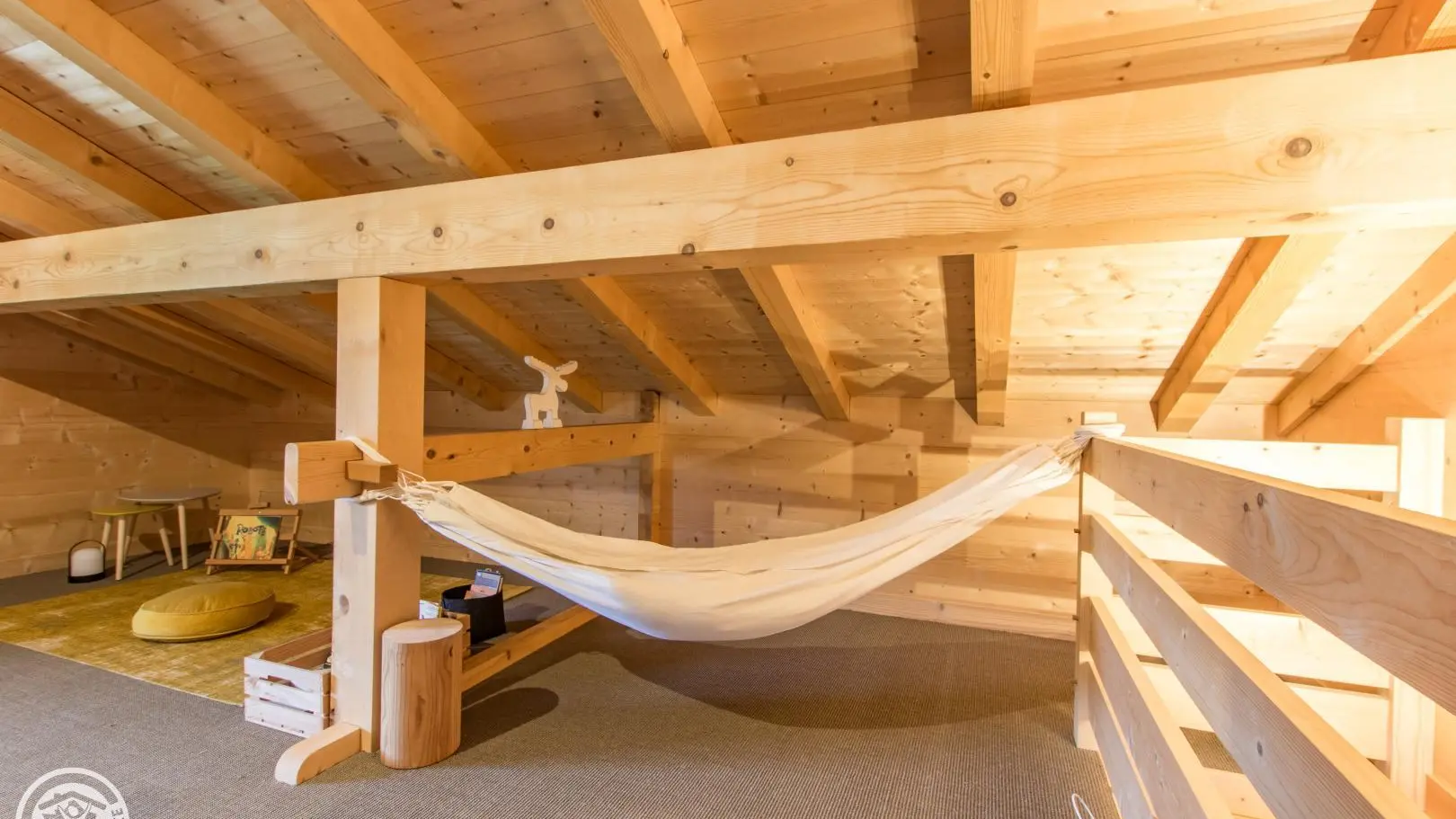 A l'étage : chambre 2 en mezzanine avec 1 lit 180x190cm séparable en 2 lits 90cm sur demande + 1 lit 80x200cm, jeux enfants, hamac. Lit bébé
