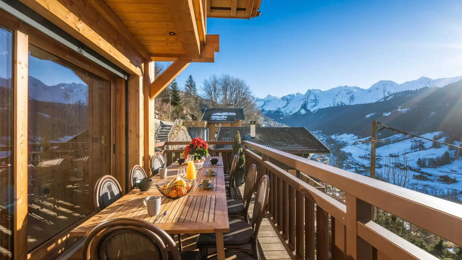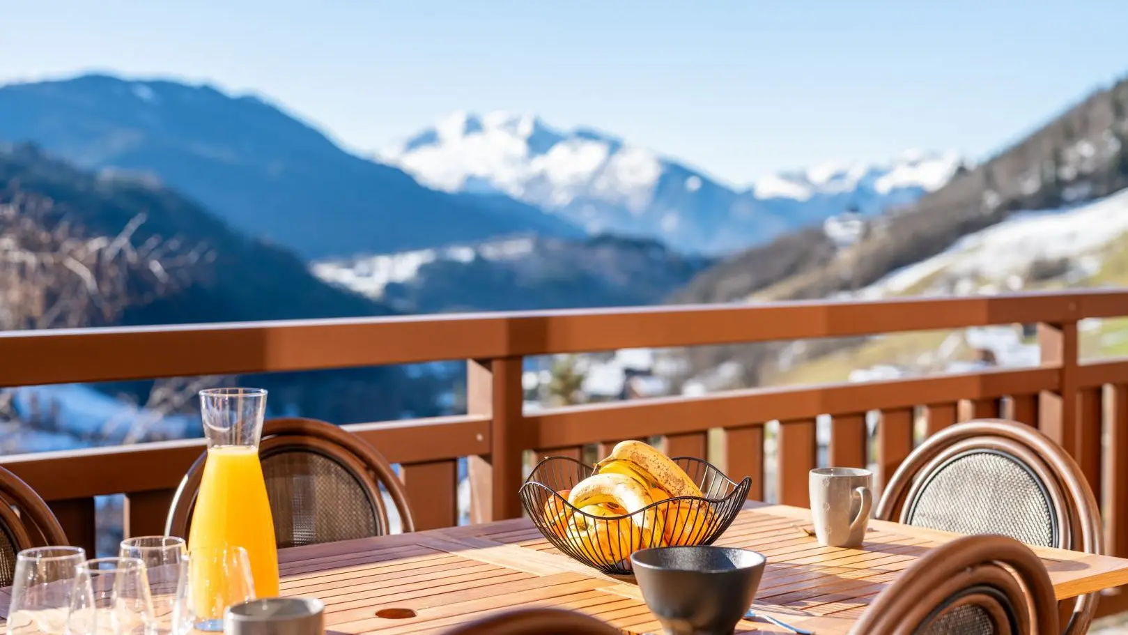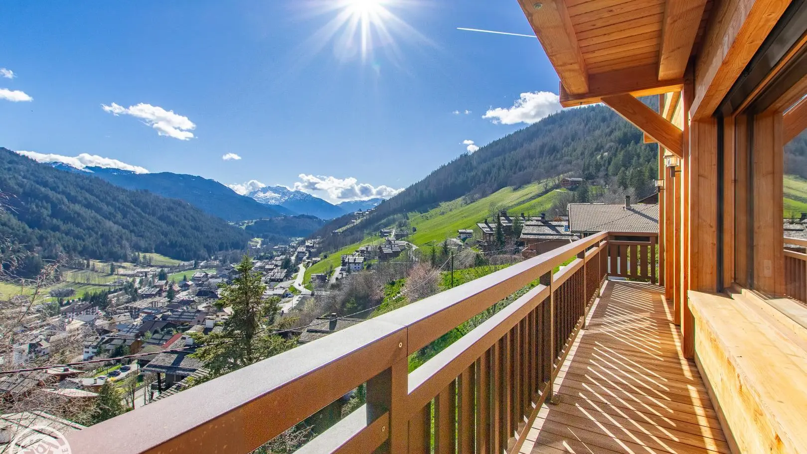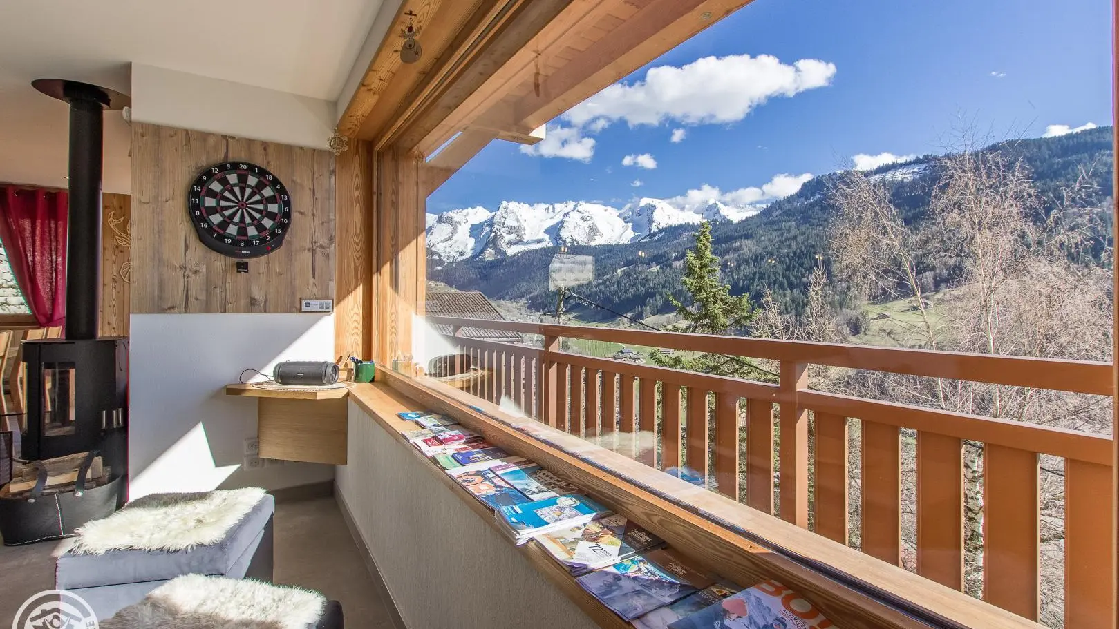3 balcons orientés sud offrant un superbe panorama sur les montagnes et le village. Salon de jardin, transats, parasol, plancha. Table ping-pong.