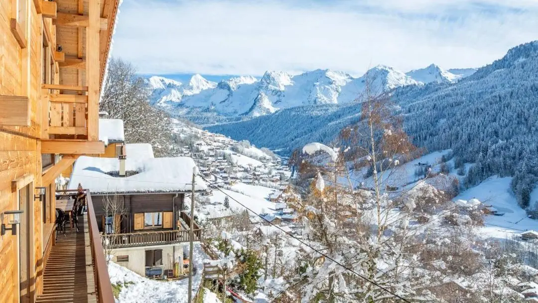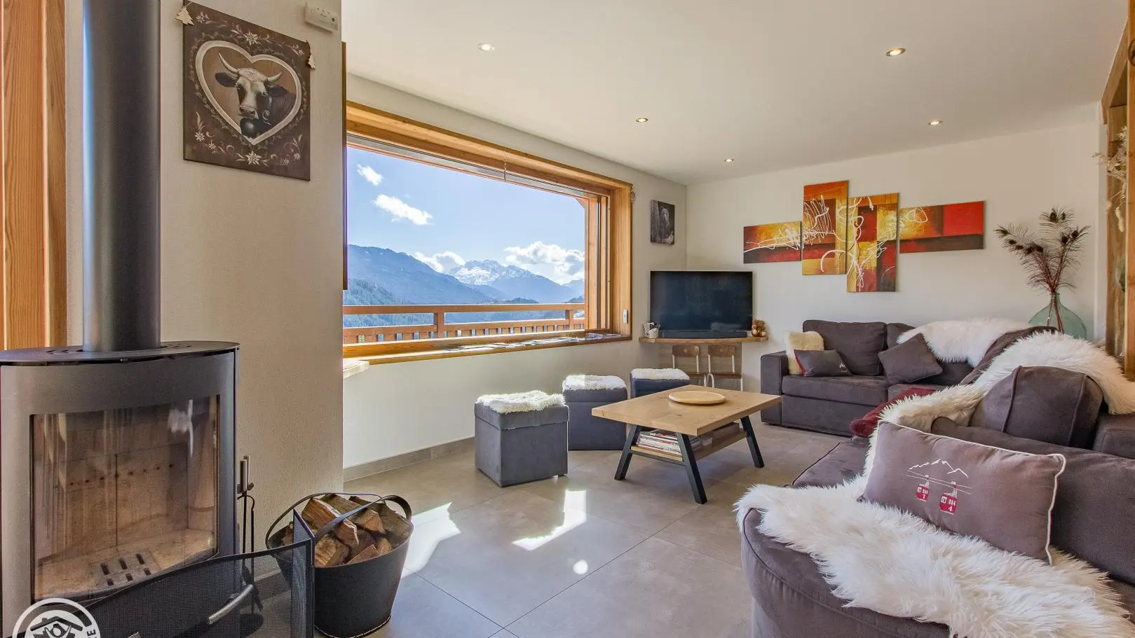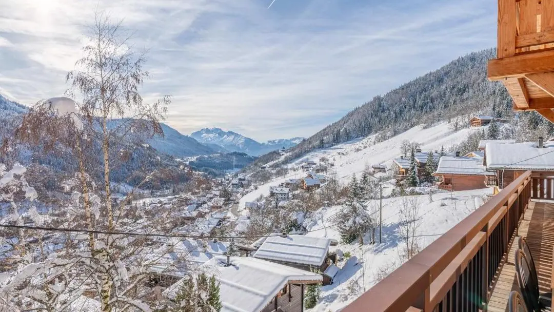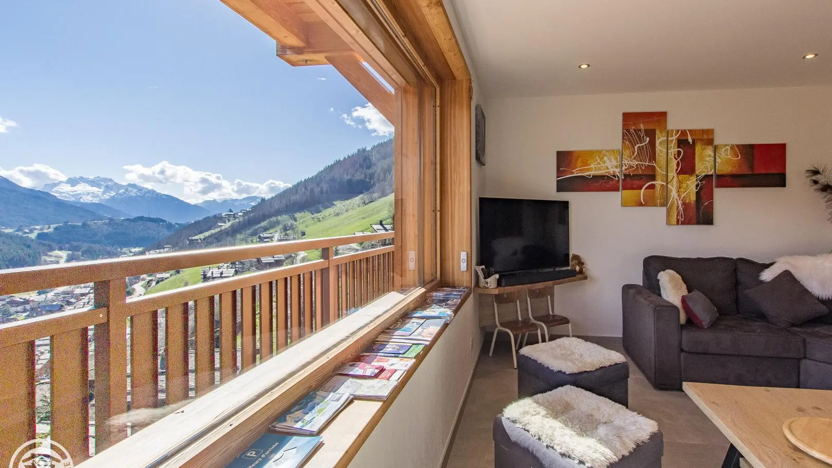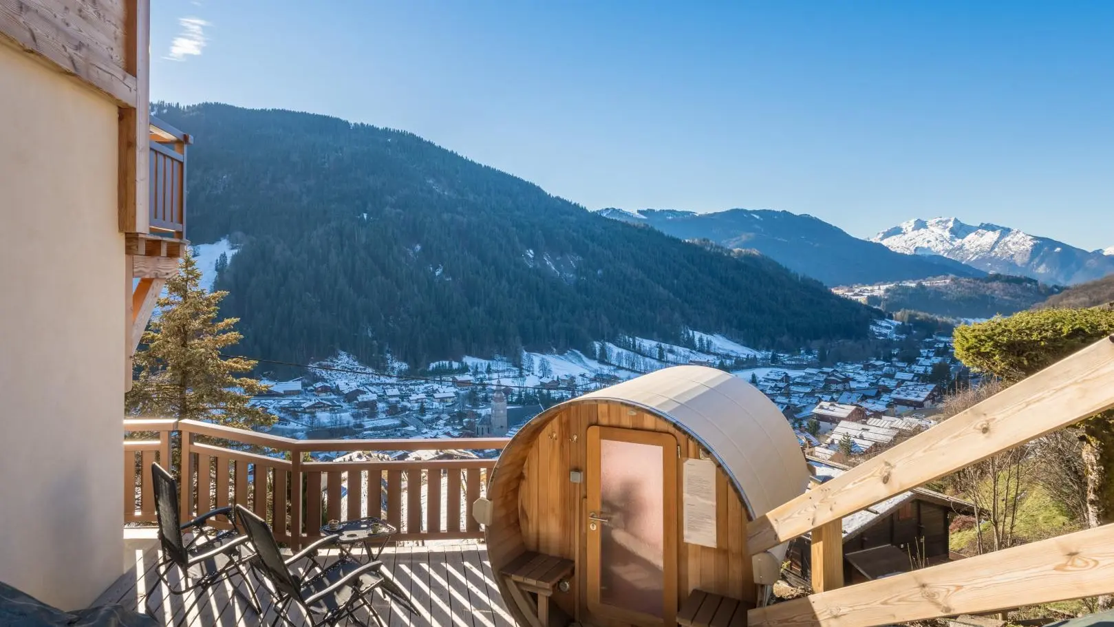 3 balcons orientés sud offrant un superbe panorama sur les montagnes et le village. Salon de jardin, transats, parasol, plancha. Table ping-pong.