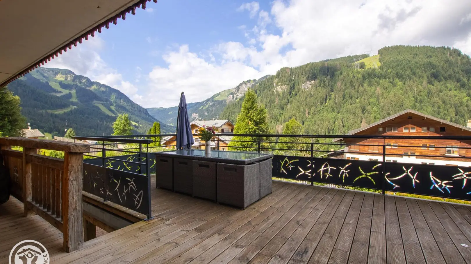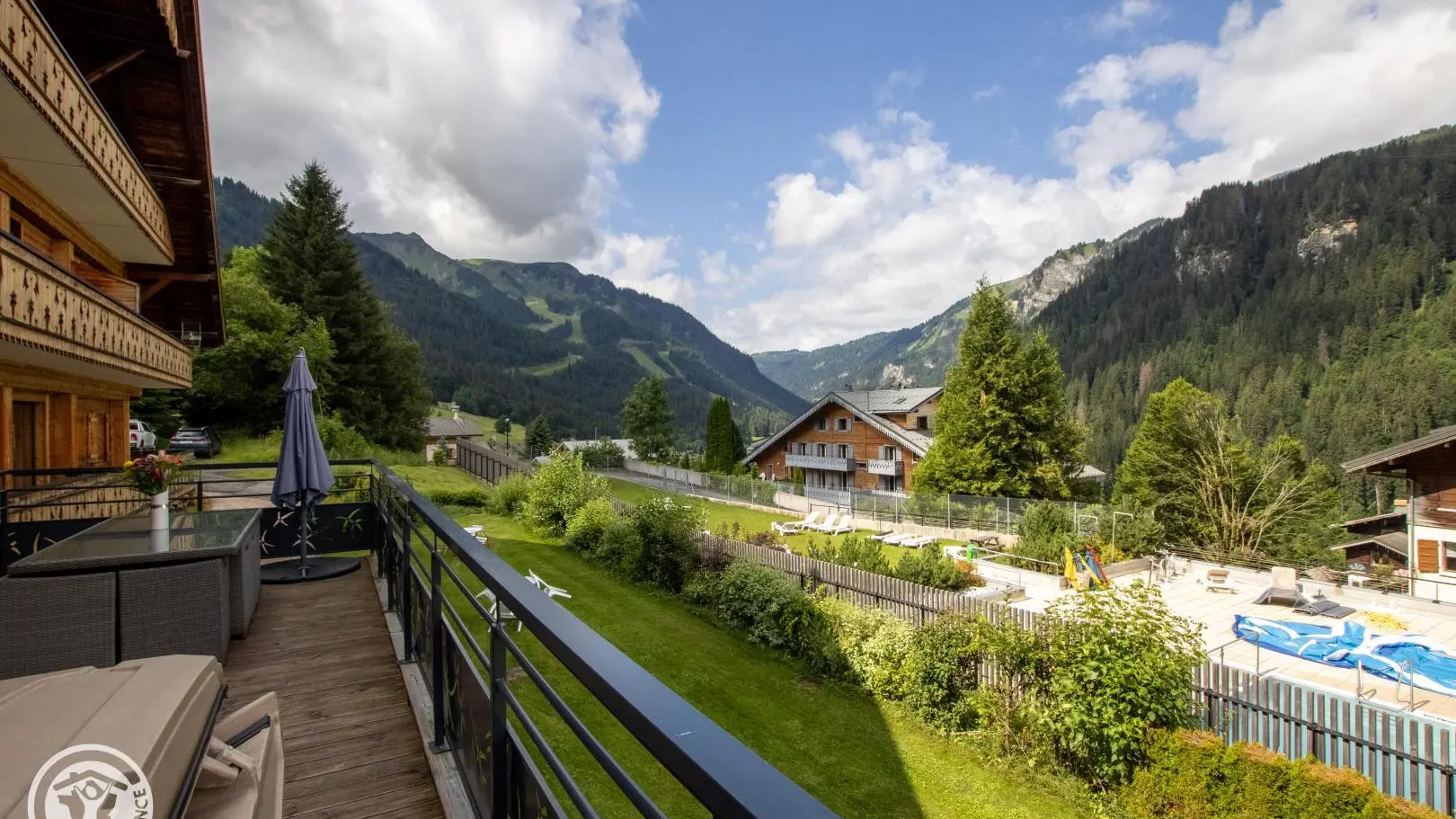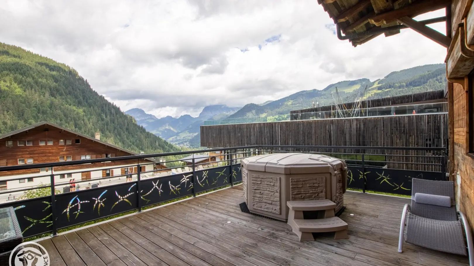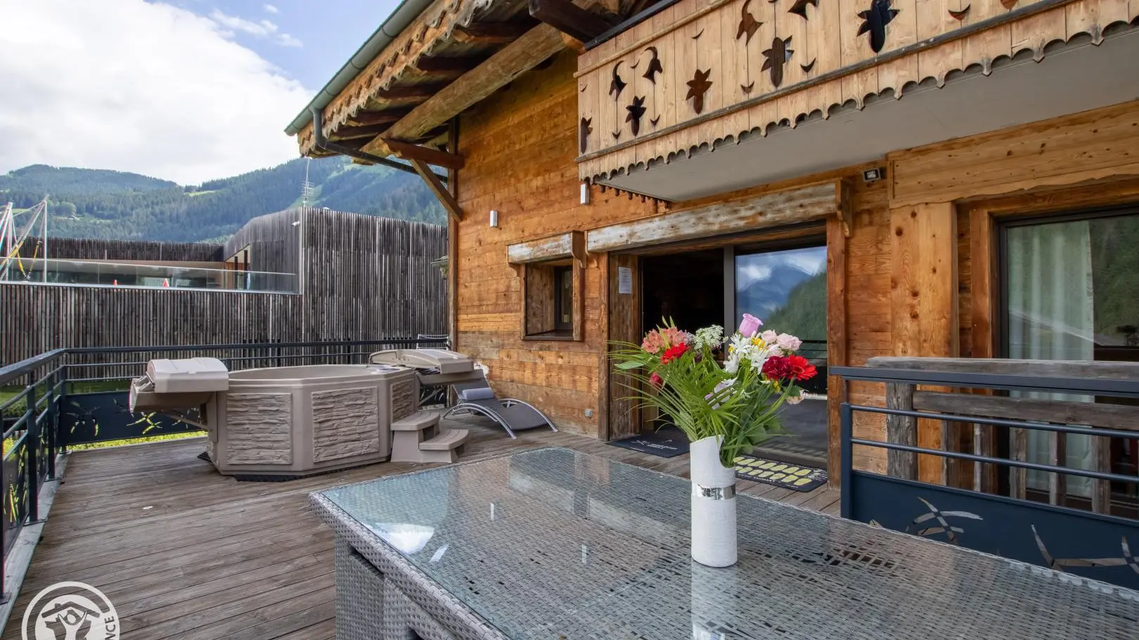 Terrasse - balcon (donne côté piscine - centre aquatique de Chatel) avec mobilier de jardin, spa privatif. Sur la partie basse du chalet, jardin et terrain communs. Places de parking privative dans la cour devant le chalet.