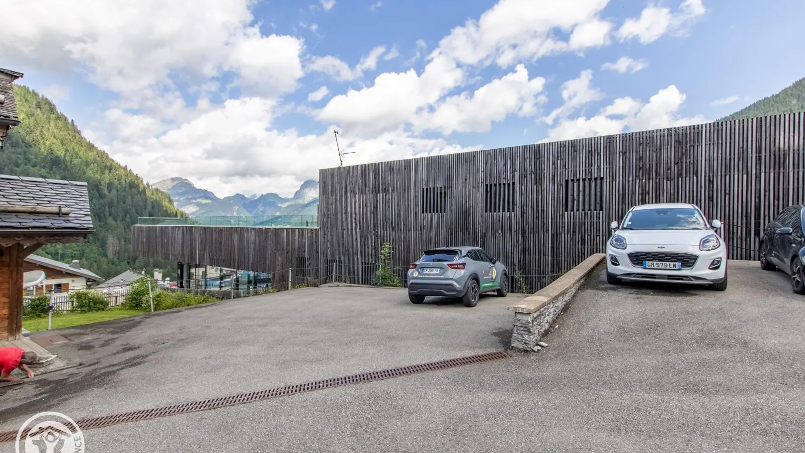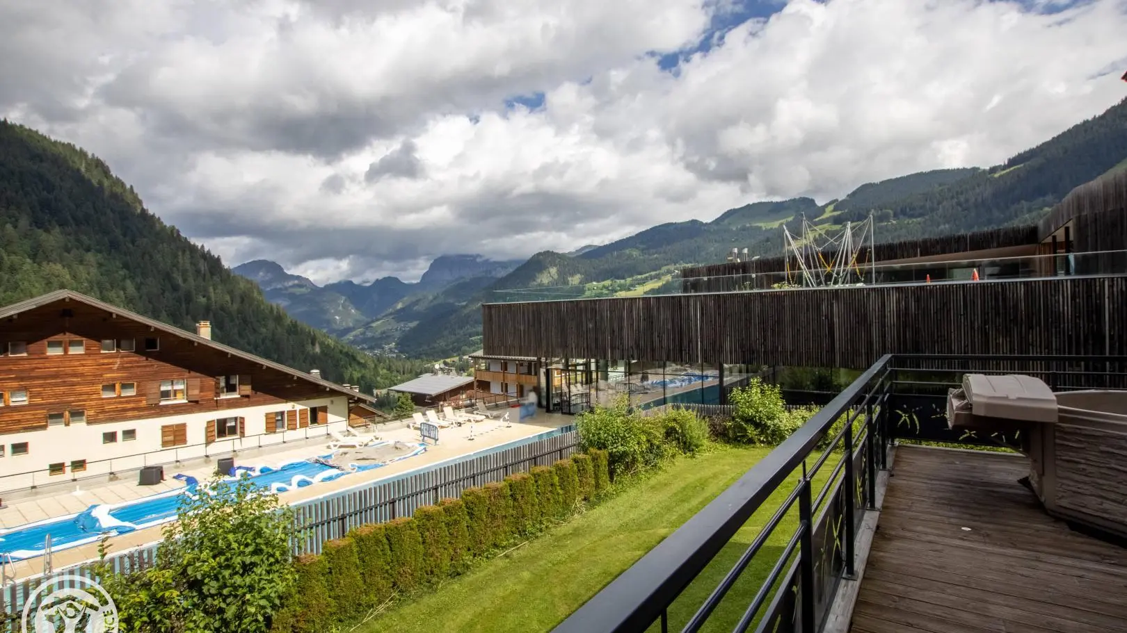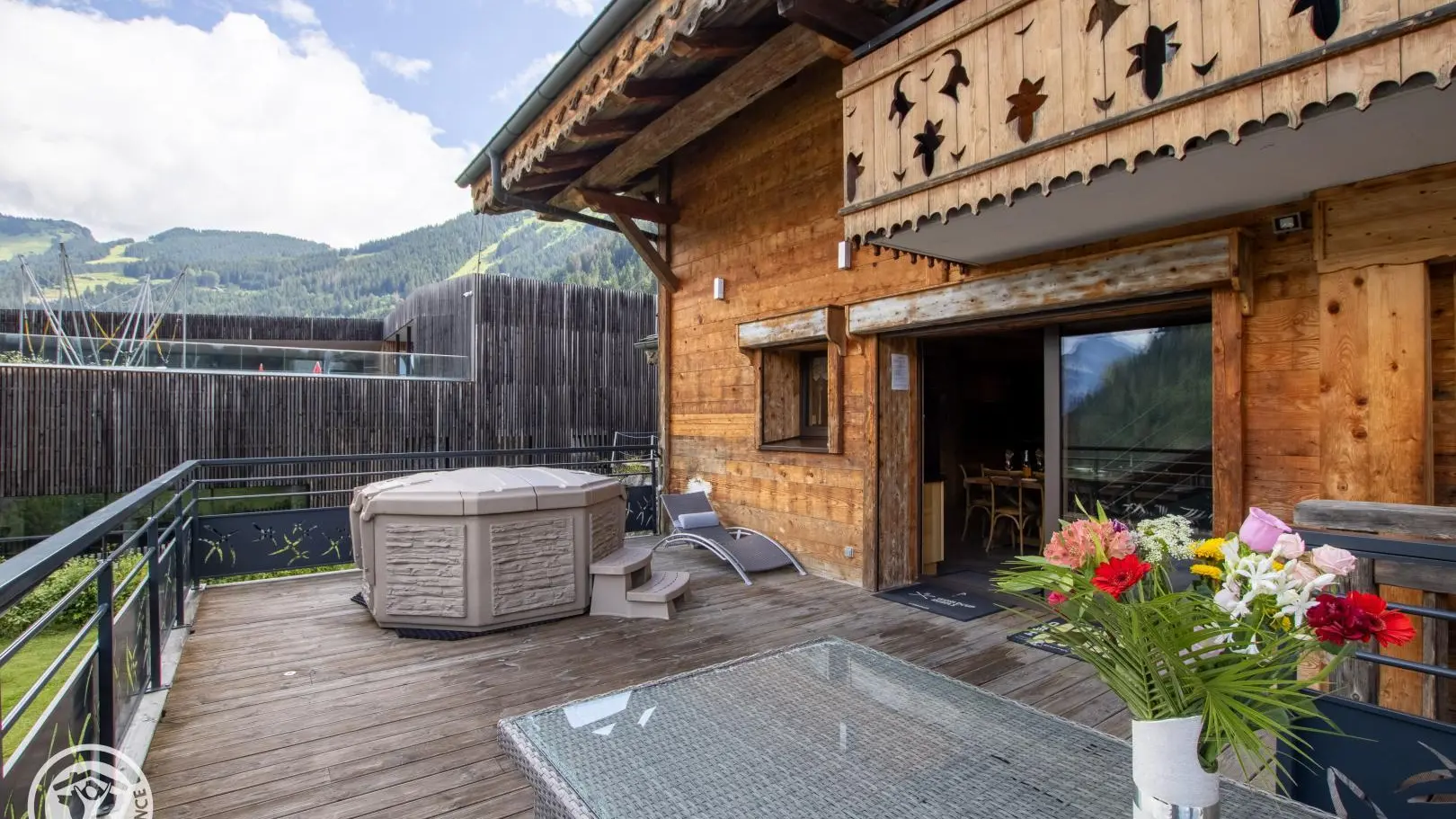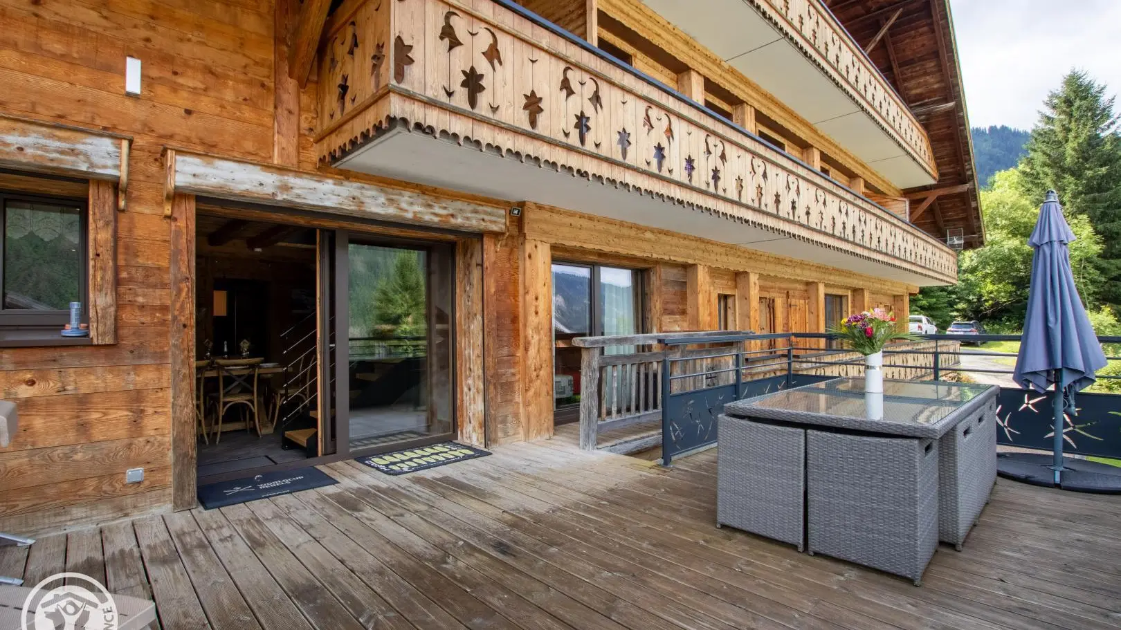 Terrasse - balcon (donne côté piscine - centre aquatique de Chatel) avec mobilier de jardin, spa privatif. Sur la partie basse du chalet, jardin et terrain communs. Places de parking privative dans la cour devant le chalet.