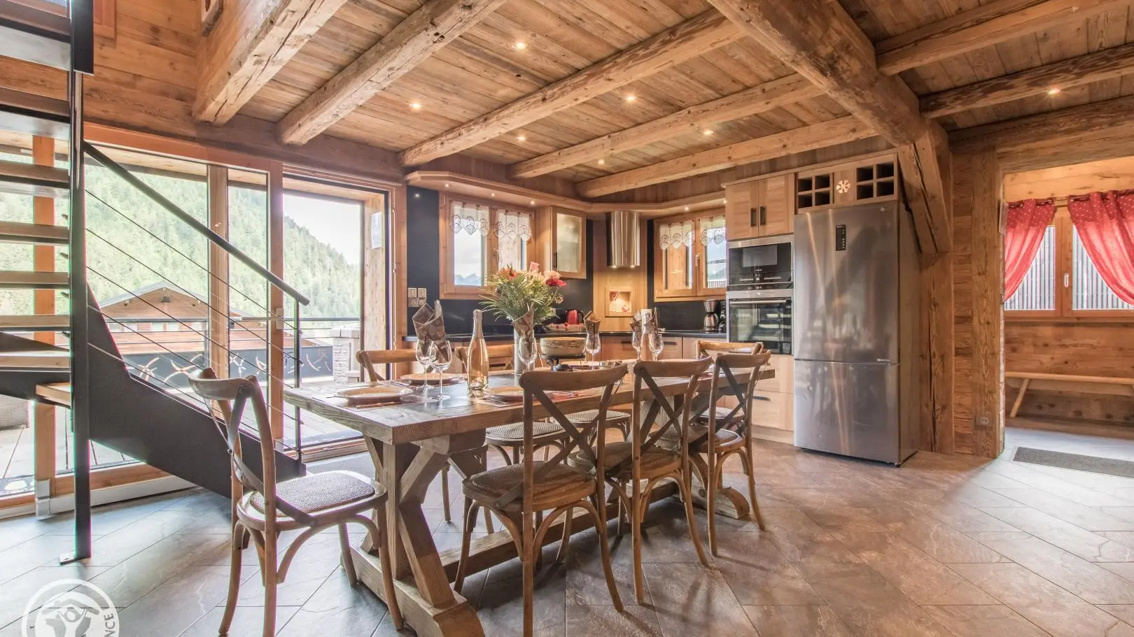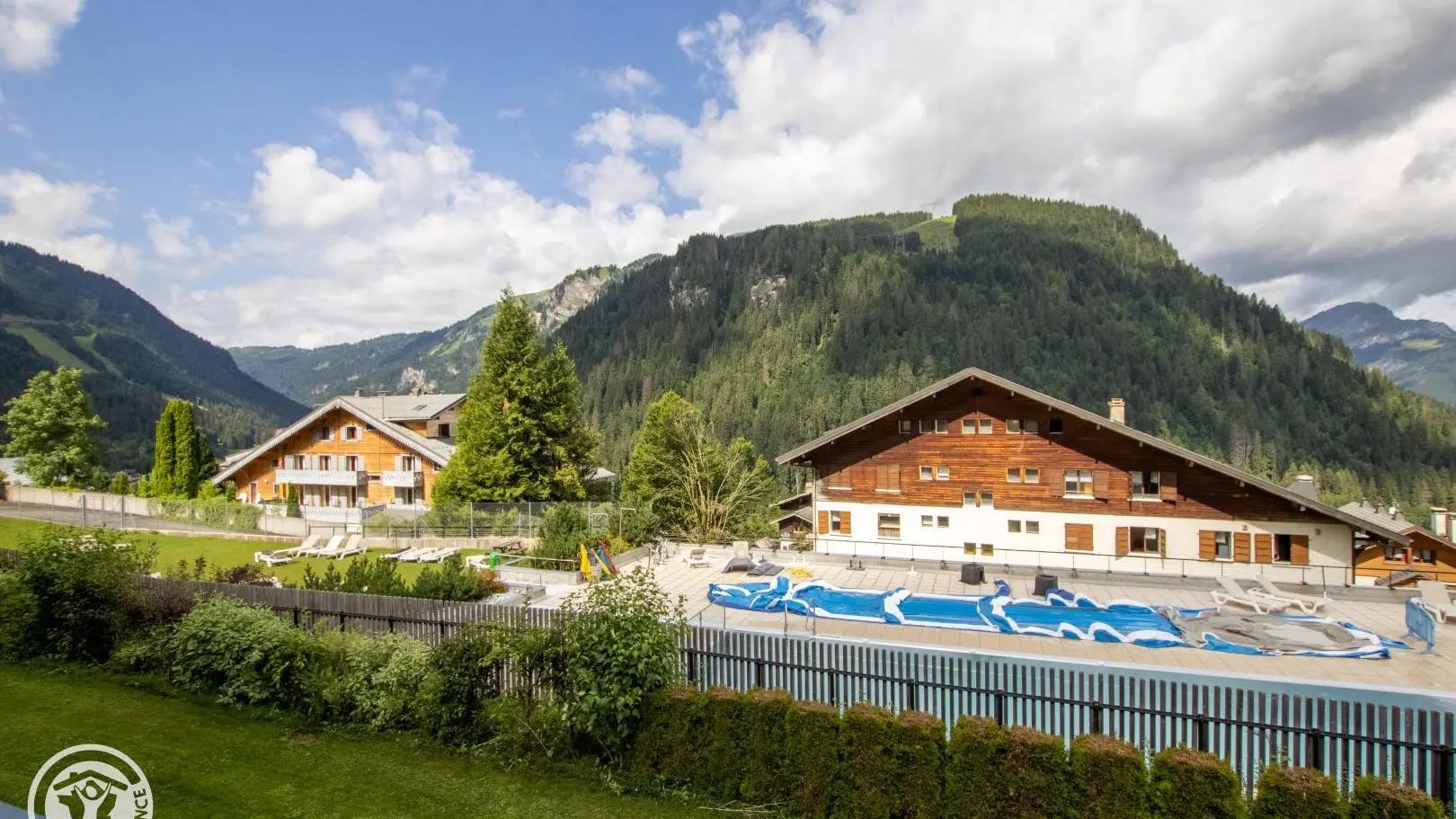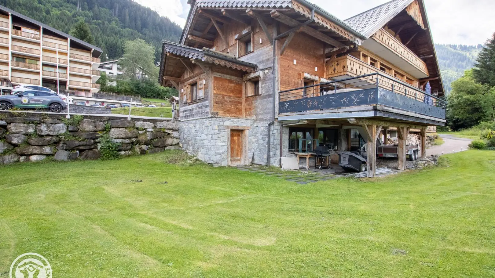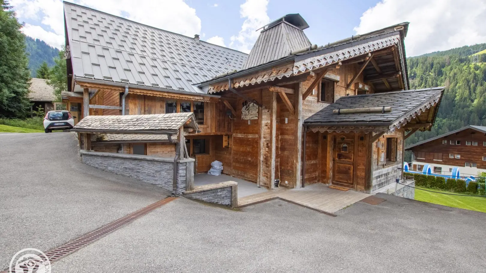 Terrasse - balcon (donne côté piscine - centre aquatique de Chatel) avec mobilier de jardin, spa privatif. Sur la partie basse du chalet, jardin et terrain communs. Places de parking privative dans la cour devant le chalet.