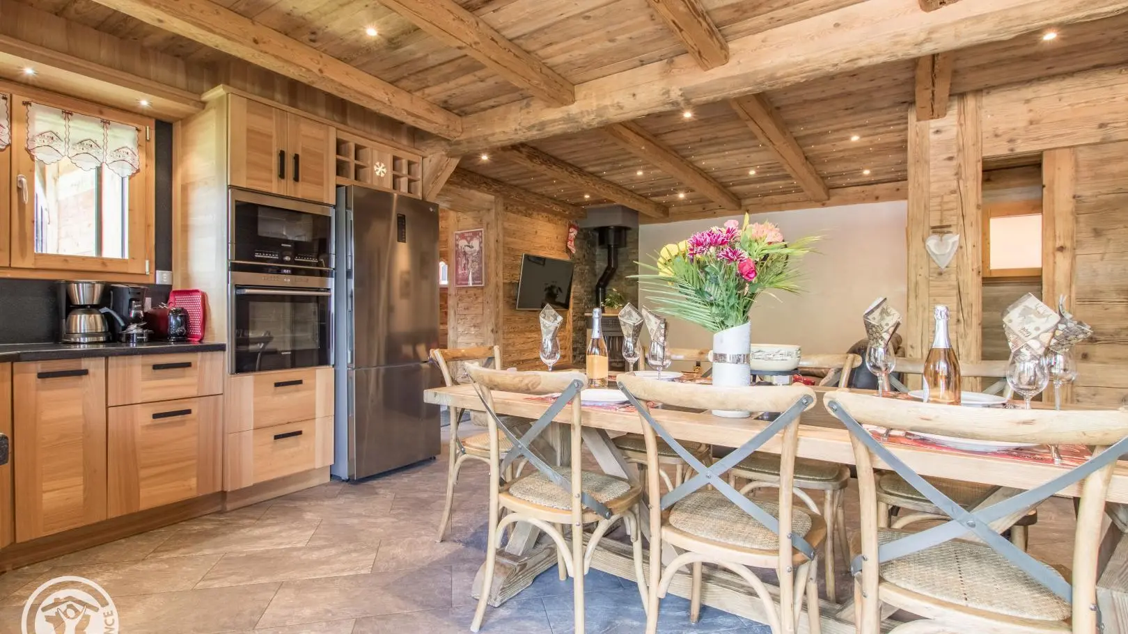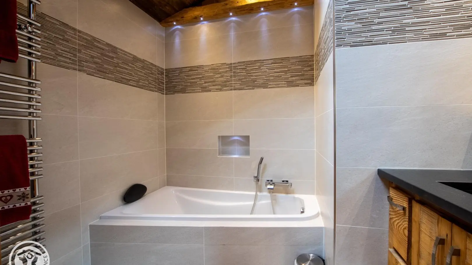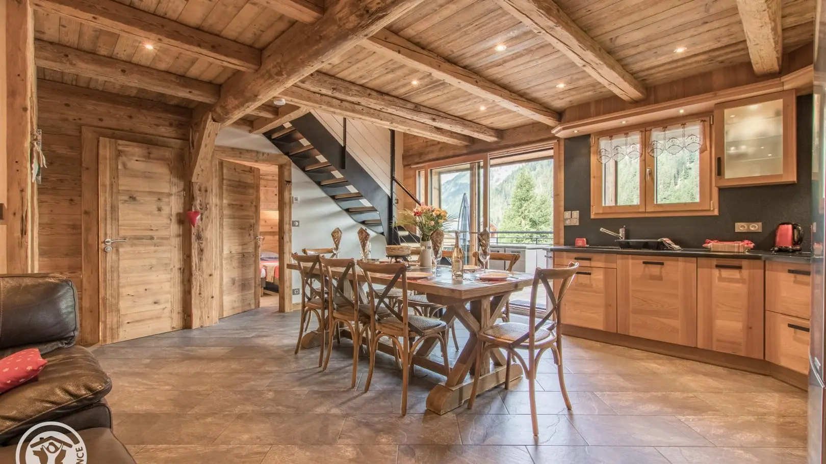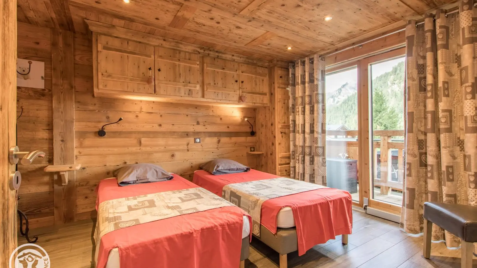 Terrasse - balcon (donne côté piscine - centre aquatique de Chatel) avec mobilier de jardin, spa privatif. Sur la partie basse du chalet, jardin et terrain communs. Places de parking privative dans la cour devant le chalet.