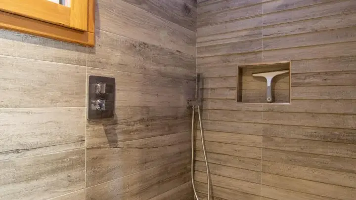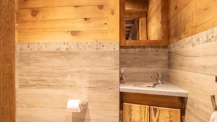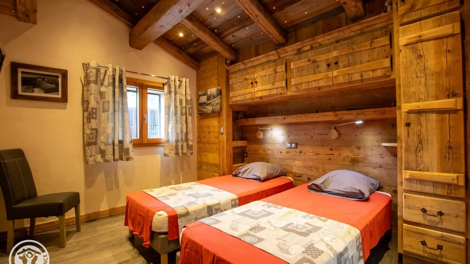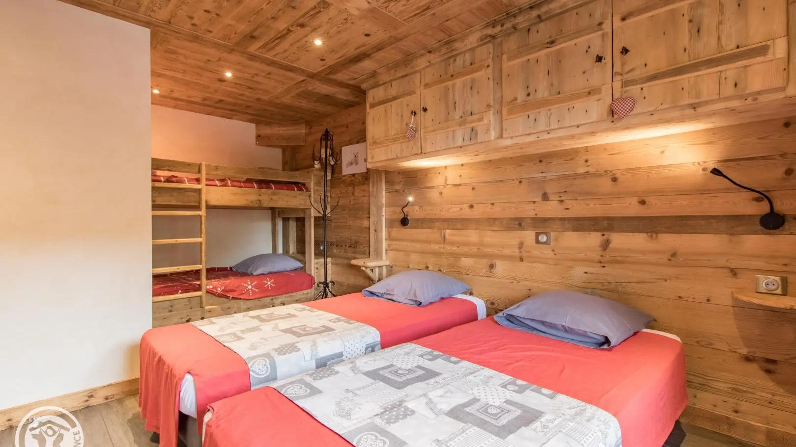 Rez-de-chaussée : hall d'entrée avec rangements, cuisine ouverte sur le séjour : table repas, canapé d'angle, télévision, poêle à granulés (bois fourni), accès à la terrasse. Chambre 1 (2 lits 90x200cm rapprochables et 2 lits 90x190cm superposés, accès balcon), salle d'eau (vasque, douche italienne), 1 wc indépendant.