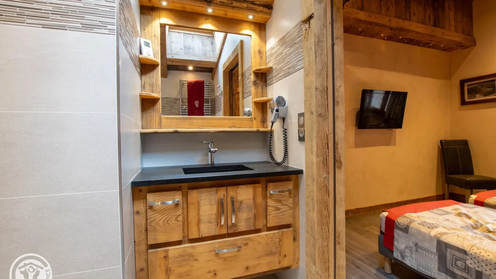 Etage : chambre 2 (1 lit 160x200cm, télévision, fenêtre uniquement dans la salle d'eau avec vasque et douche), chambre 3 (2 lits 90x200cm rapprochables, télévision, salle de bains avec vasque et baignoire). 1 wc indépendant.